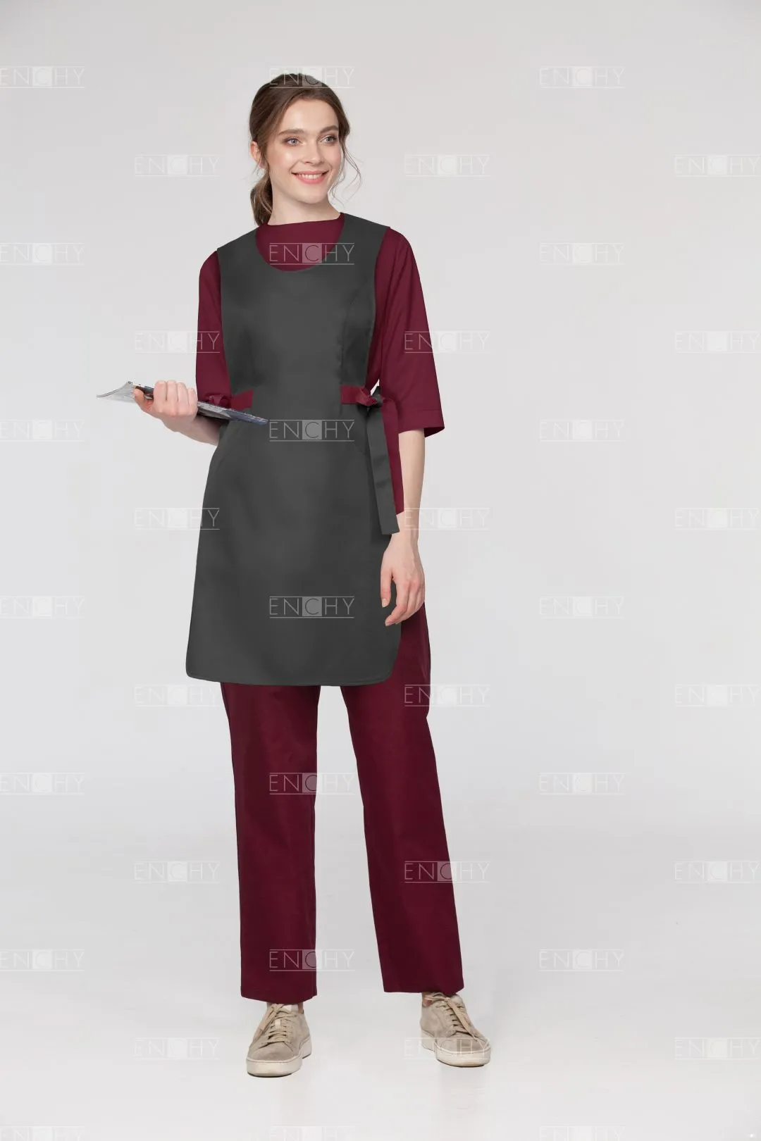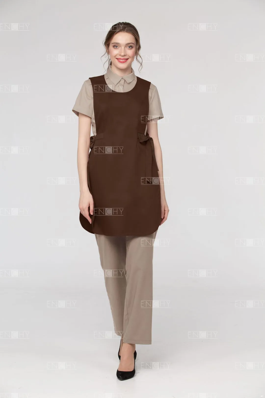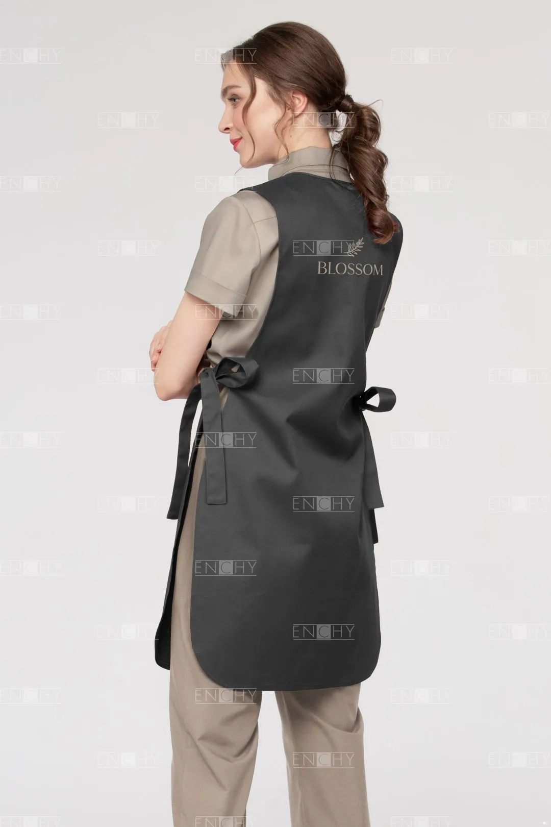 Классический фартук - накидка с круглой горловиной и скругленной линией низа. Фартук надевается через голову и завязывается по бокам. Фартук может быть однотонным или с разными вариантами отделки: отрезным бочком переда, с разными цветовыми комбинациями завязок, а также фирменный стиль можно дополнить вышивкой логотипа!