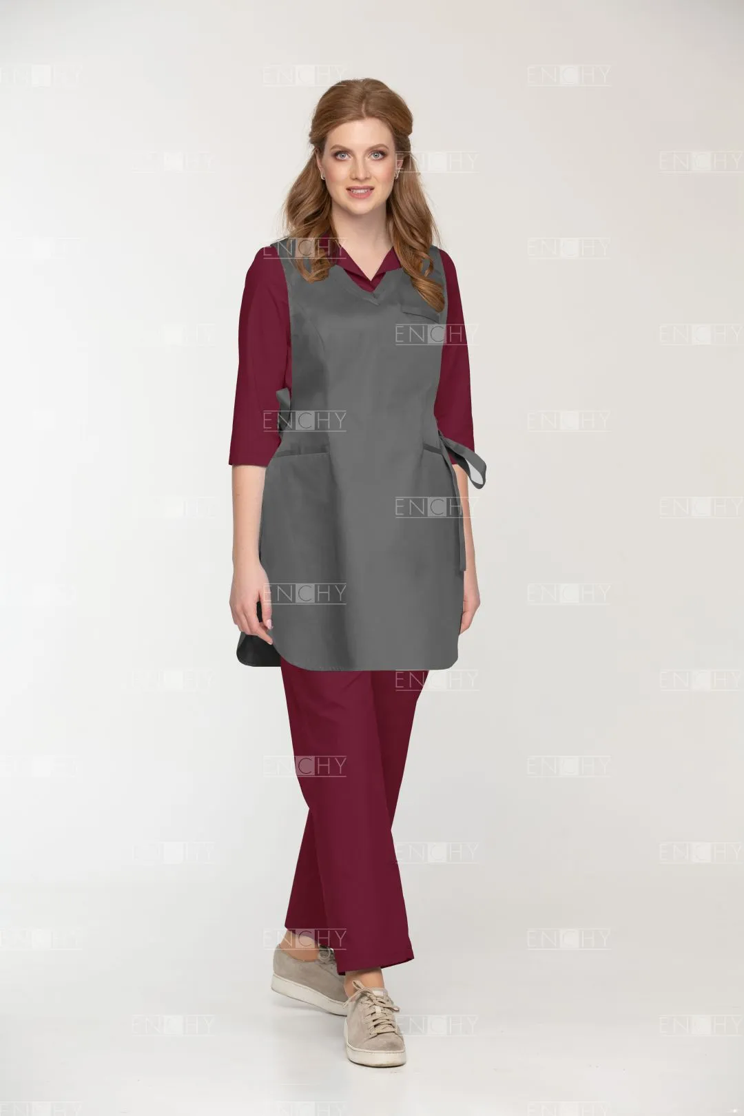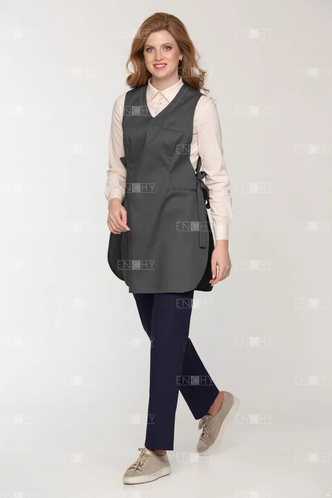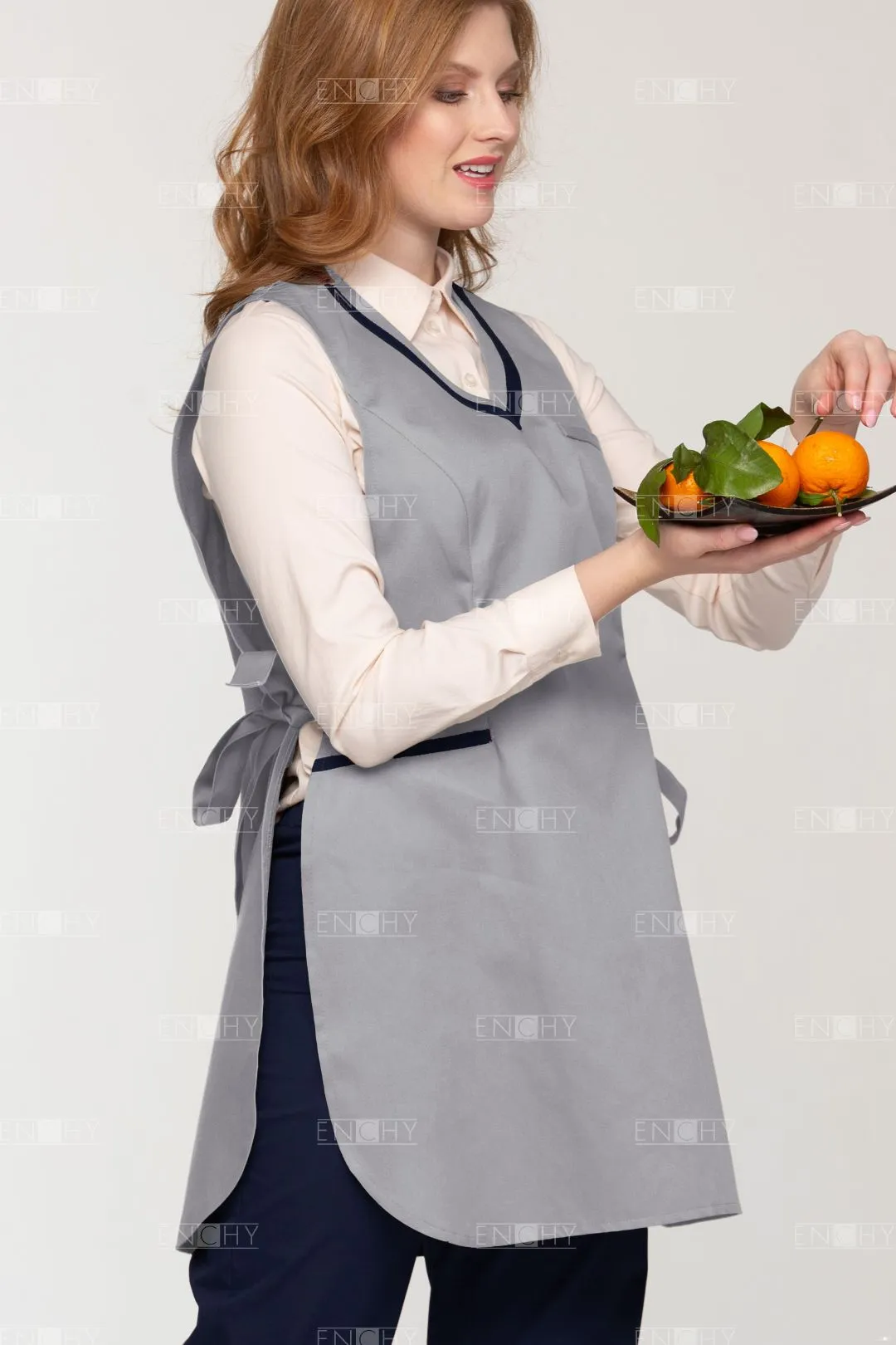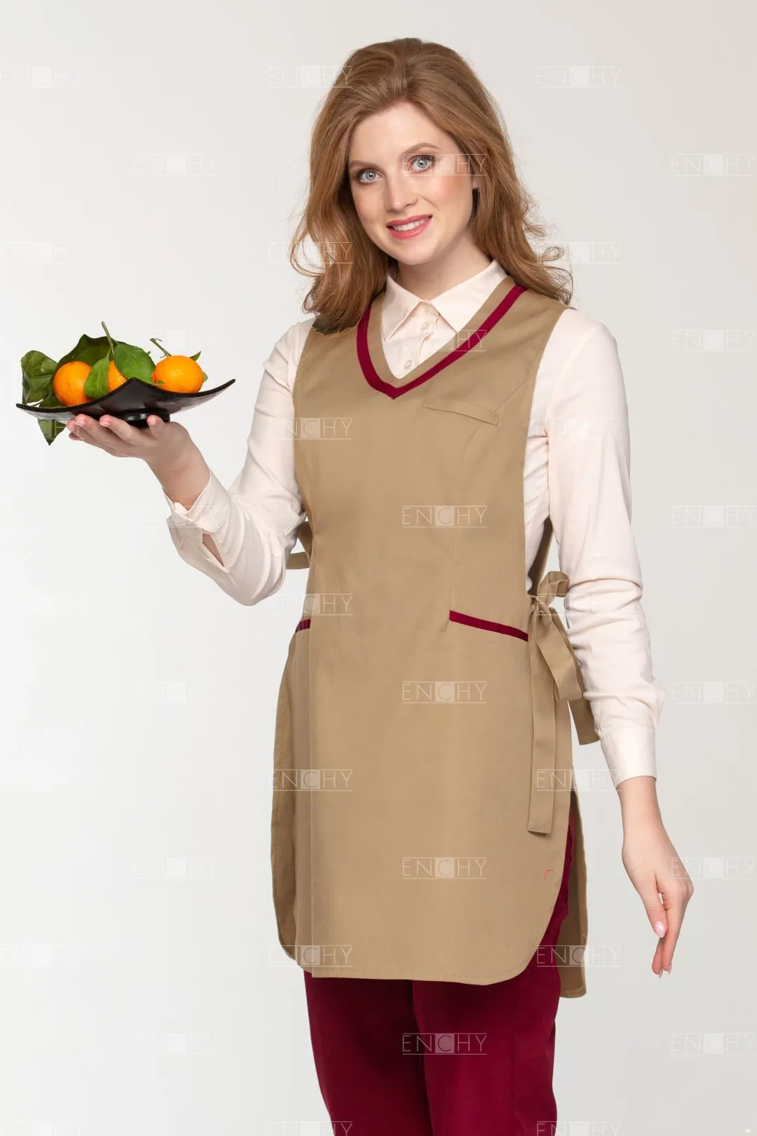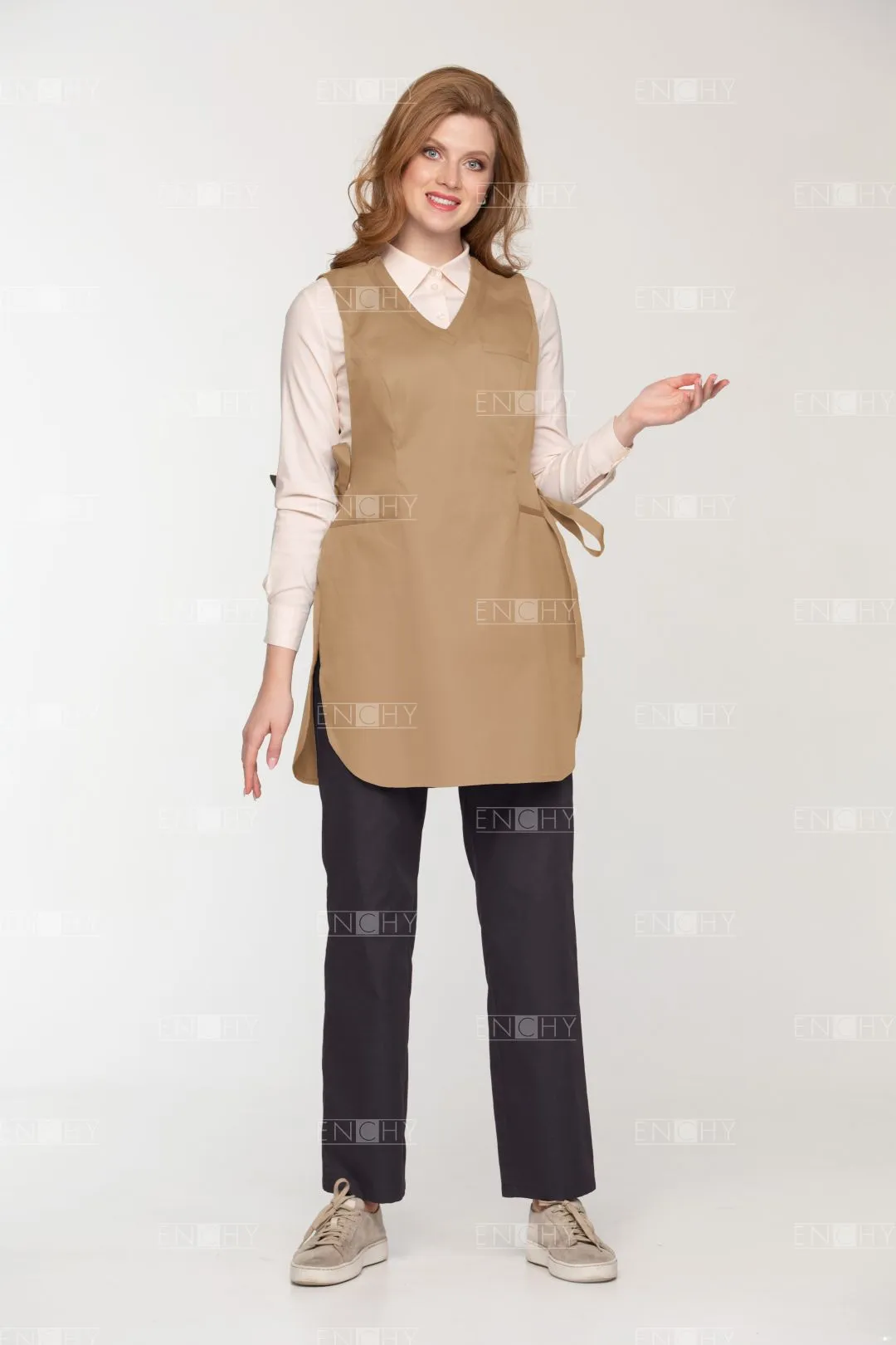 Фартук - накидка без карманов с V-образным вырезом и отделкой бейкой по горловине, которая может быть выполнена контрастным цветом. На груди - имитация листочки под бейдж. Рельефы переда и талиевые вытачки обеспечивают хорошую посадку на женской фигуре. Фартук можно завязывать по бокам, или сначала завязывается по спинке изнутри, далее накидывается спинка и завязывается спереди.