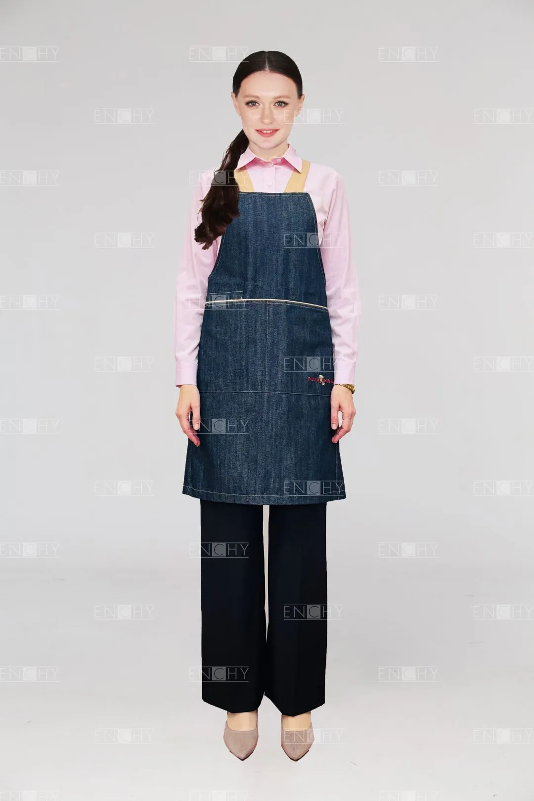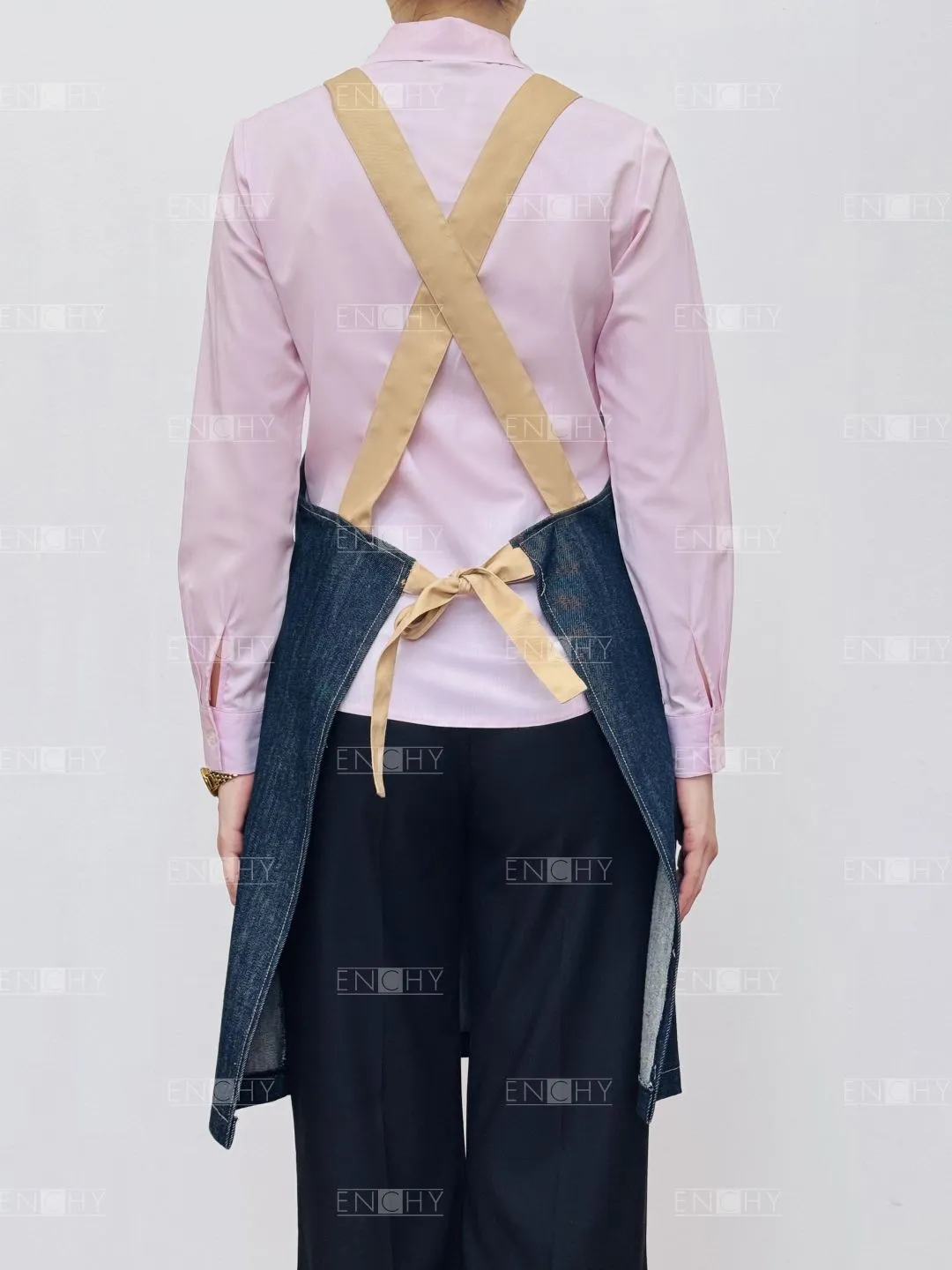 Стильный фартук с большим накладным карманом с 2 секциями и одним дополнительным. На спинке бретели заходят друг на друга крест накрест, а сам фартук завязывается на пояс сзади.