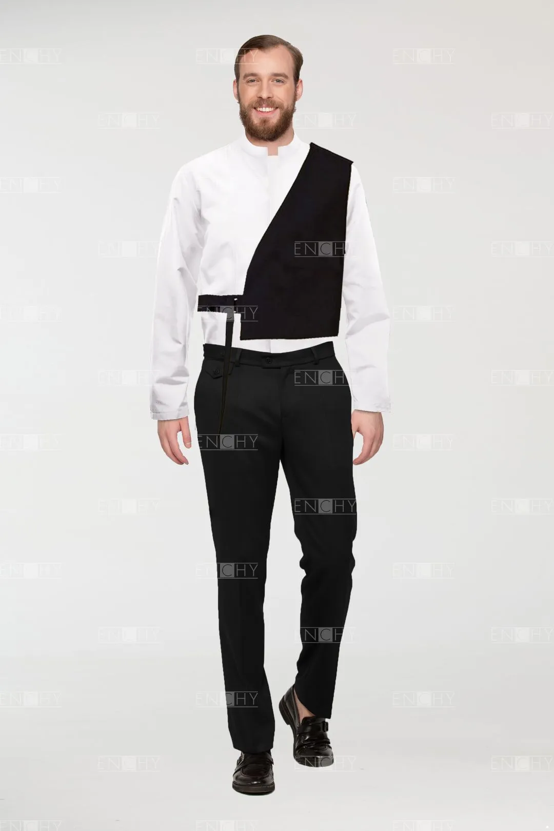 Стильный фартук станет заметной отличительной чертой ваших официантов и барменов! Изделие надевается на одно плечо и застегивается на пояс и полукольца сбоку.