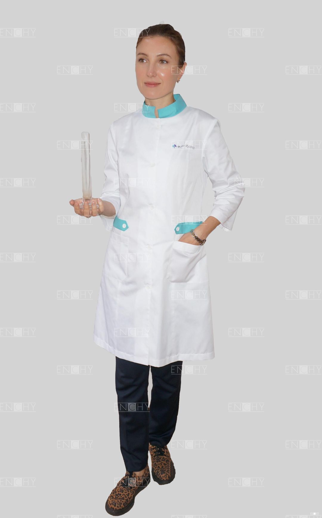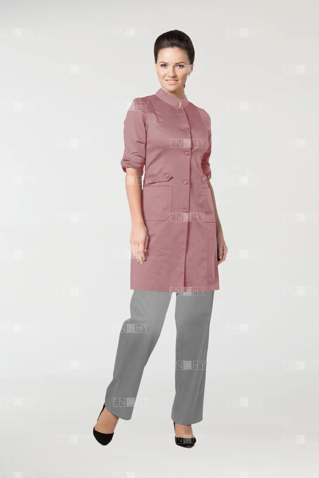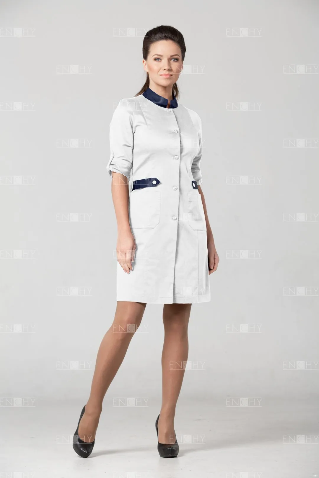 Симпатичный халатик полуприлегающего силуэта на пуговицах украшен декоративными патами чуть ниже талии. Рукав втачной с функциональной патой. Воротник-стойка, удобные накладные карманы.