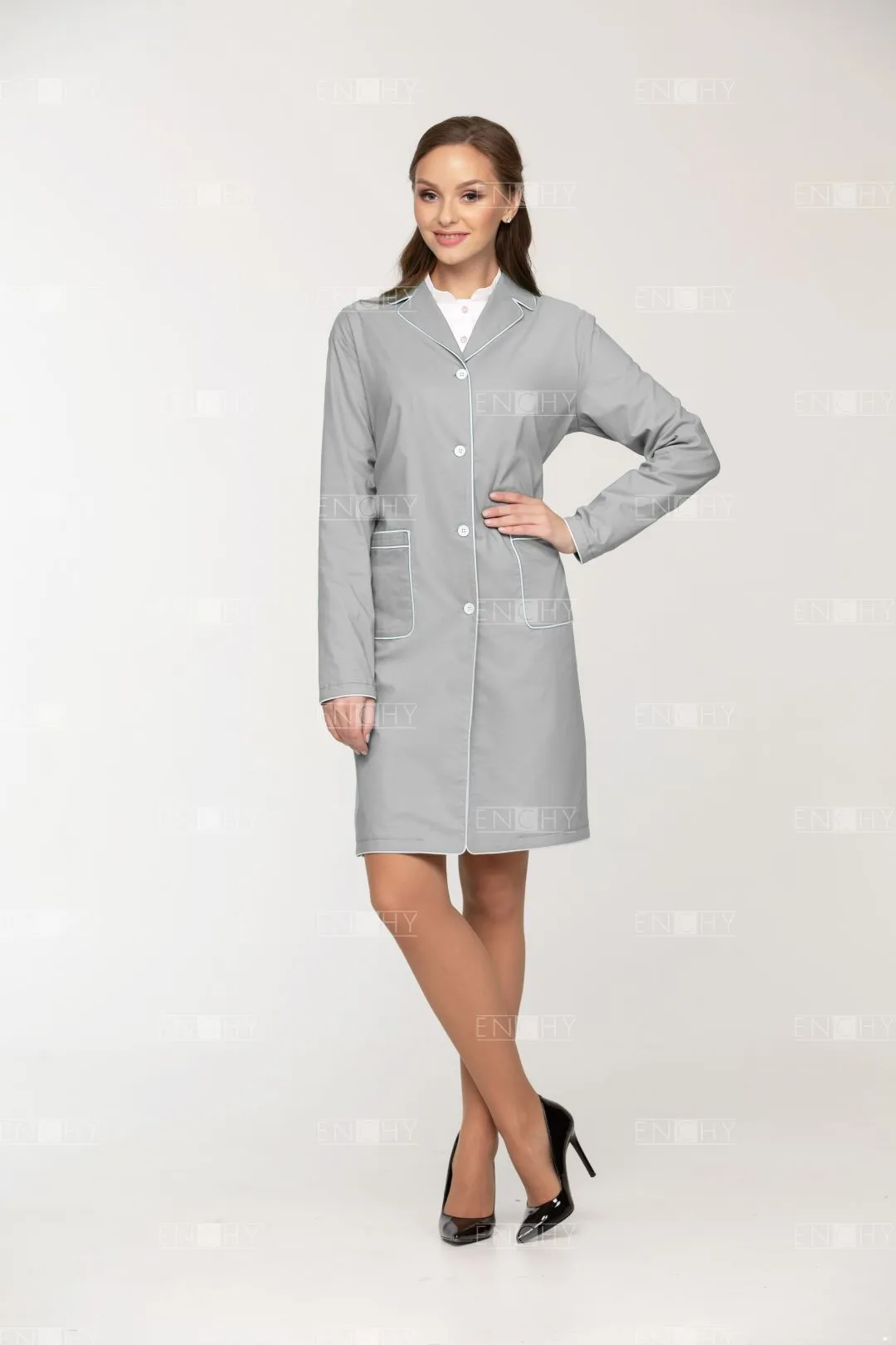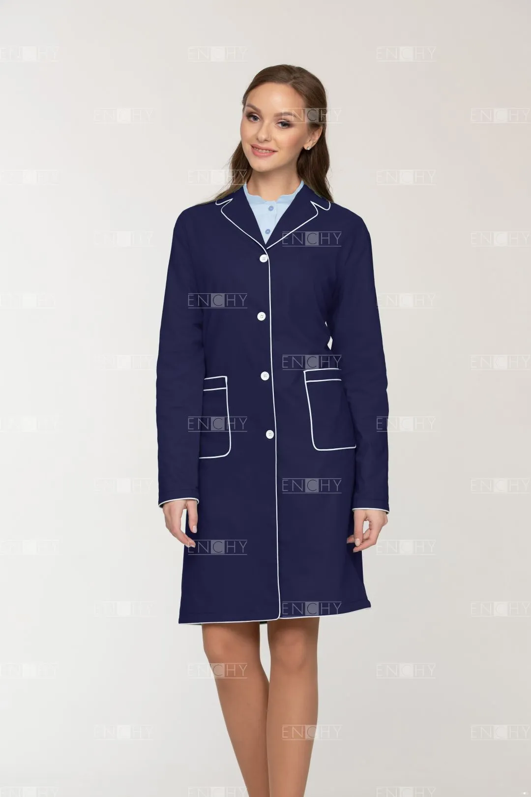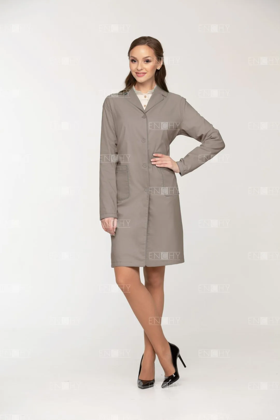 Прямой халат с отложным воротником на 4 пуговица по переду. По бокам разрезы. Накладные карманы.