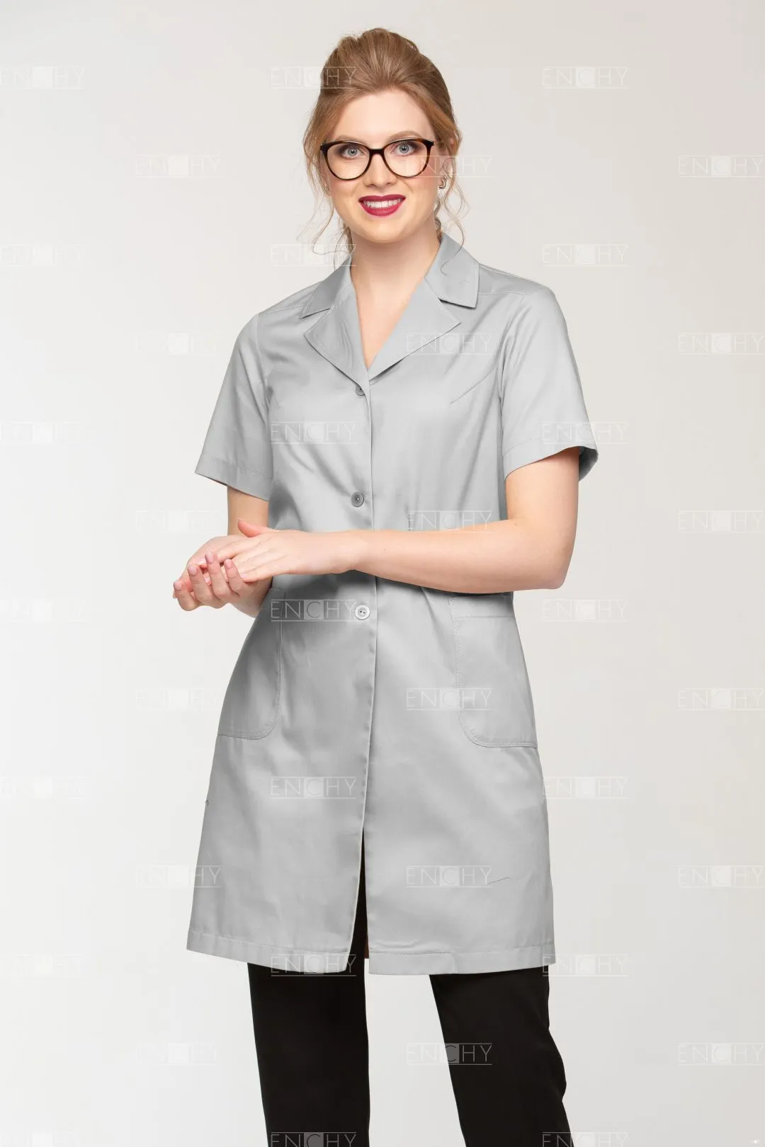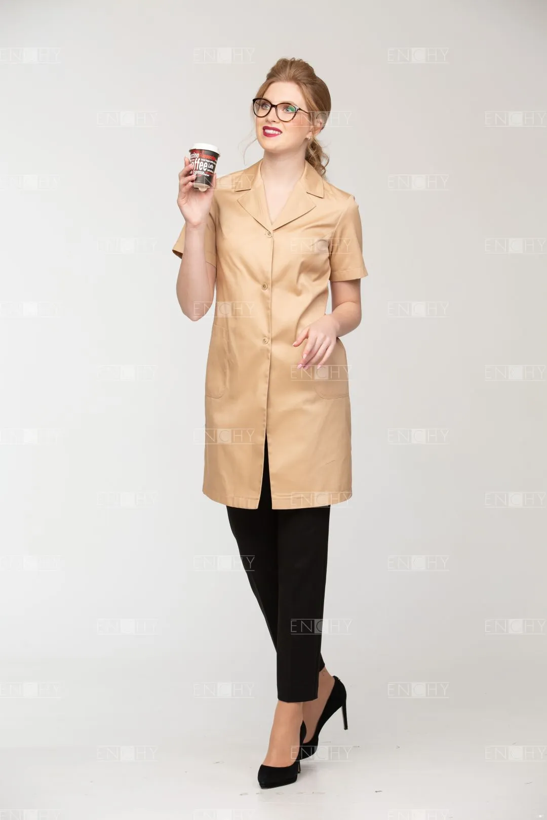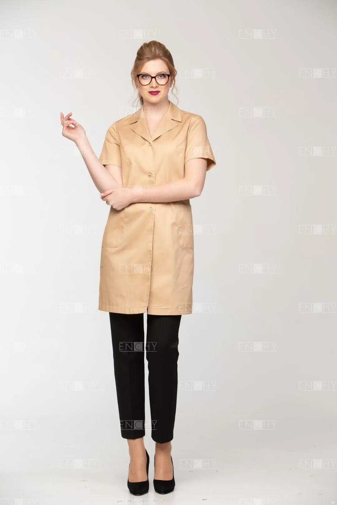 Прямой халат с отложным ворротником на 3 пуговица по переду. Рукав короткий. Накладные карманы, по спинке хлястик.