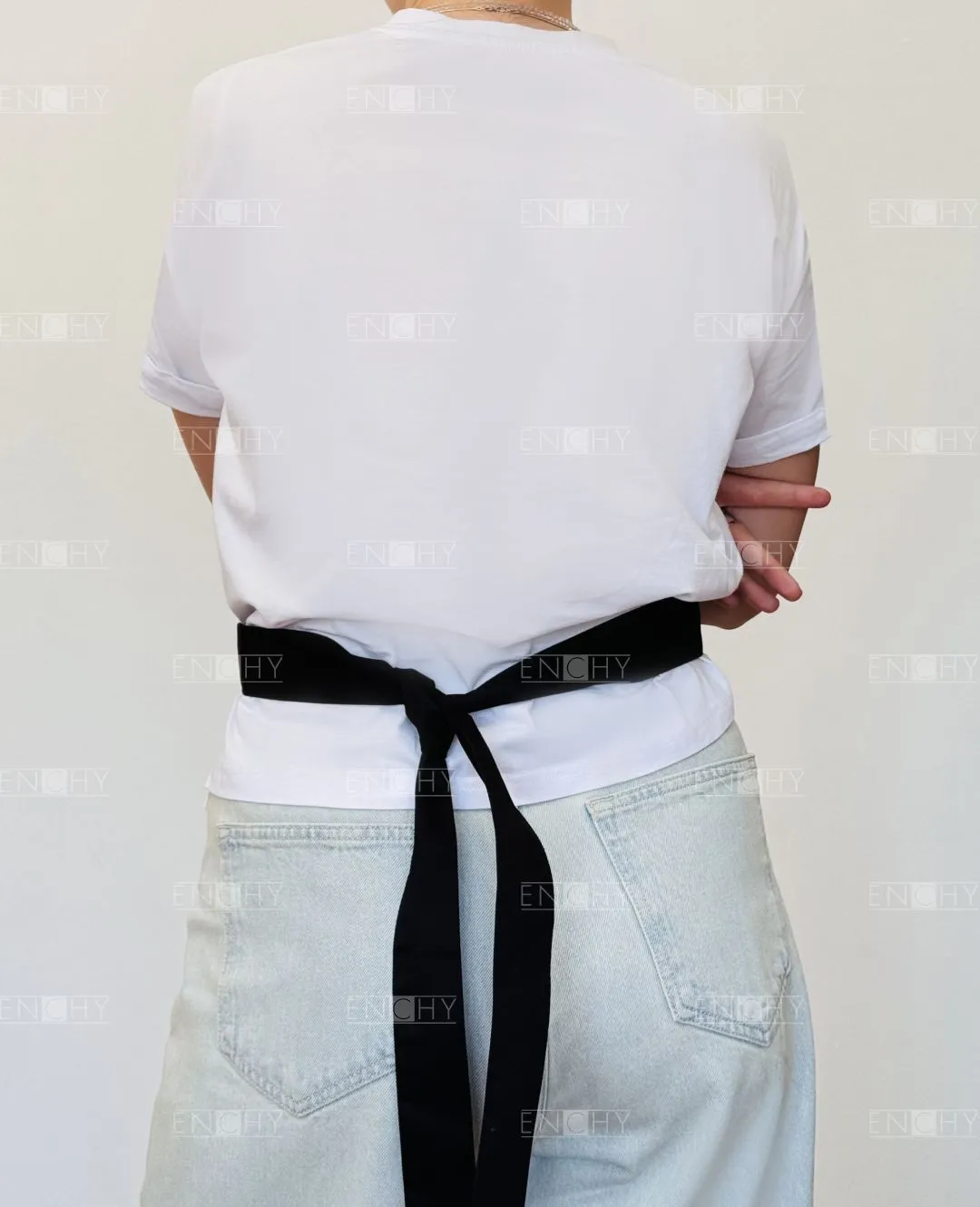 Минималистичный фигурный передник с карманом, разделенным на две секции. Фартук авязывается сзади на пояс. Передник можно отделать как кантом, так и обтачками другого цвета по периметру.