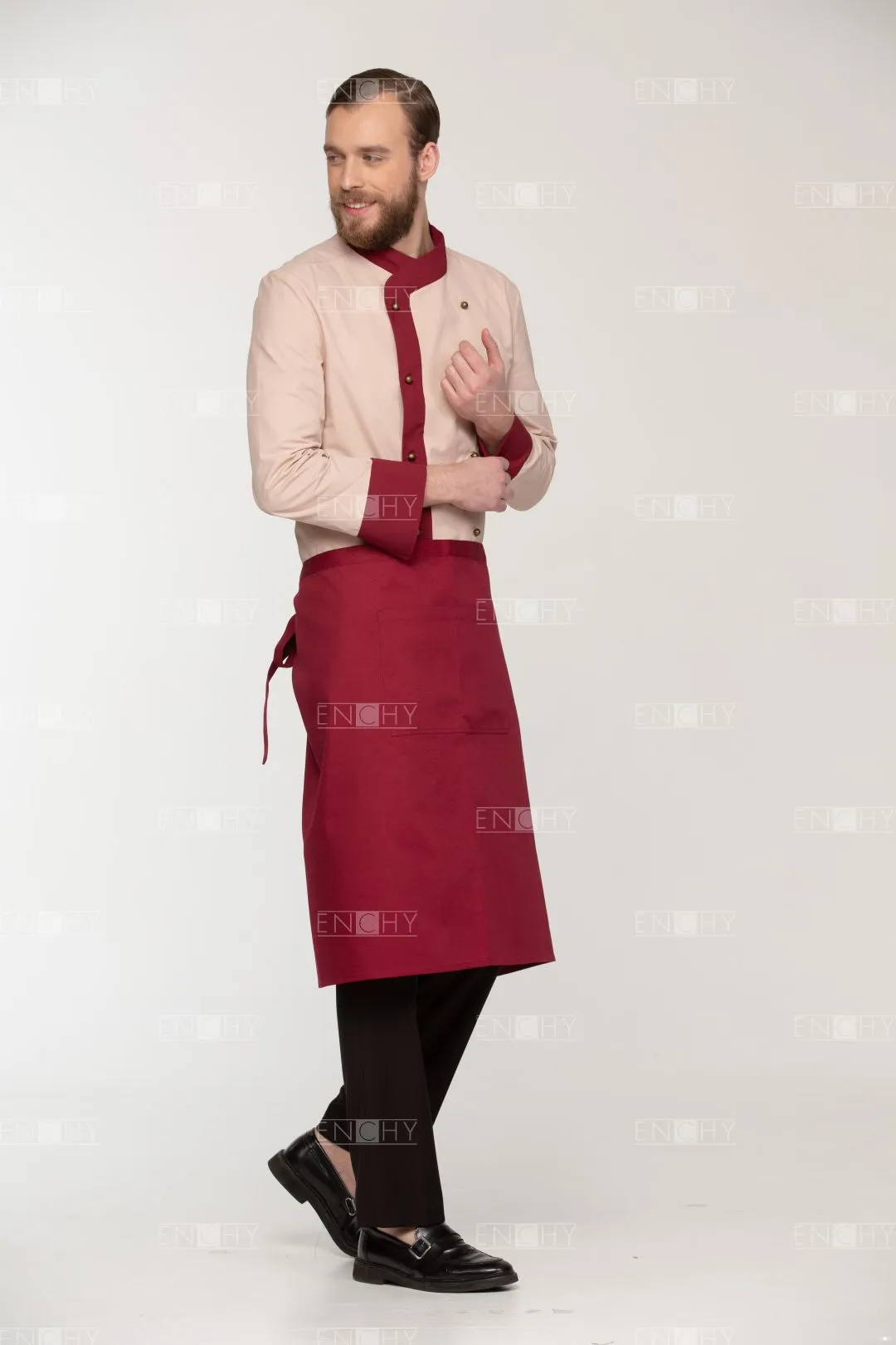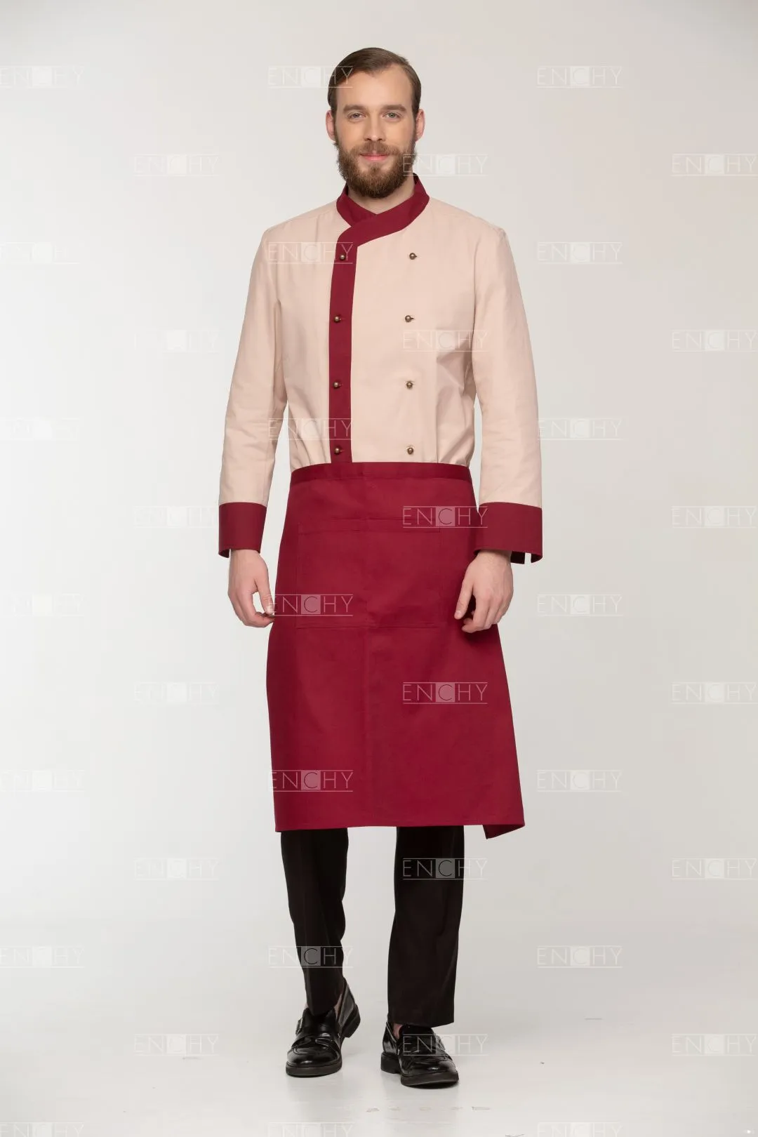 Фартук-передник с притачным поясом, переходящим в завязки. Спереди накладной карман 20*28 см, разделенный посередине на 2 отсека. Длина фартука 68 см, ширина 102 см. Сзади фартук завязывается встык.