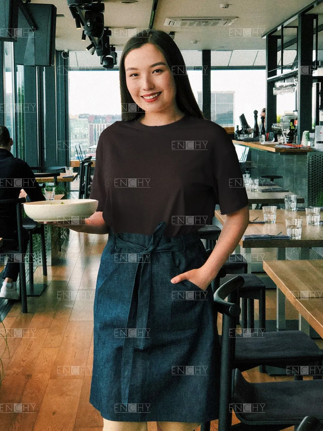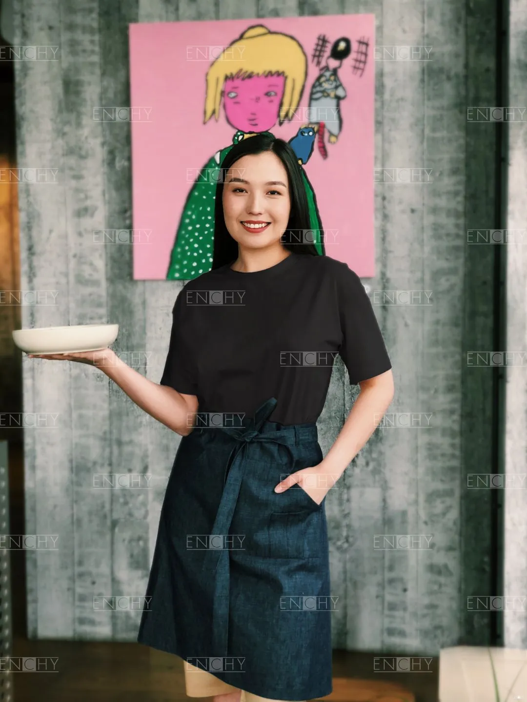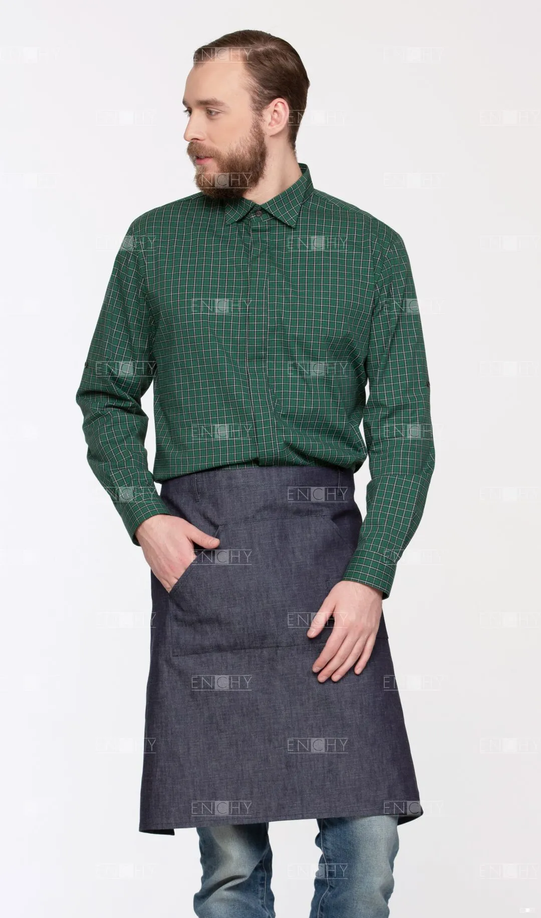 Передник с накладным карманом фигурной формы и дополнительным небольшим карманом.