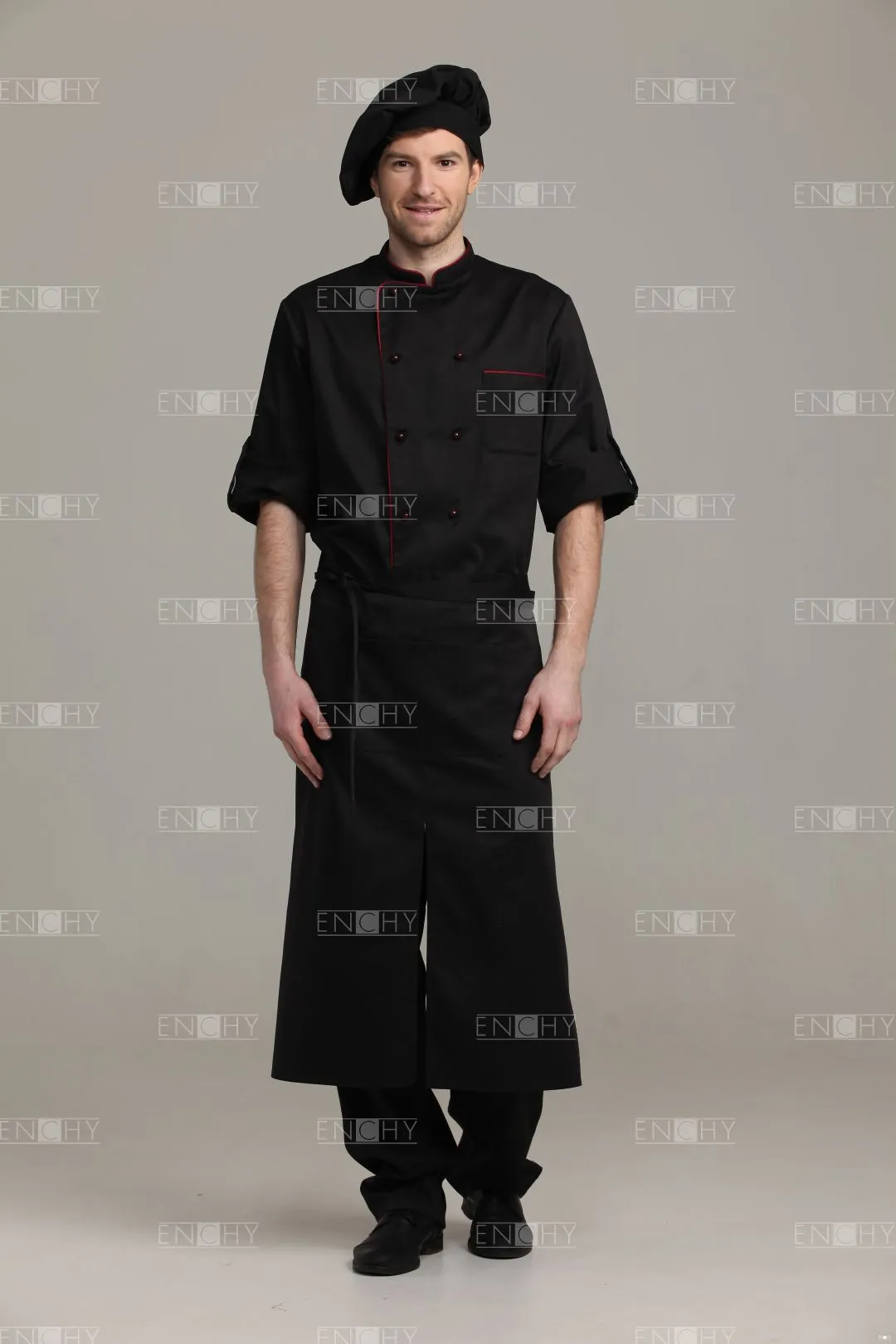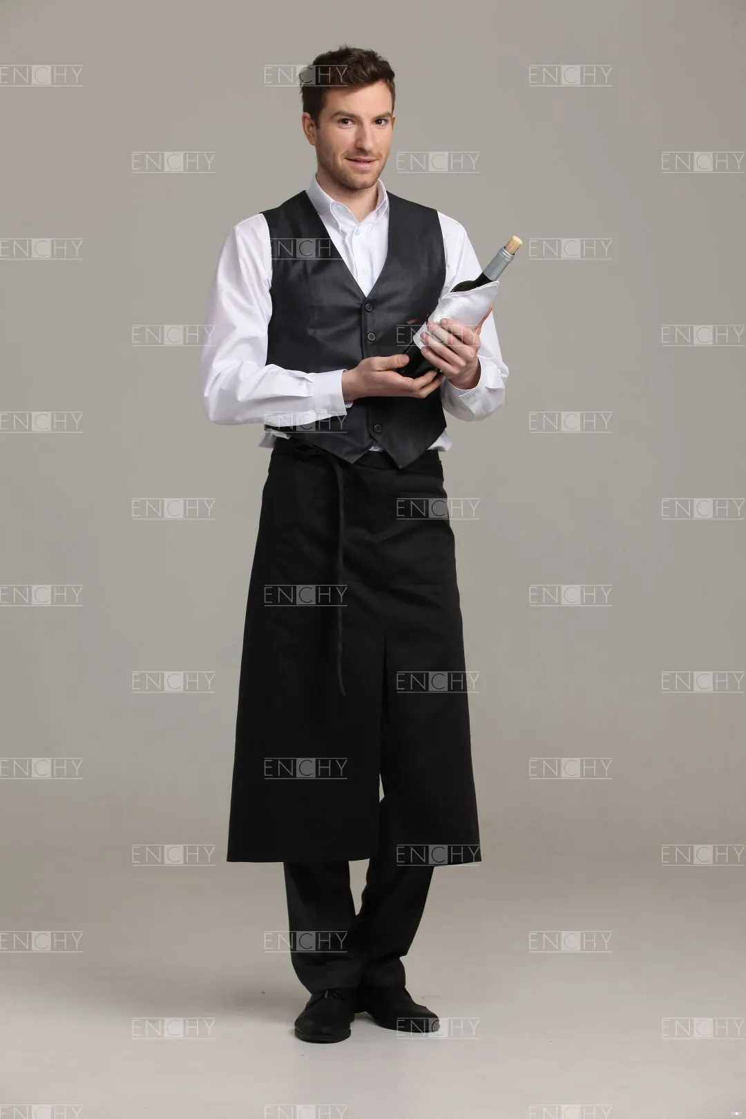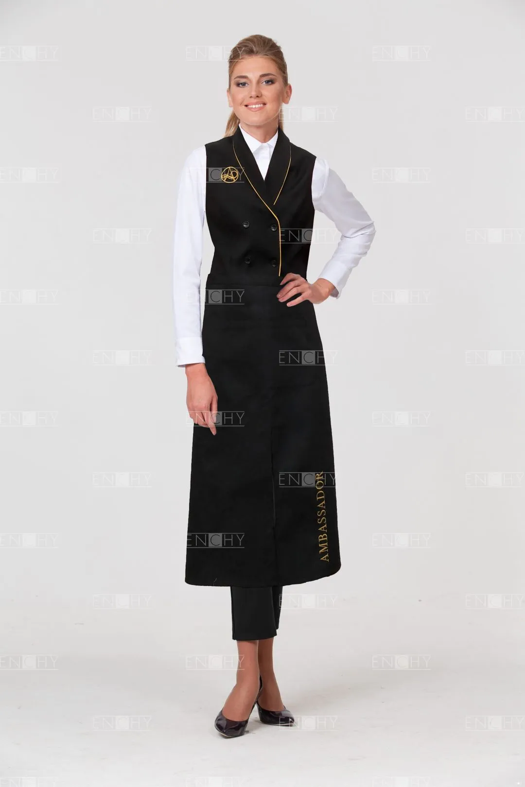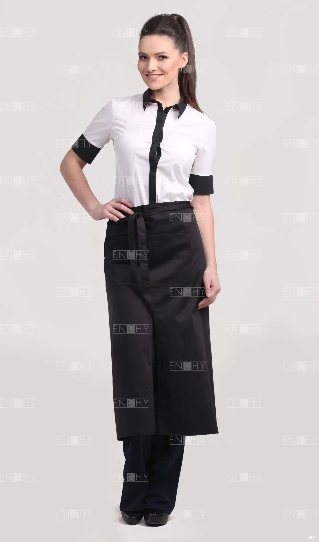 Фартук-передник с притачным поясом, переходящим в завязки. Спереди накладной карман 18*27 см, разделенный посередине на 2 отсека. Центральный разрез. Сзади полотнища передника не заводятся друг за друга.
