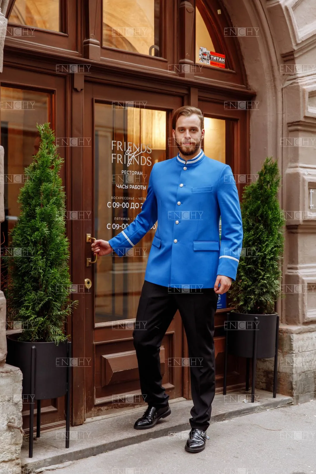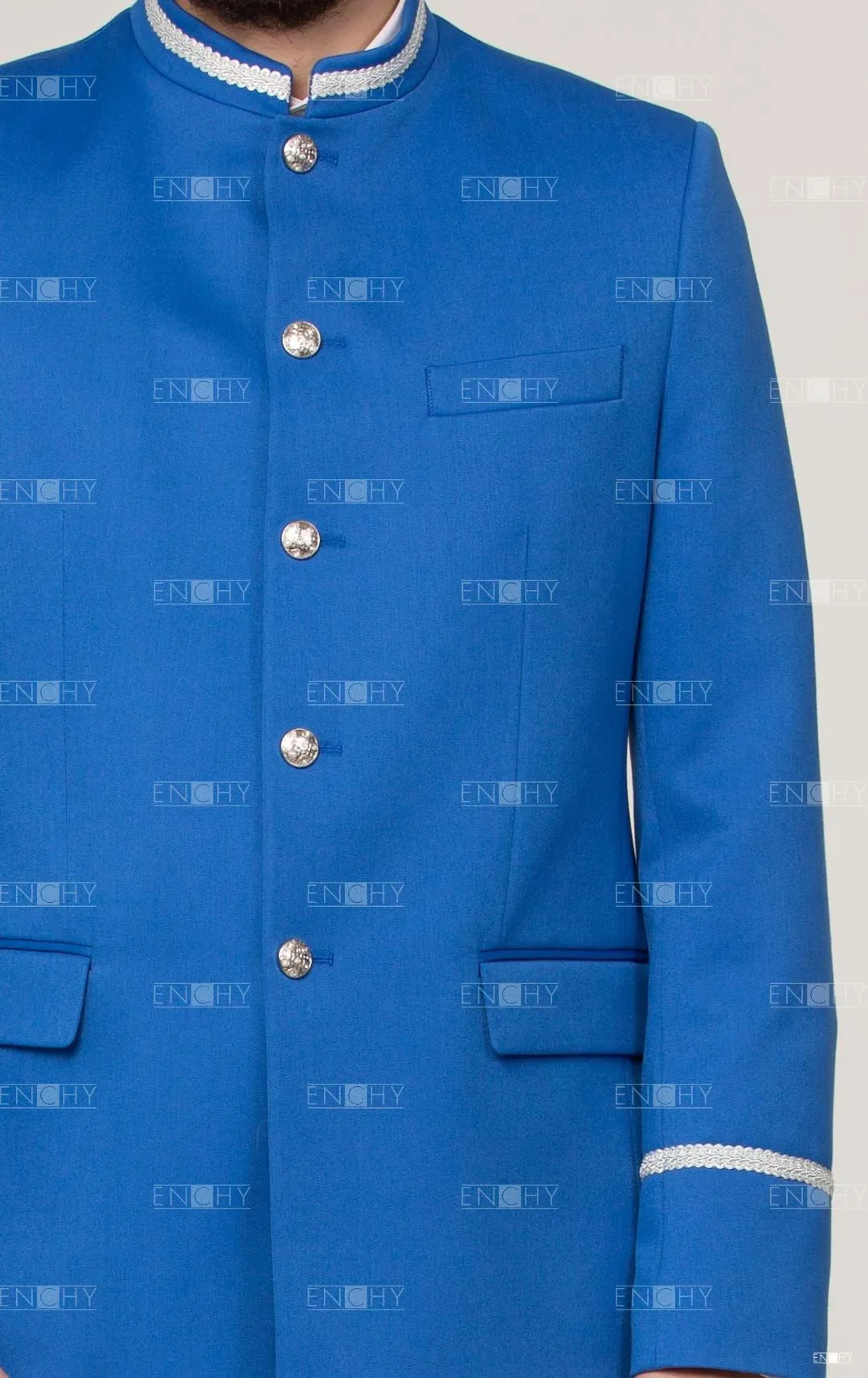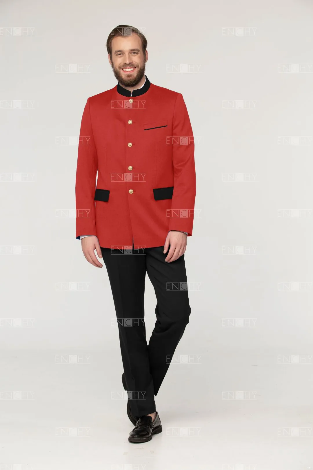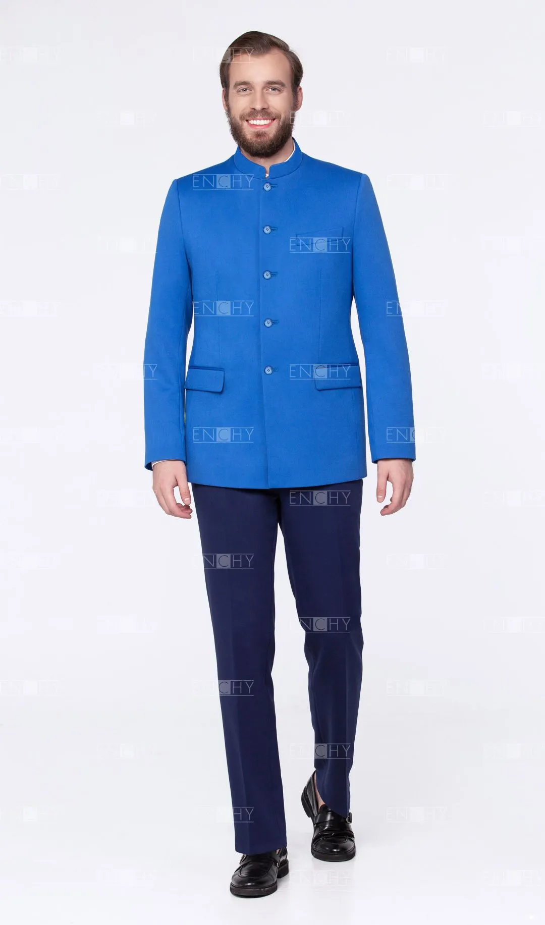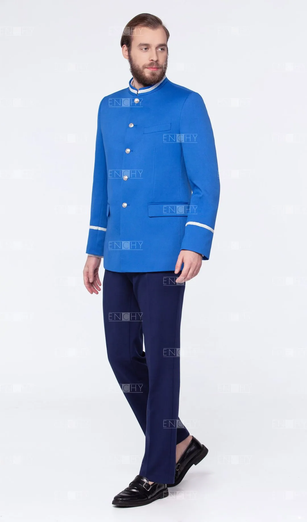 Стильный пиджак с воротником стойкой и карманами с клапаном. Может быть отделан различной тесьмой.