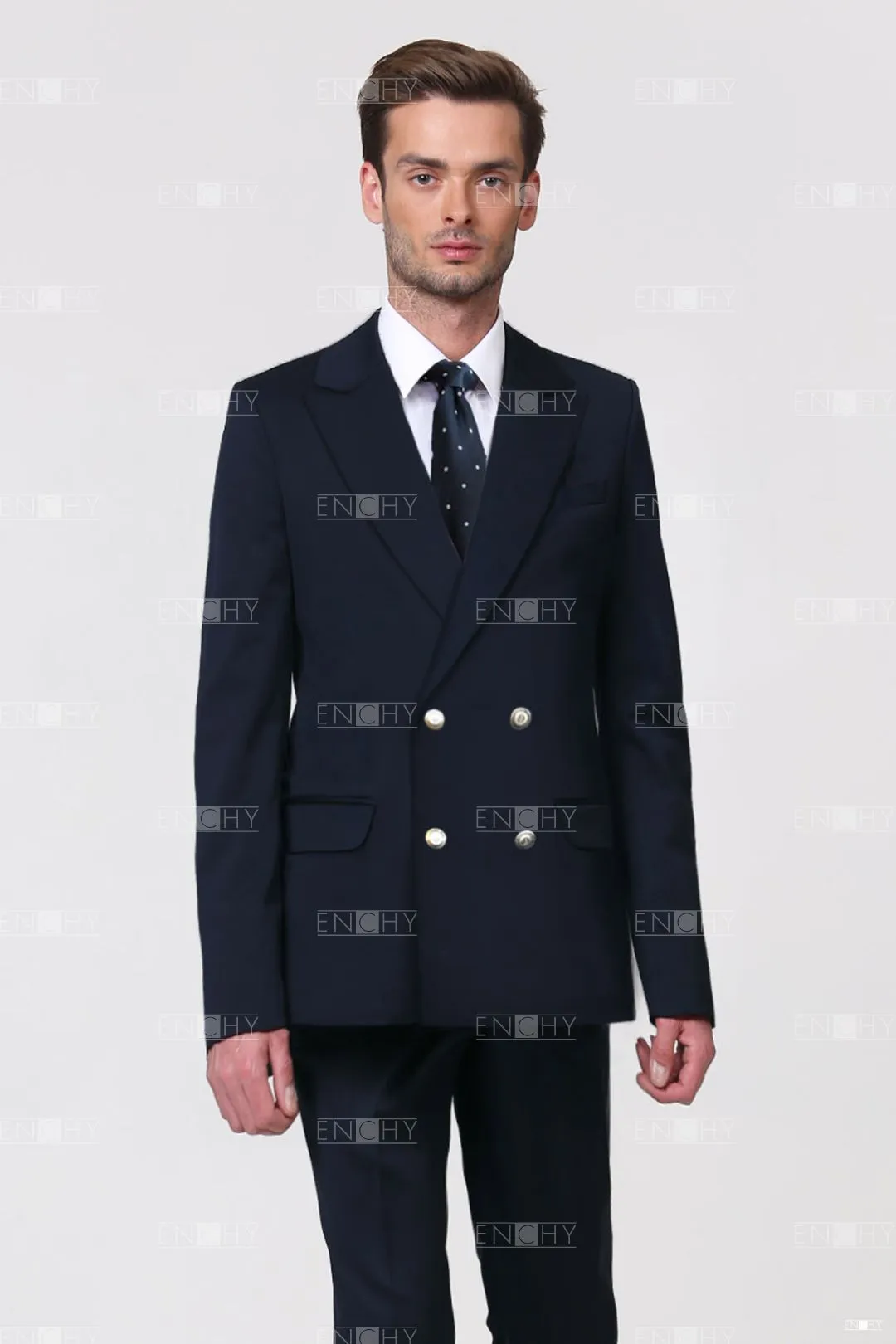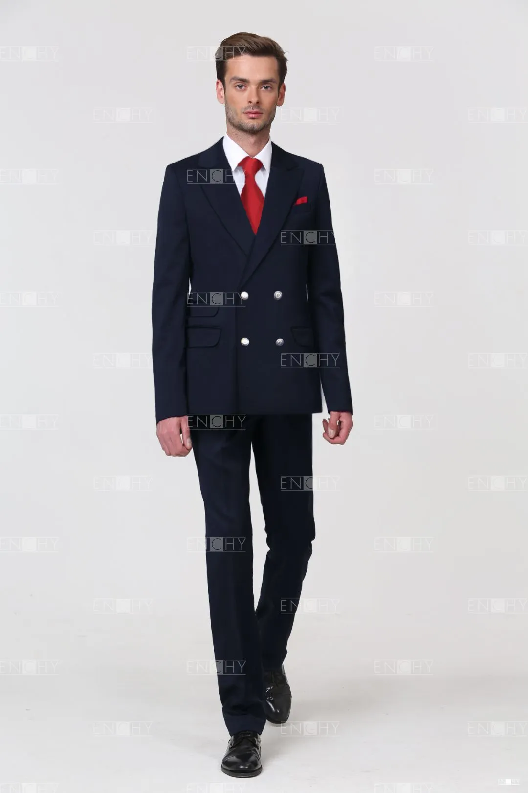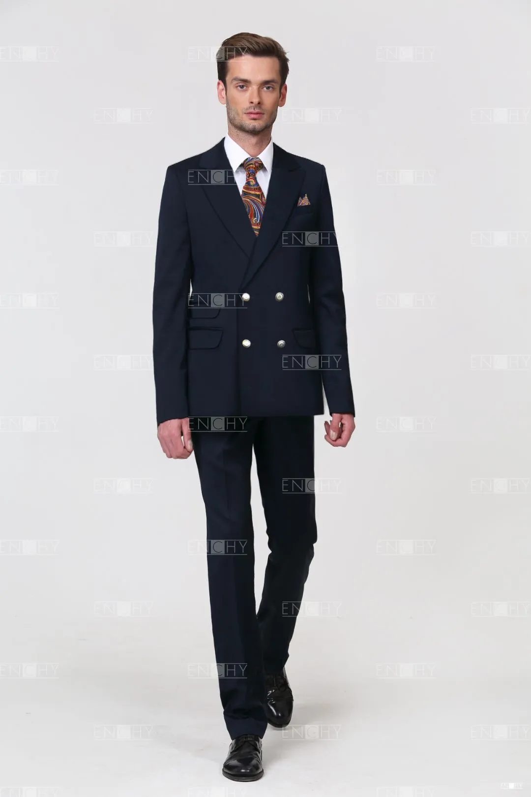 Классический мужской пиджак со стояче-отложным воротником с фигурными лацканами, втачным двухшовным рукавом. На переде 3 боковых кармана с клапанами в рамку, верхний карман с листочкой. Двубортная застежка на 2 ряда петель и пуговиц. В рукавах и среднем шве спинки имеются шлицы.