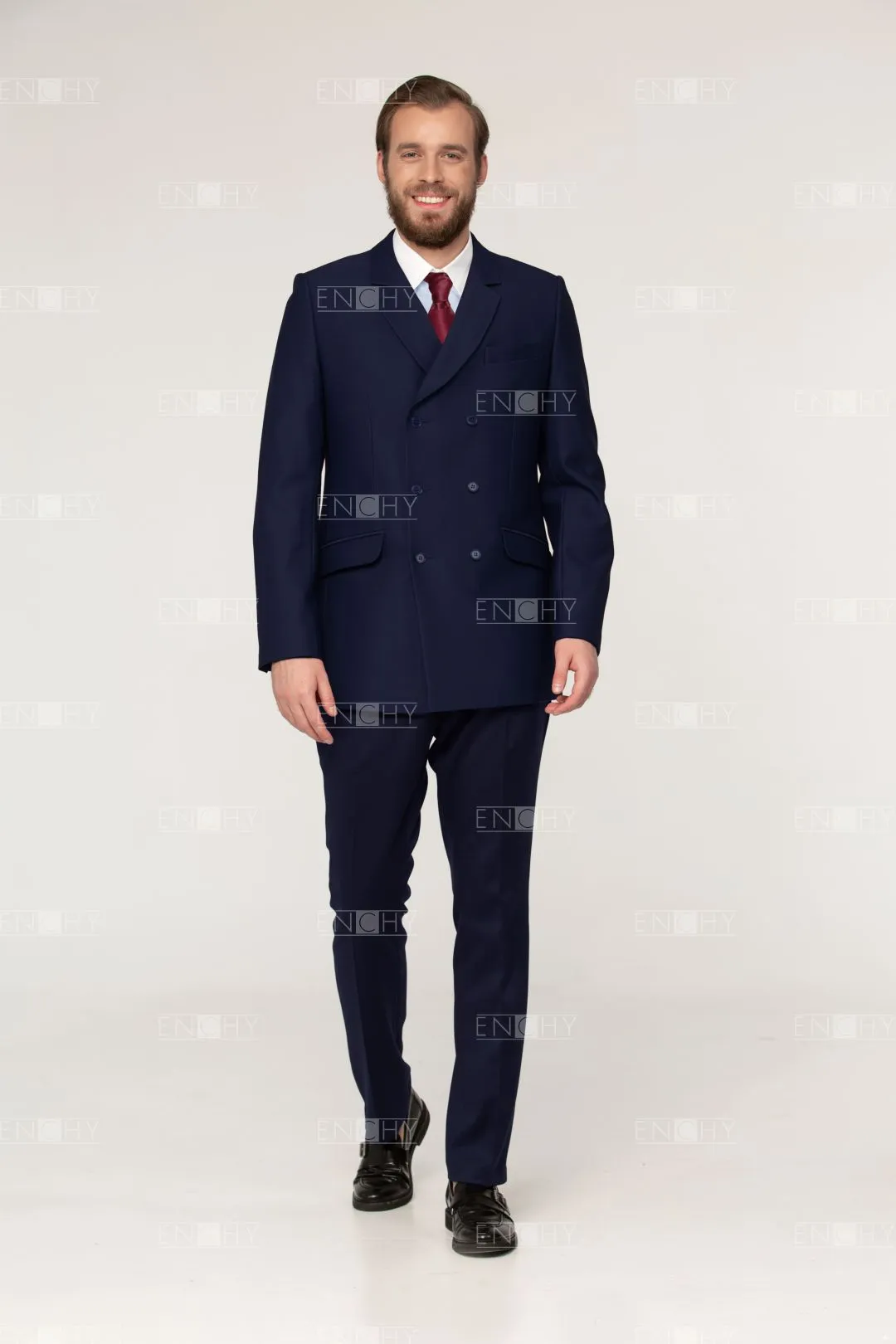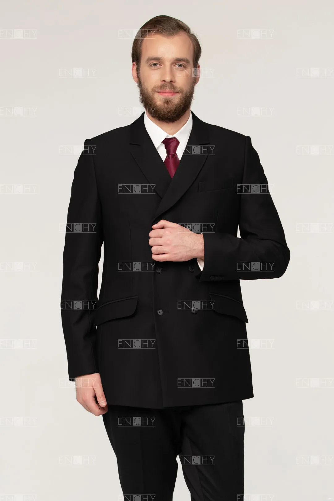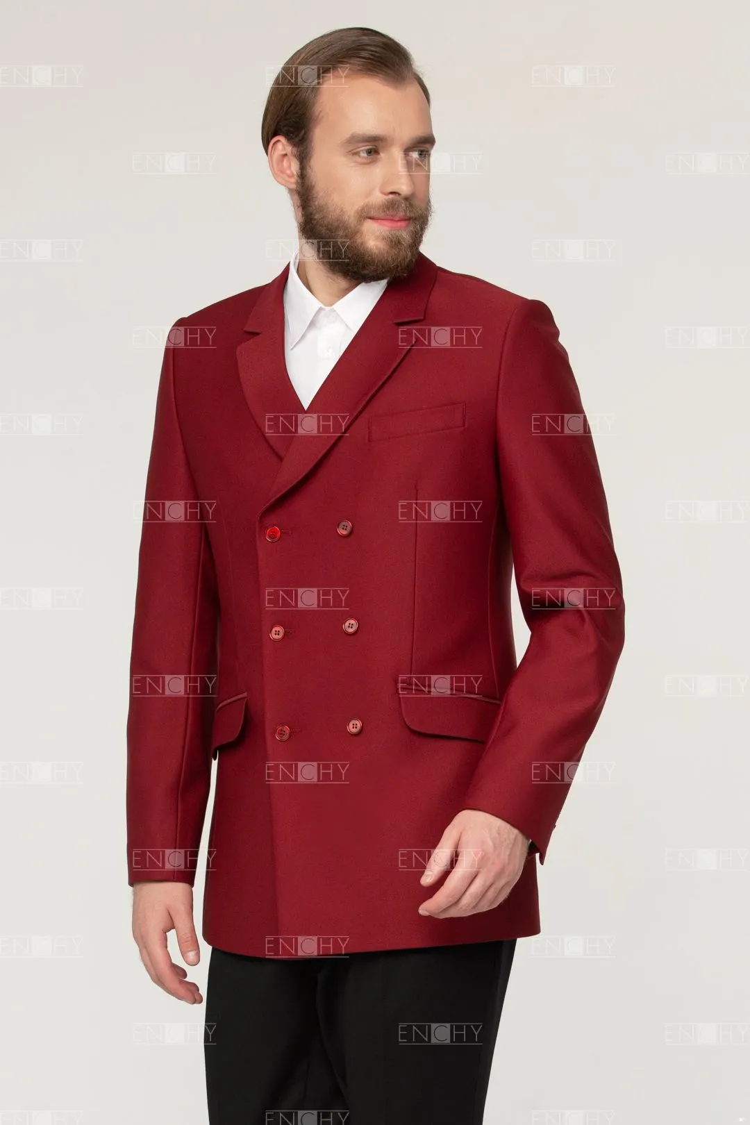 Стильный двубортный мужской пиджак со стояче-отложным воротником с фигурными лацканами, втачным двухшовным рукавом. На переде боковые карманы с клапанами, в рамку, верхний карман с листочкой. Застежка на 3 ряда петель и пуговиц. В рукавах и среднем шве спинки имеются шлицы.