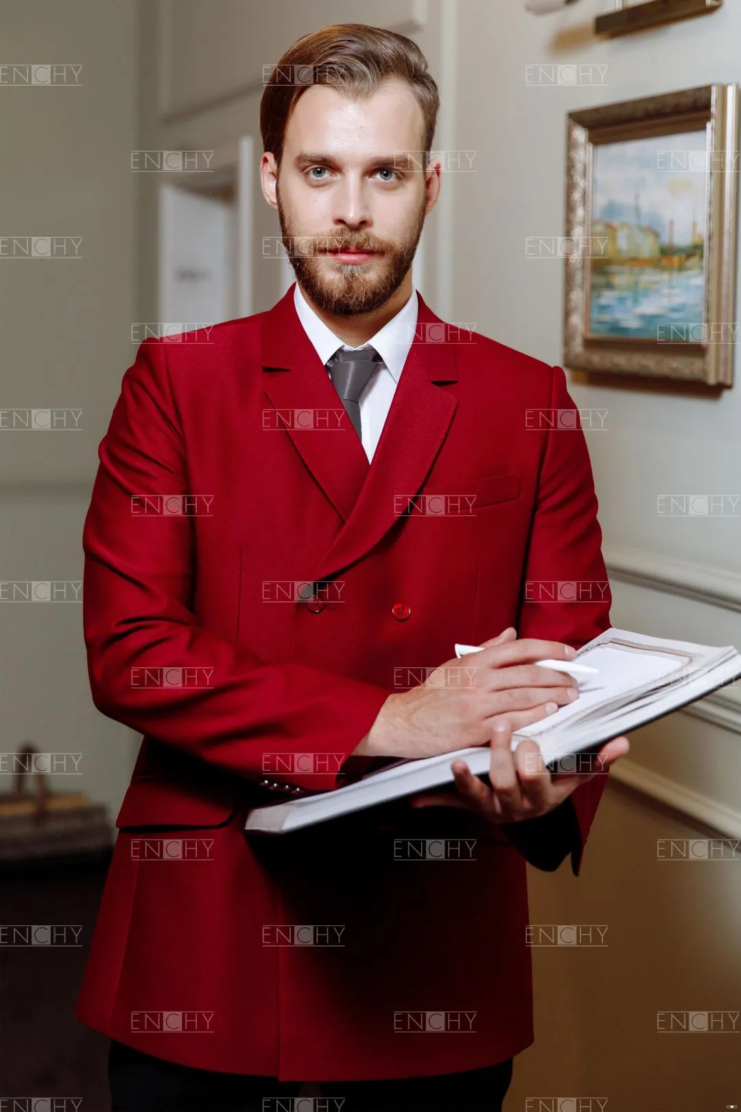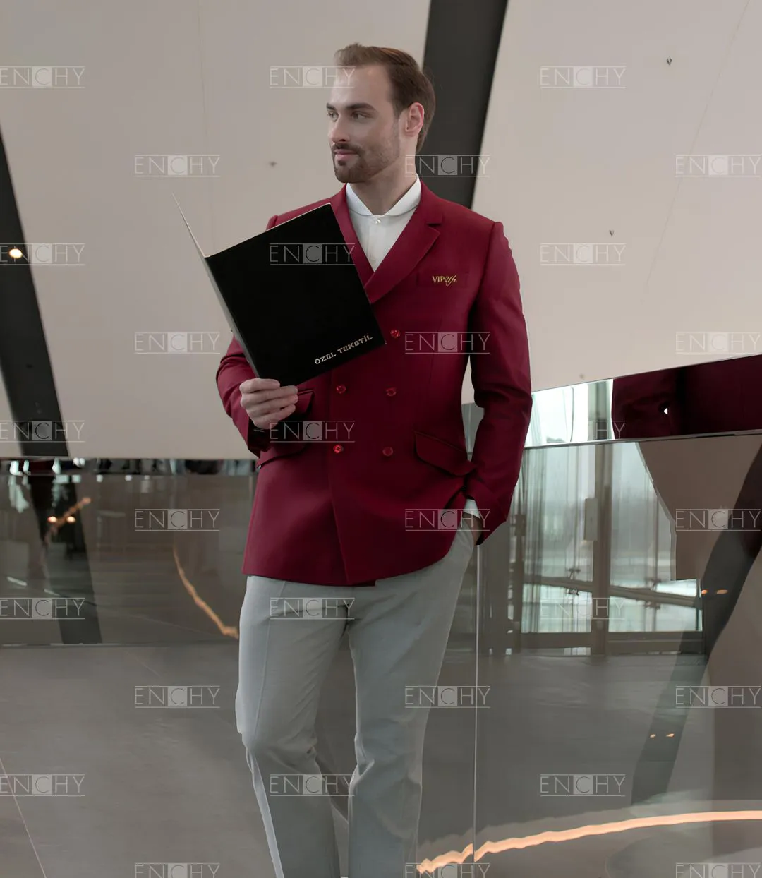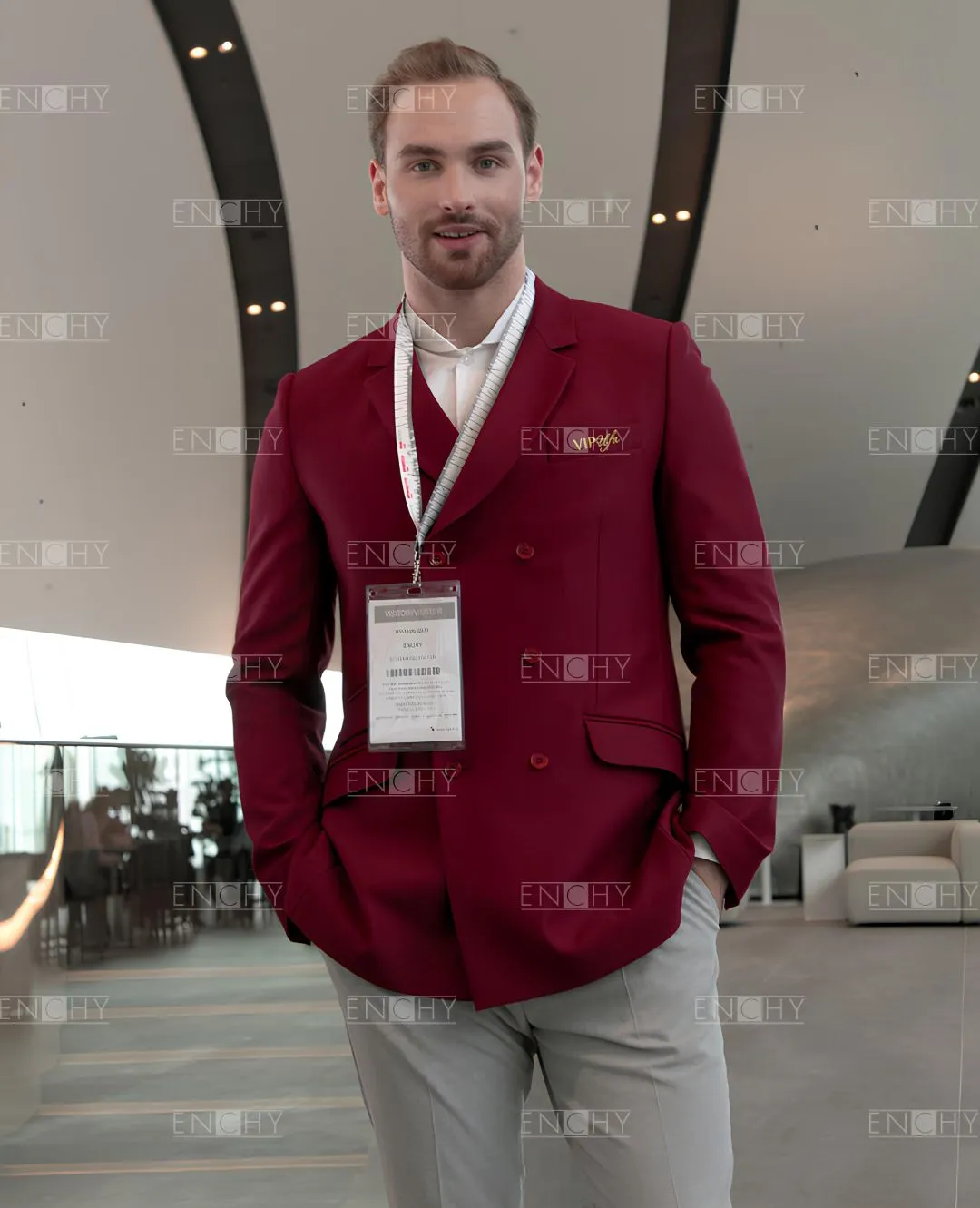 Стильный двубортный мужской пиджак со стояче-отложным воротником с фигурными лацканами, втачным двухшовным рукавом. На переде боковые карманы с клапанами, в рамку, верхний карман с листочкой. Застежка на 3 ряда петель и пуговиц. В рукавах и среднем шве спинки имеются шлицы.