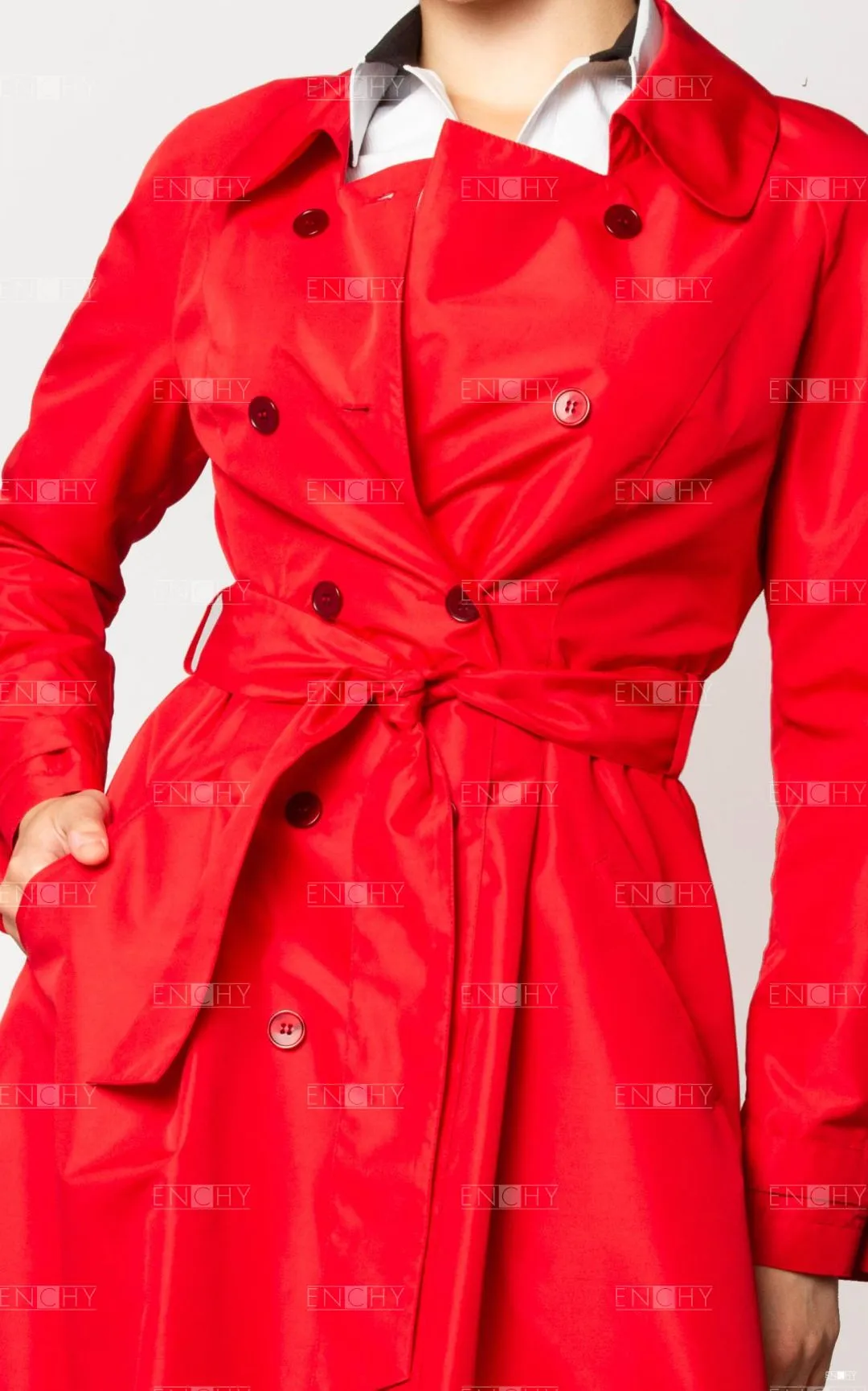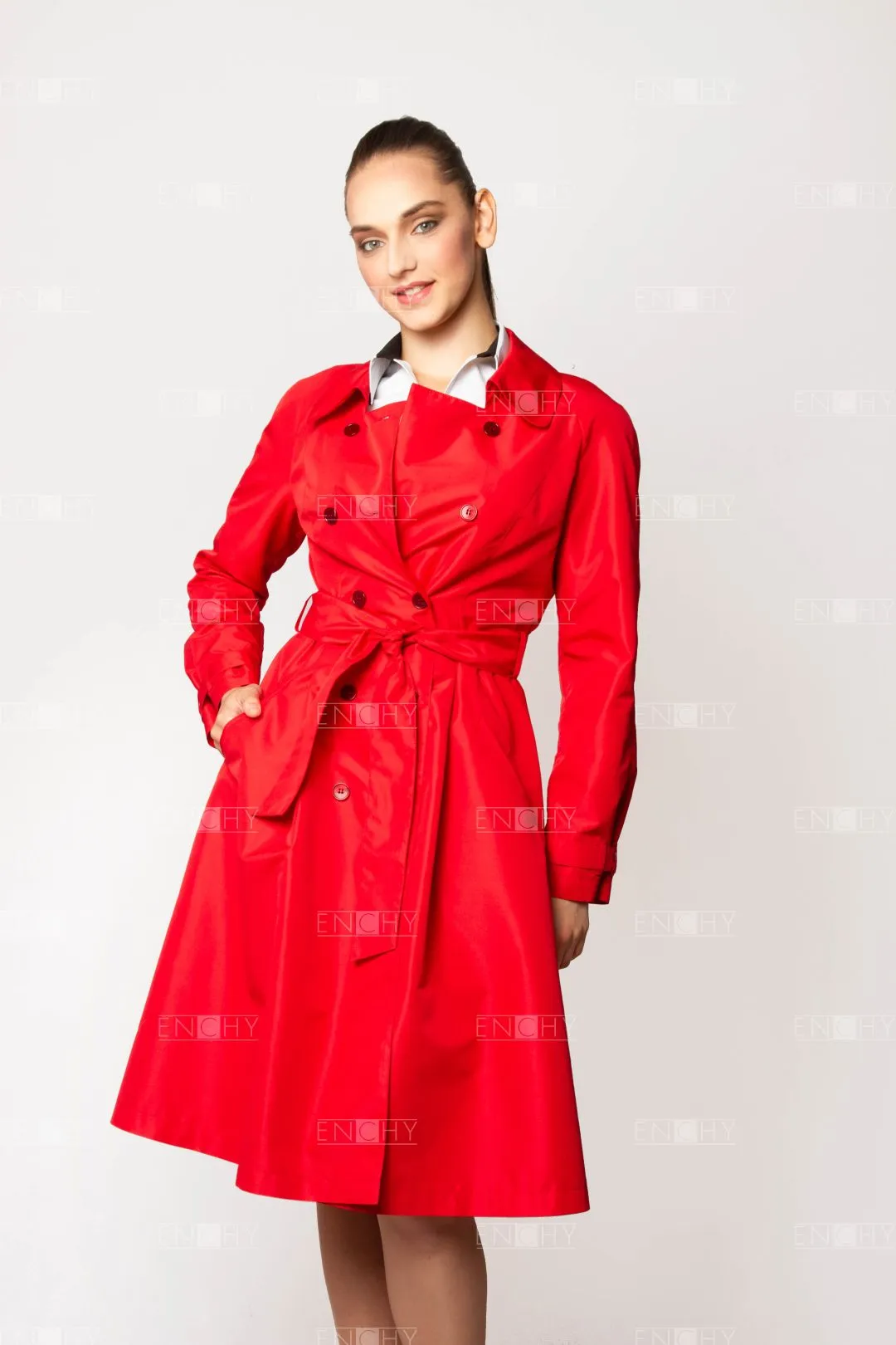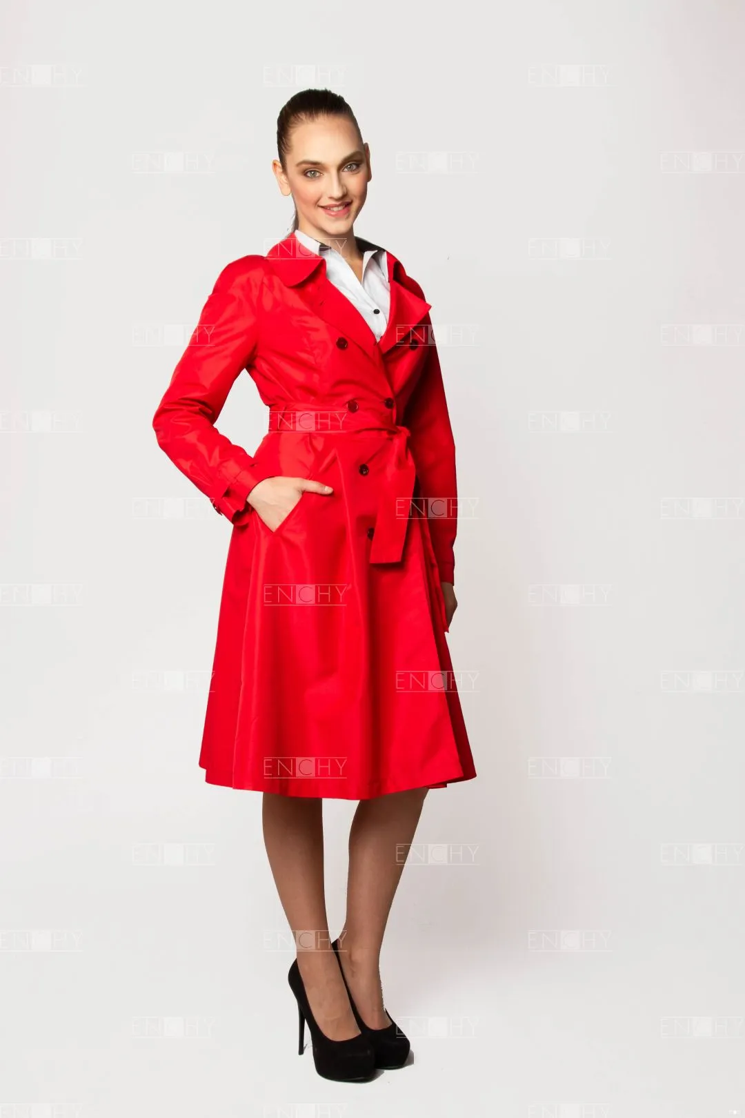 Женский двубортный плащ, завязывающийся на пояс. Плащ длиной до колена, расширен к низу. На рукавах имеются паты для регулировки. На переде расположены карманы с листочкой. Для обеспечения посадки по фигуре на переде и спинке спроектированы рельефные швы, доходящие до линии подреза на талии.