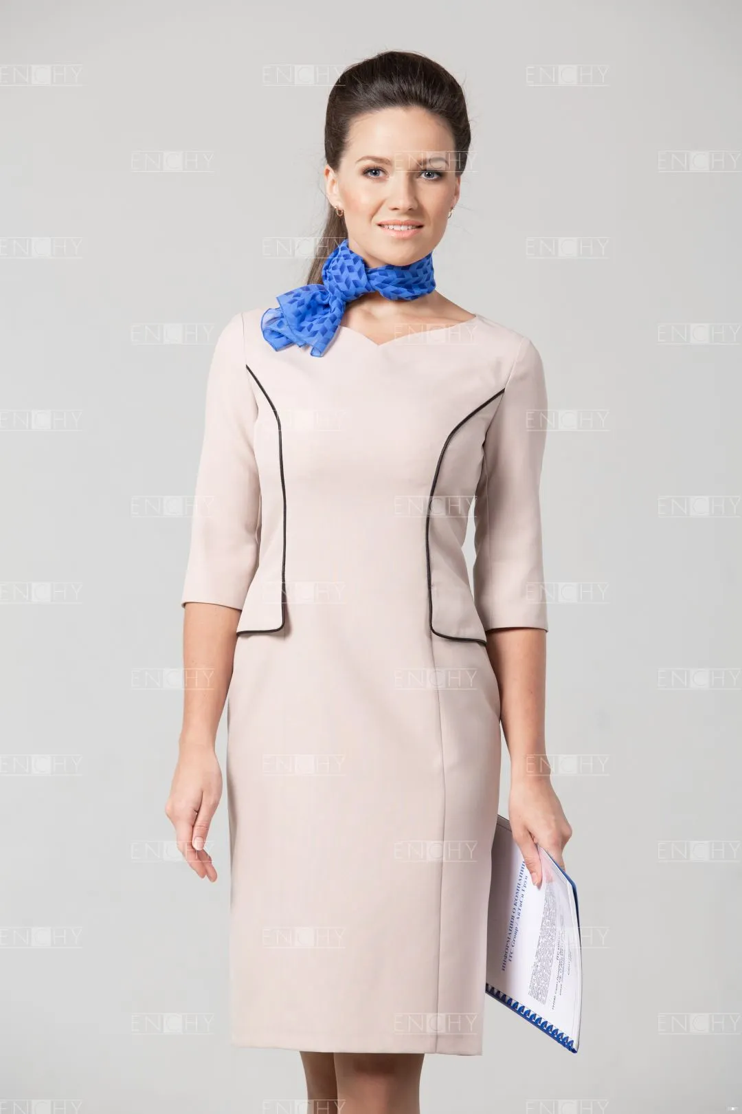 Платье приталенного силуэта с рукавом 3/4. Фигурный вырез и декоративные клапаны создают неповторимый дизайн.