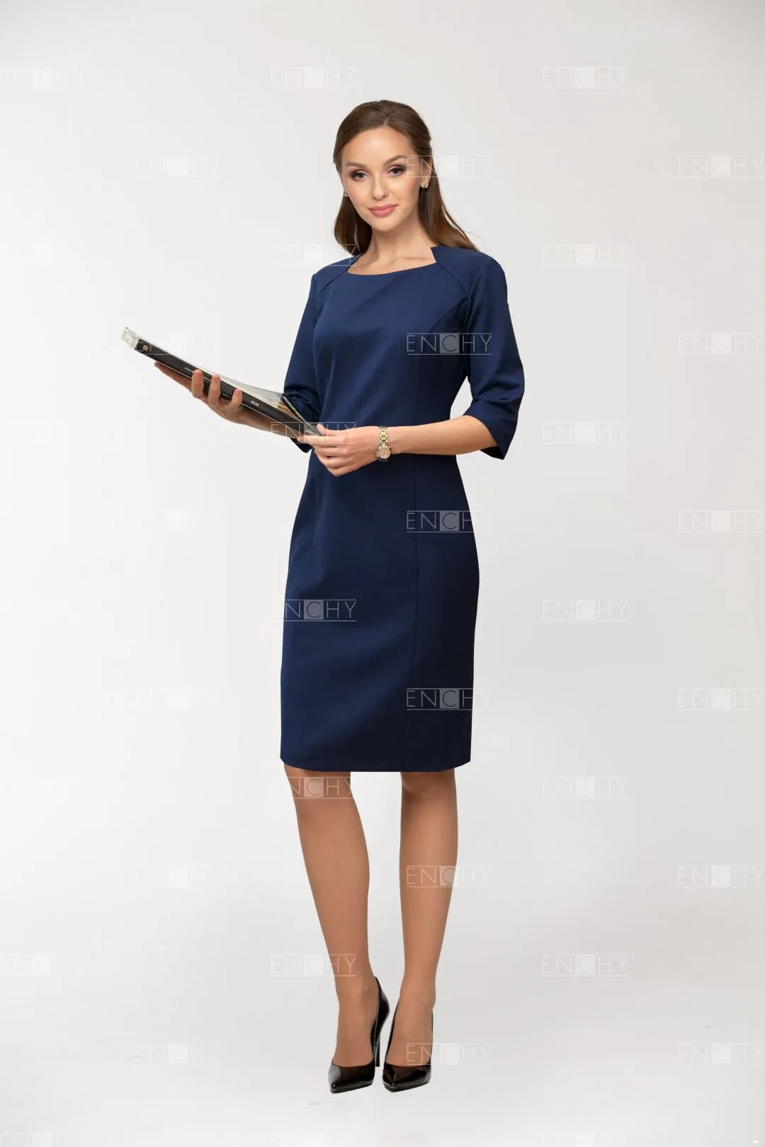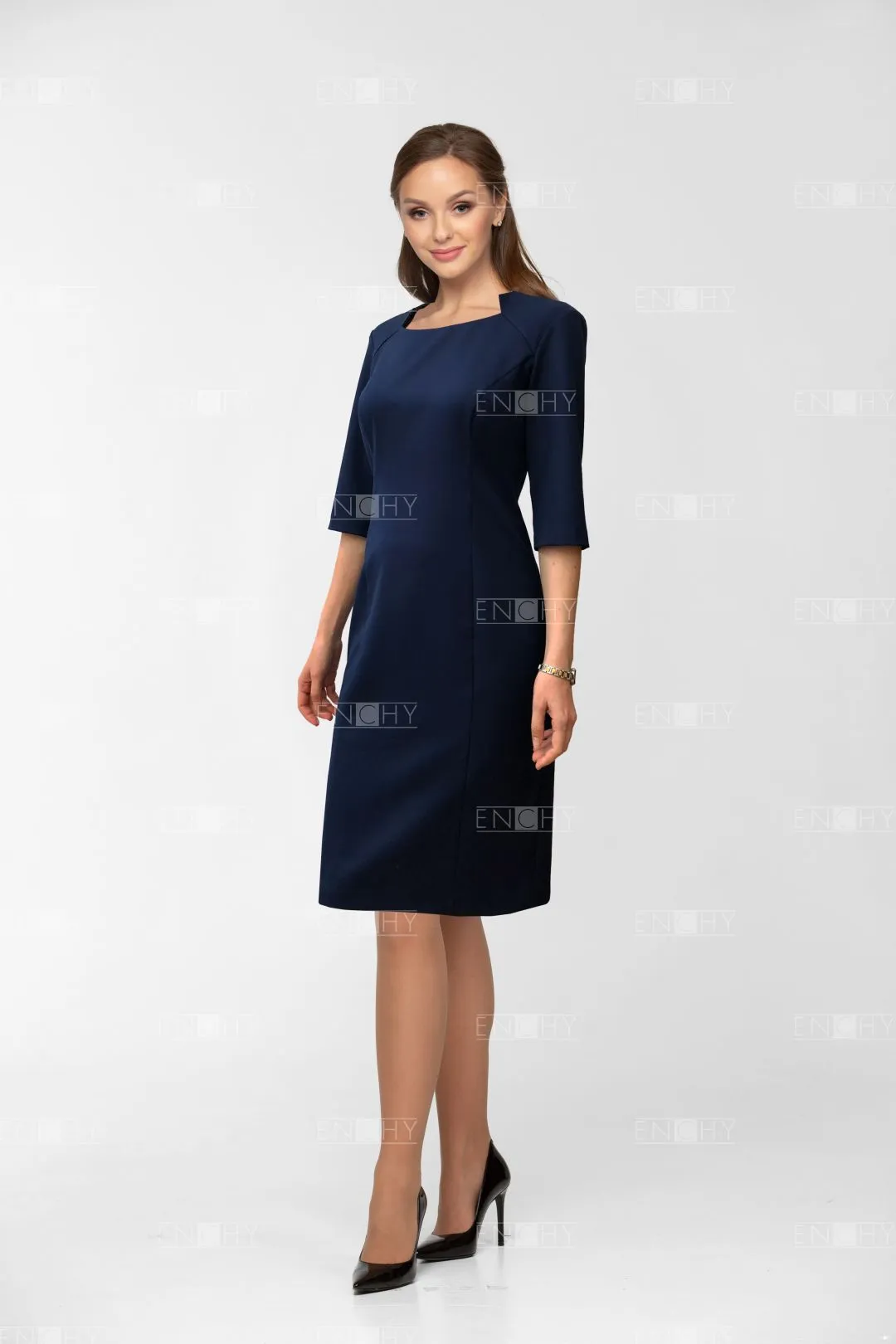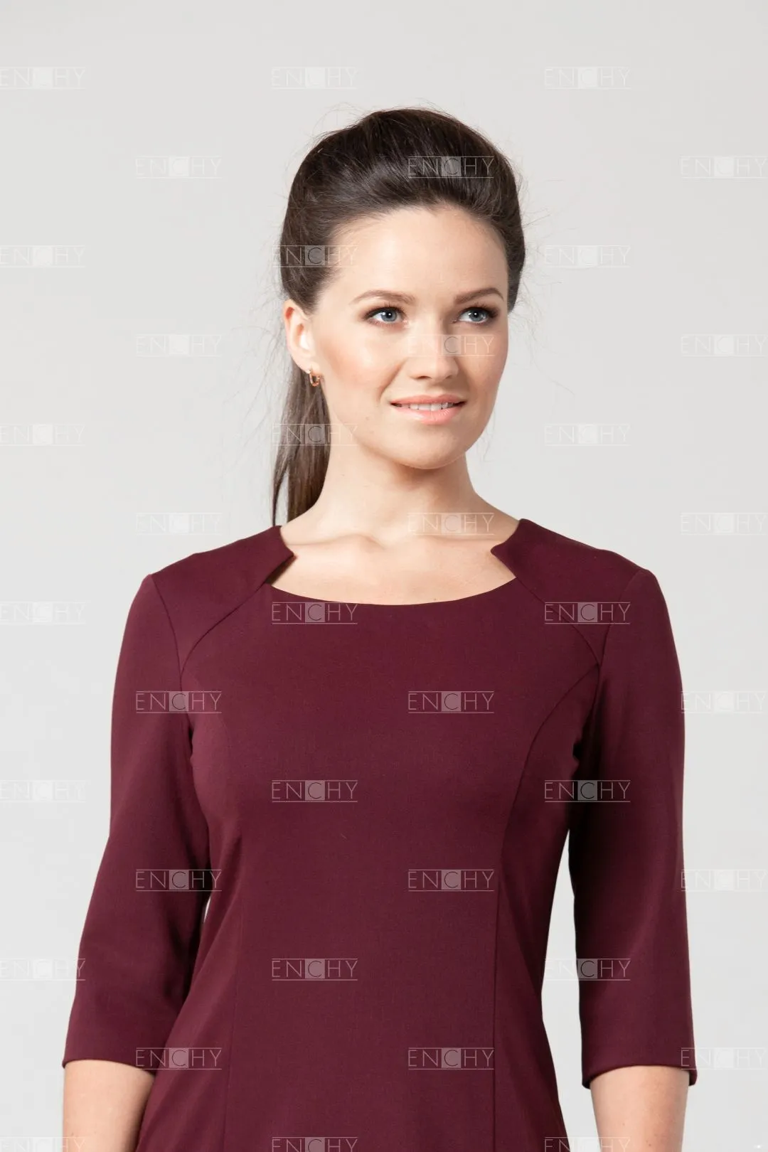 Платье универсального кроя с оригинальным вырезом горловины и удобным рукавом 3/4 покоряет простотой и элегантностью! Сзади застежка-молния и шаговая шлица.