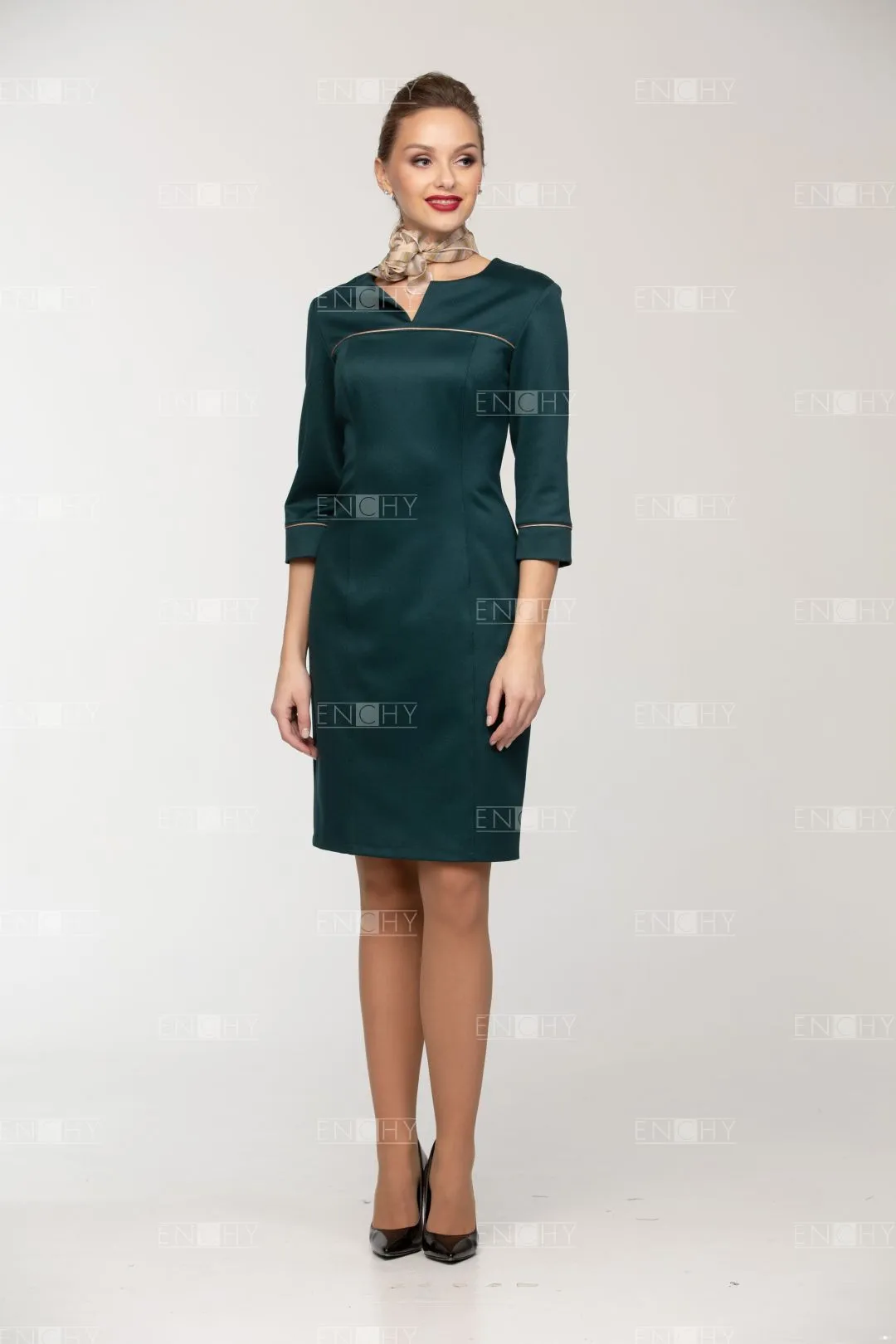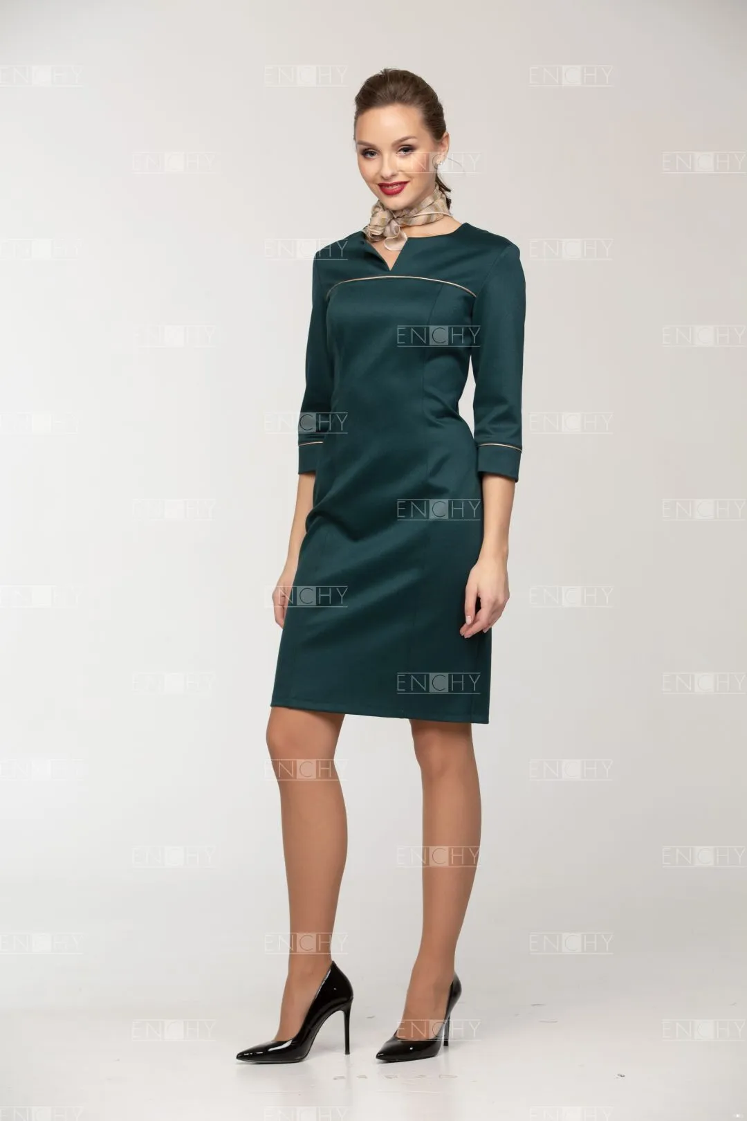 Платье приталенного силуэта с рукавом 3/4. Горизонтальные рельефы по переду и спинке зрительно удлиняют фигуру и делают любой образ элегантным. Кокетка переда имеет небольшой разрез. Рукава с притачными манжетами. Застежка в среднем шве спинки. Сзади предусмотрена шлица. Дизайн платья отлично подойдет для автосалонов, ювелирных сетей и салонов красоты, а так же для офиса и авиакомпаний. Отрезные манжеты и кокетка позволяют дополнить образ кантами.