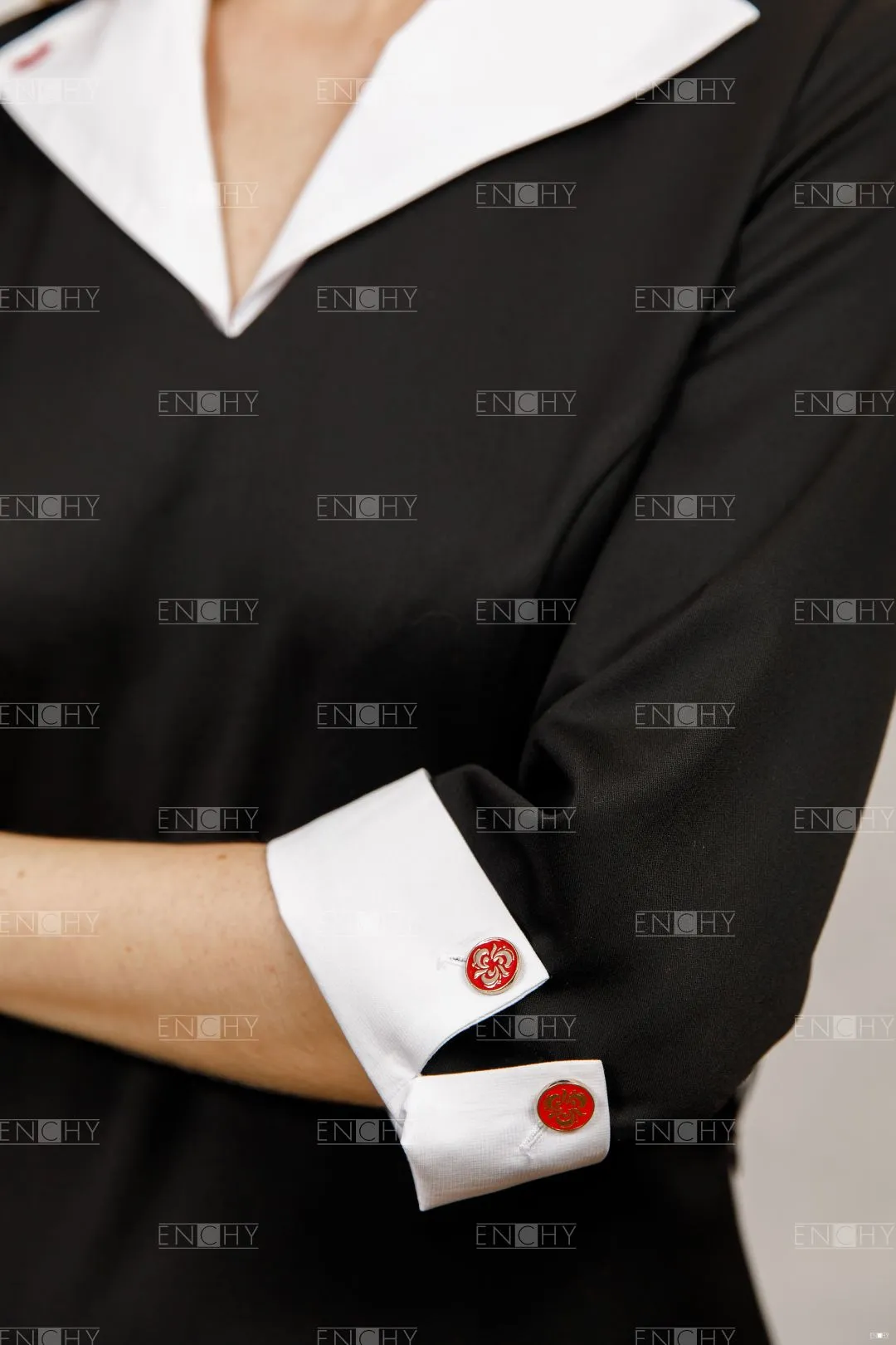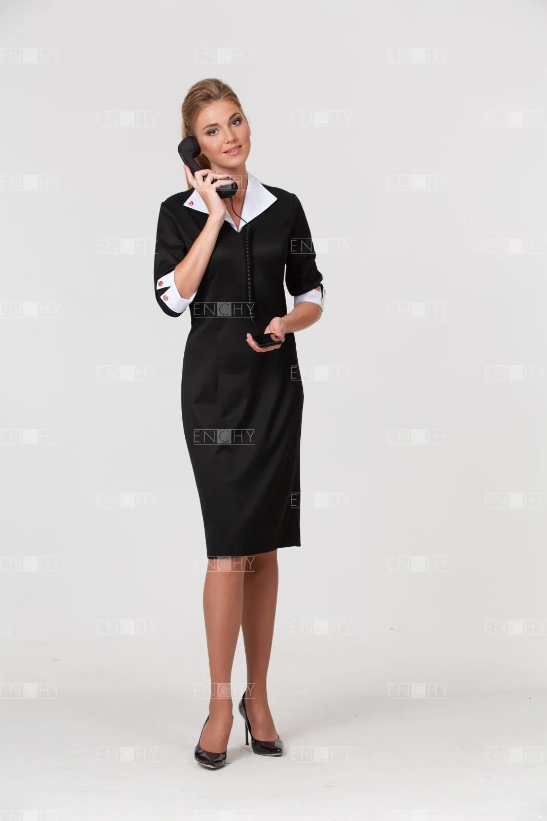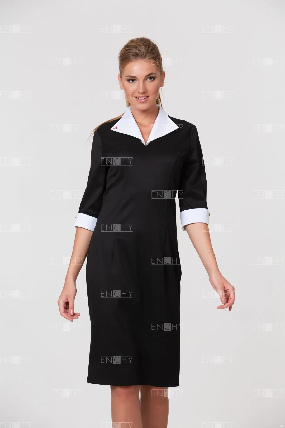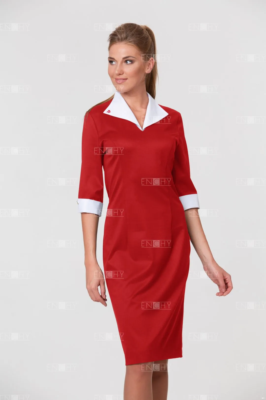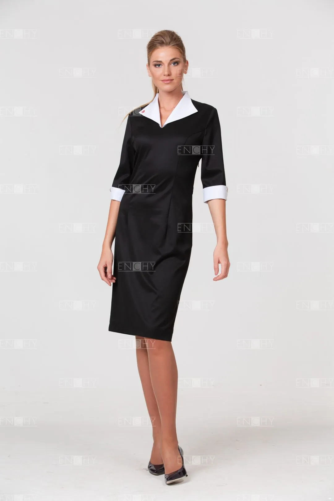 Строгое платье полуприлегающего силуэта со съемными воротником-апаш и манжетами стильно смотрится в деловом и авиа-мире. Длина платья как никогда актуальна: ниже колена. Платье можно дополнить контрастным ремешком.