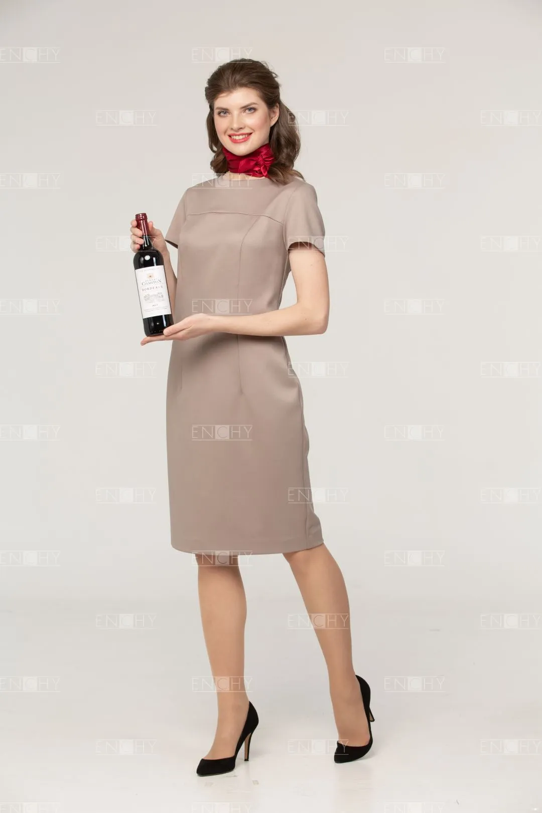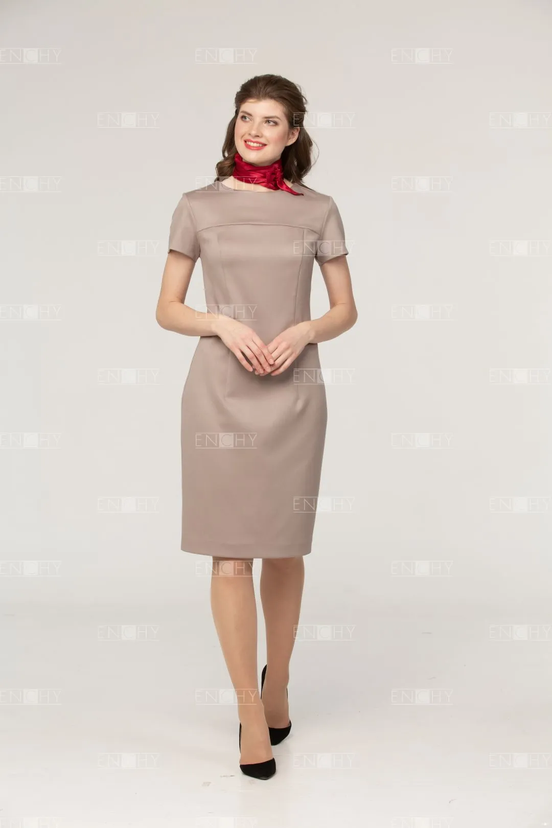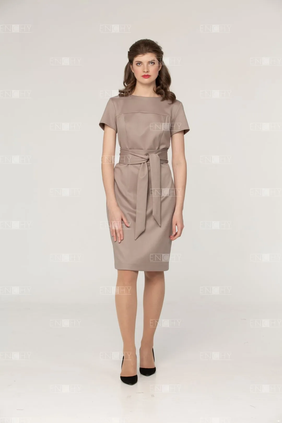 Платье приталенного силуэта с кокеткой и нагрудными рельефами. Платье имеет небольшой рукав-крылышко. Талию визуально акцентирует тканевой пояс, который может быть изготовить в вашем фирменном цвете.