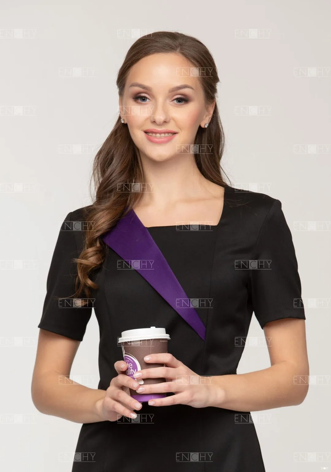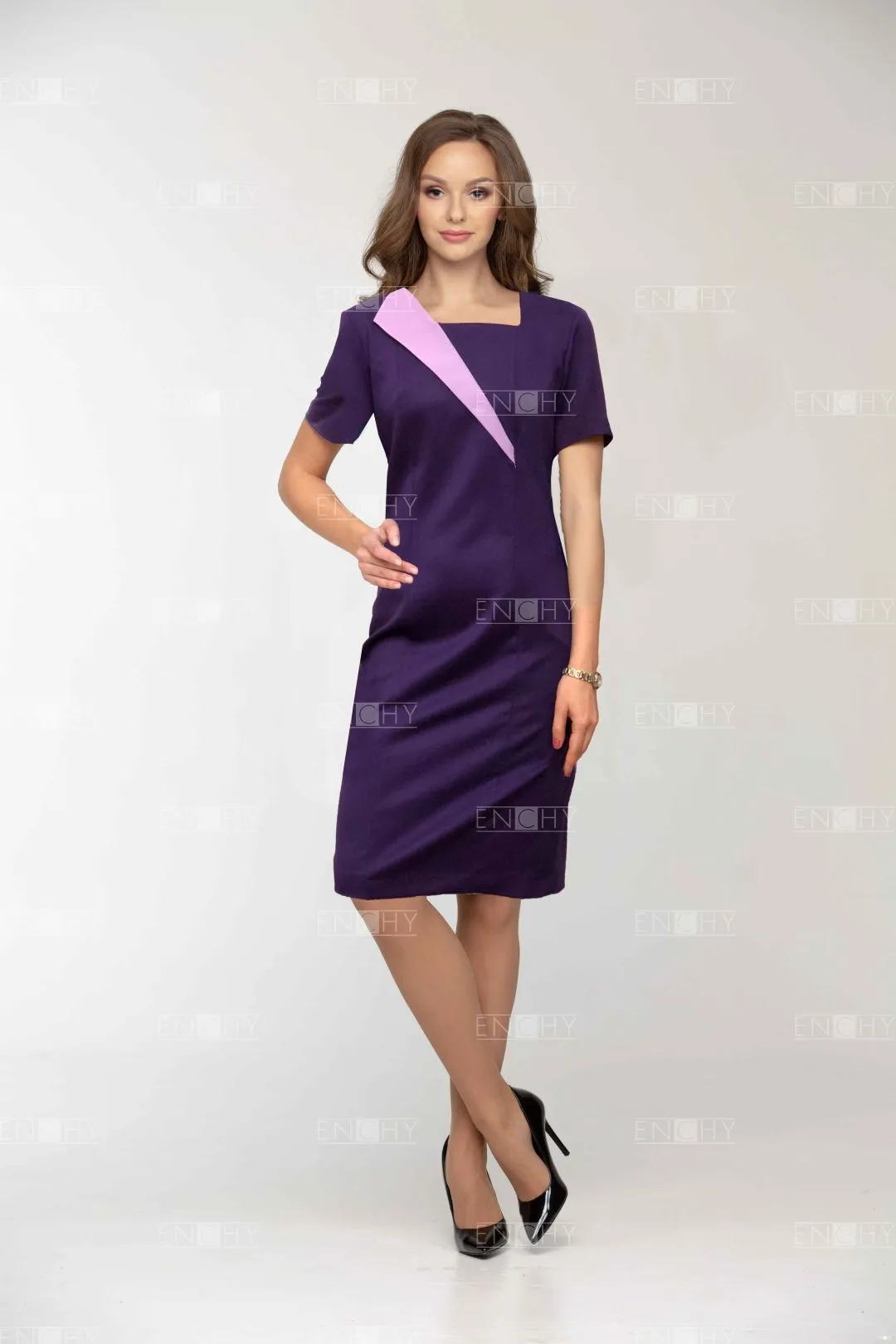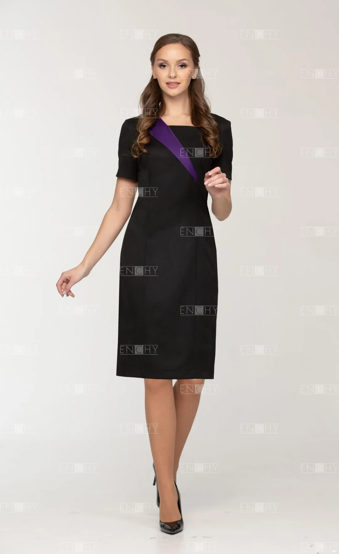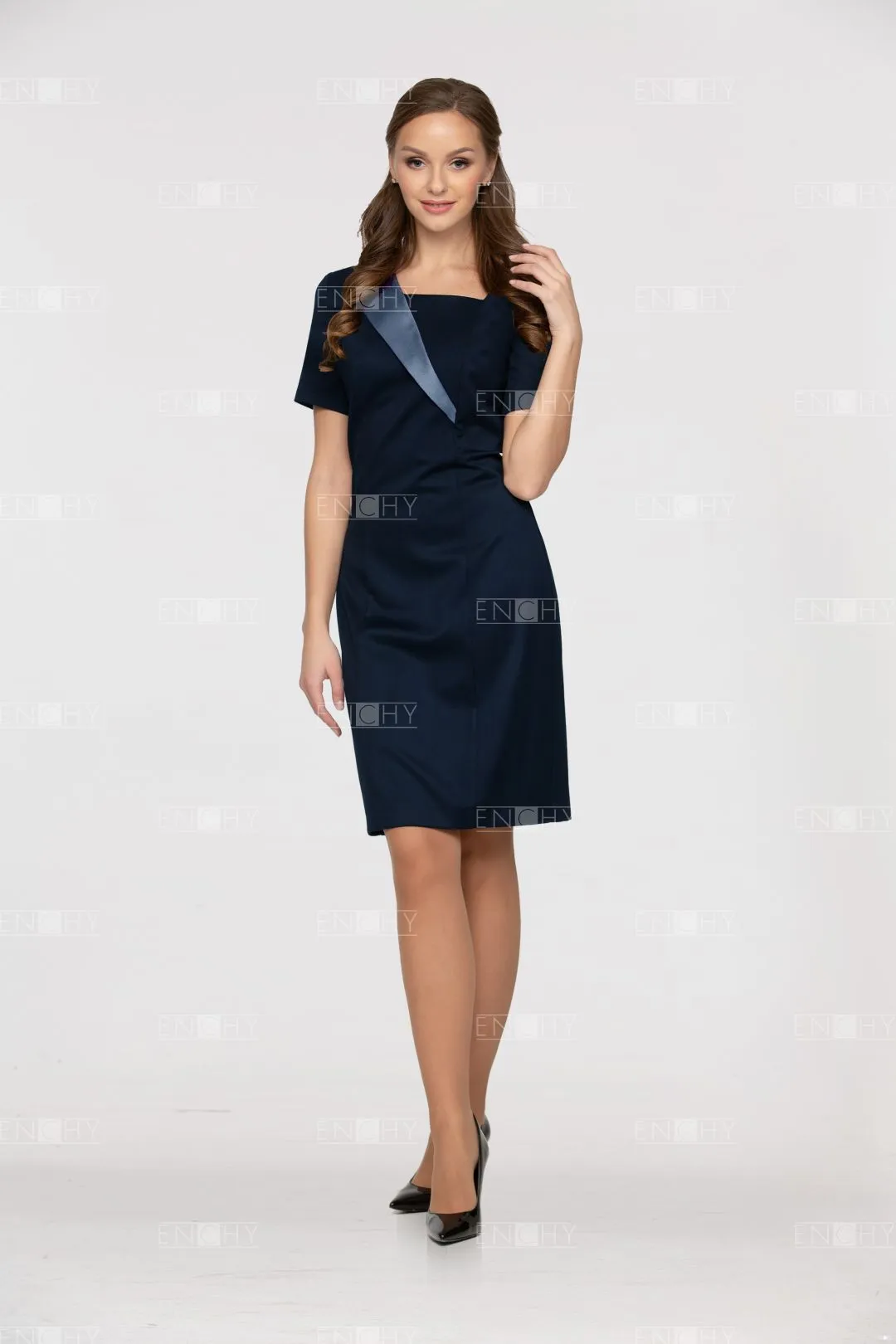 Платье приталенного силуэта с рельефами. Платье имеет короткий рукав. асимметричная вставка в области воротника придает остроты образу, вставка может быть изготовлена в вашем фирменном цвете.