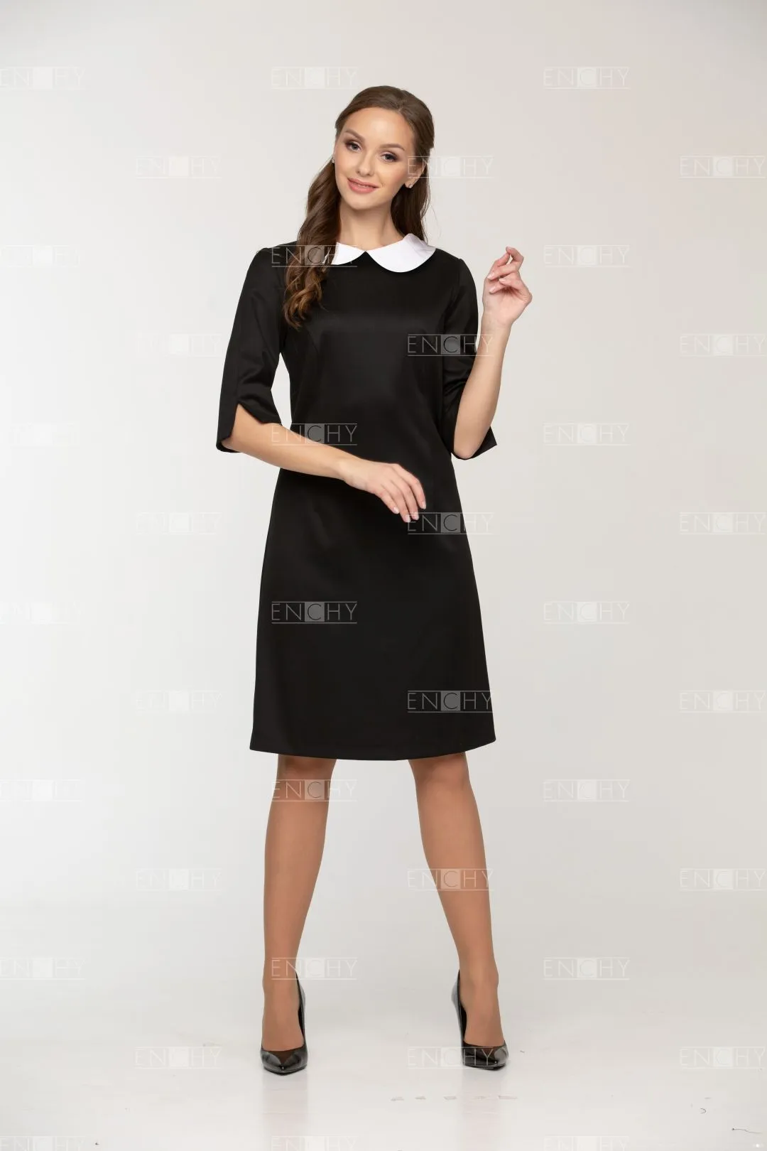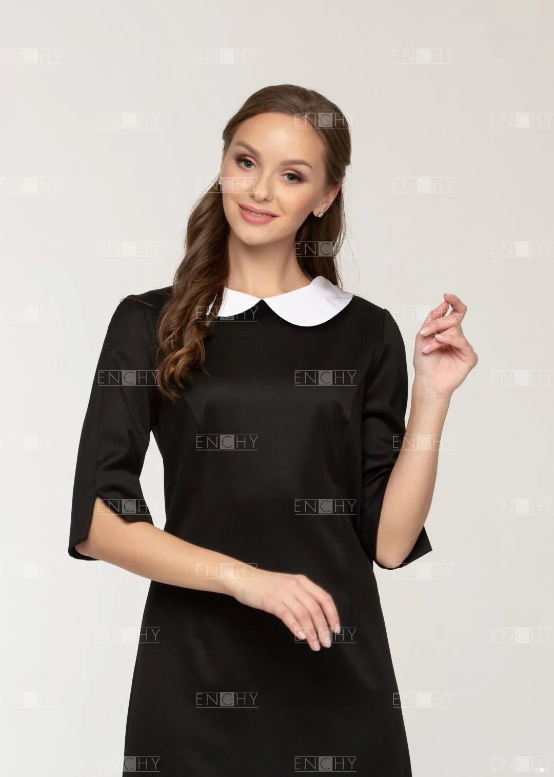 Модное платье полуприлегающего силуэта со съемным воротником - практичное решение для корпоративной формы. Рукав платья оформлен манжетой с разрезом, что придает элегантности образу. Платье подойдет дамам разной комплекции! Юбка платья немного расширена к низу. Для вашего удобства прилагается два воротничка, на смену.