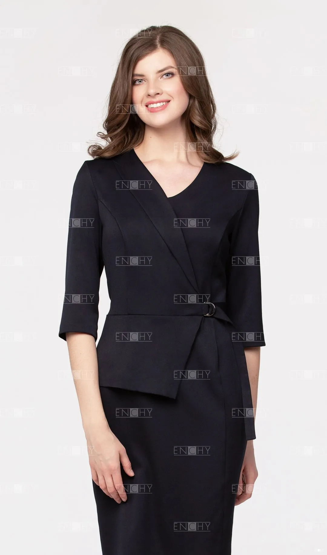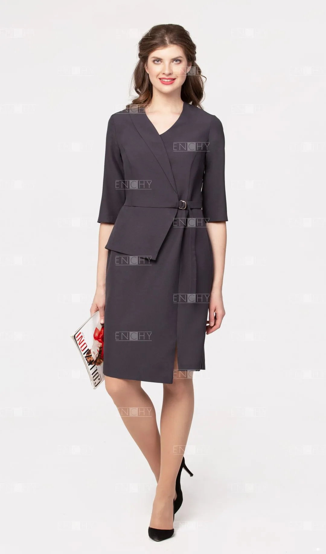Платье приталенного силуэта с рукавом 3/4. Рельефы переда и спинки обеспечивают великолепную посадку. Платья имеет необычную геометрию и стильный дизайн. Правая часть переда имитирует накинутый жилет с шалевым воротником. Композицию дополняет пояс и кокетливый разрез в продолжении левого рельефа юбки. Современный и динамичный подчеркнет стиль вашей компании.