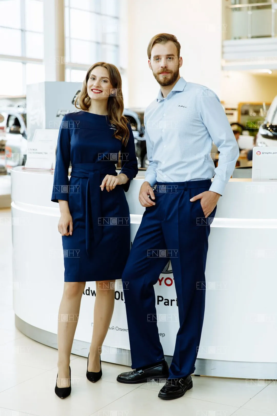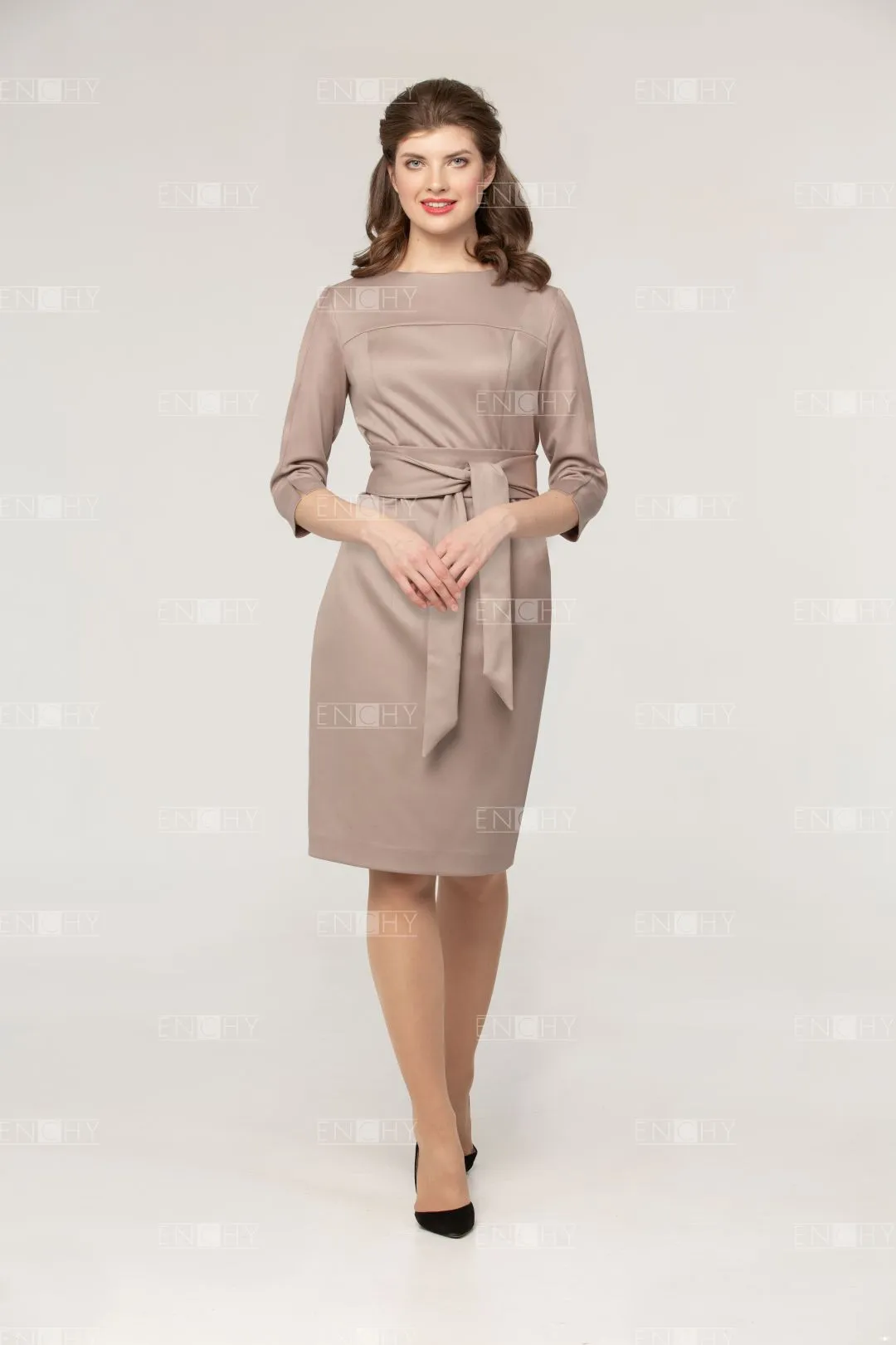 Платье приталенного силуэта с кокеткой и нагрудными рельефами. Платье имеет рукав 7/8 в кокетливым разрезом. Талию визуально акцентирует тканевой пояс, который может быть изготовить в вашем фирменном цвете.