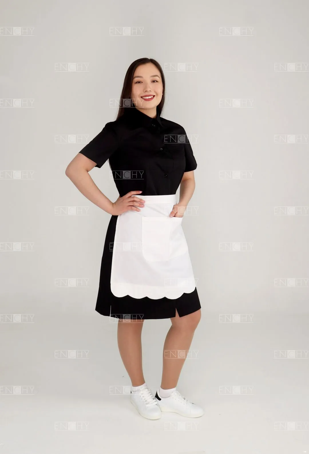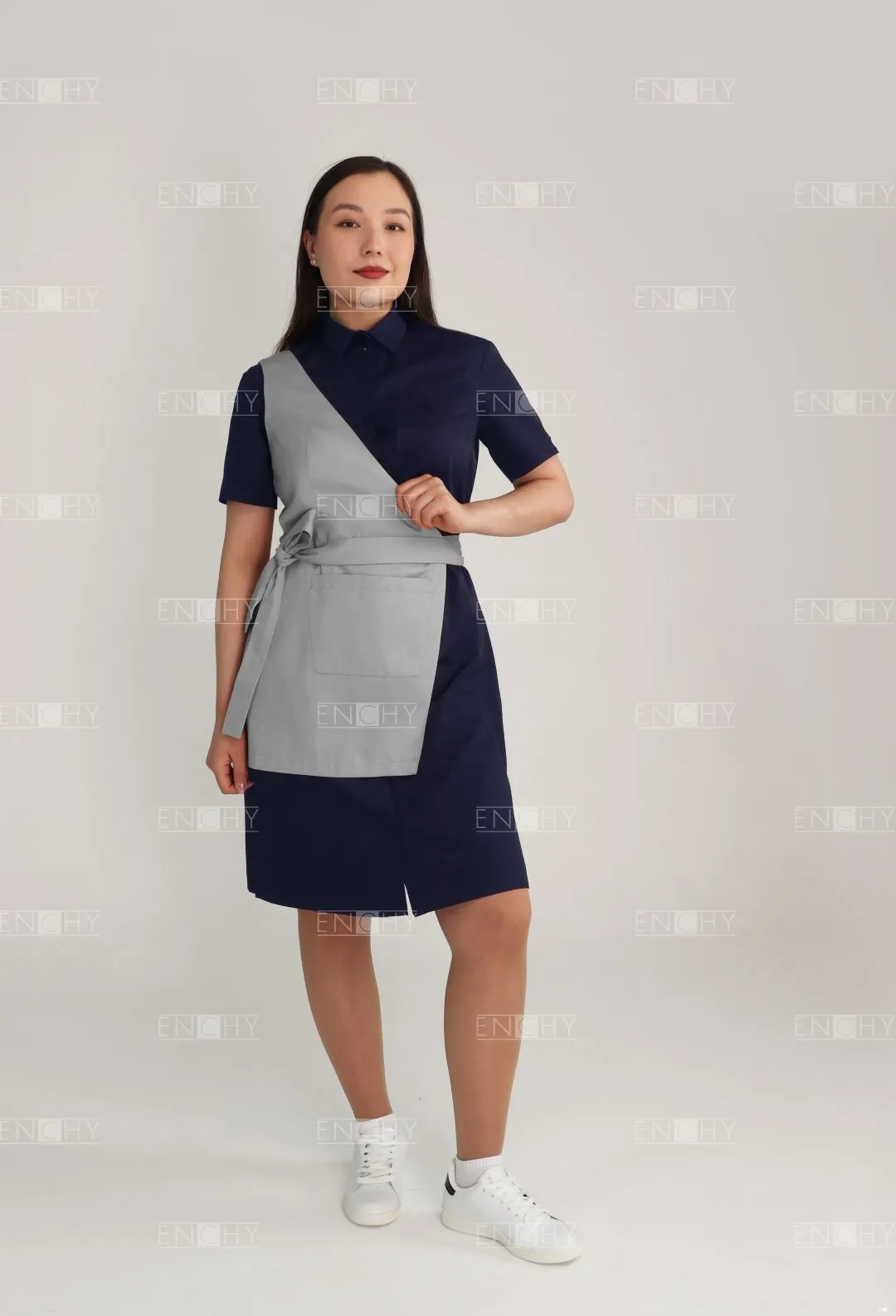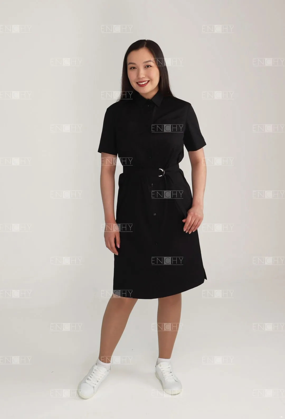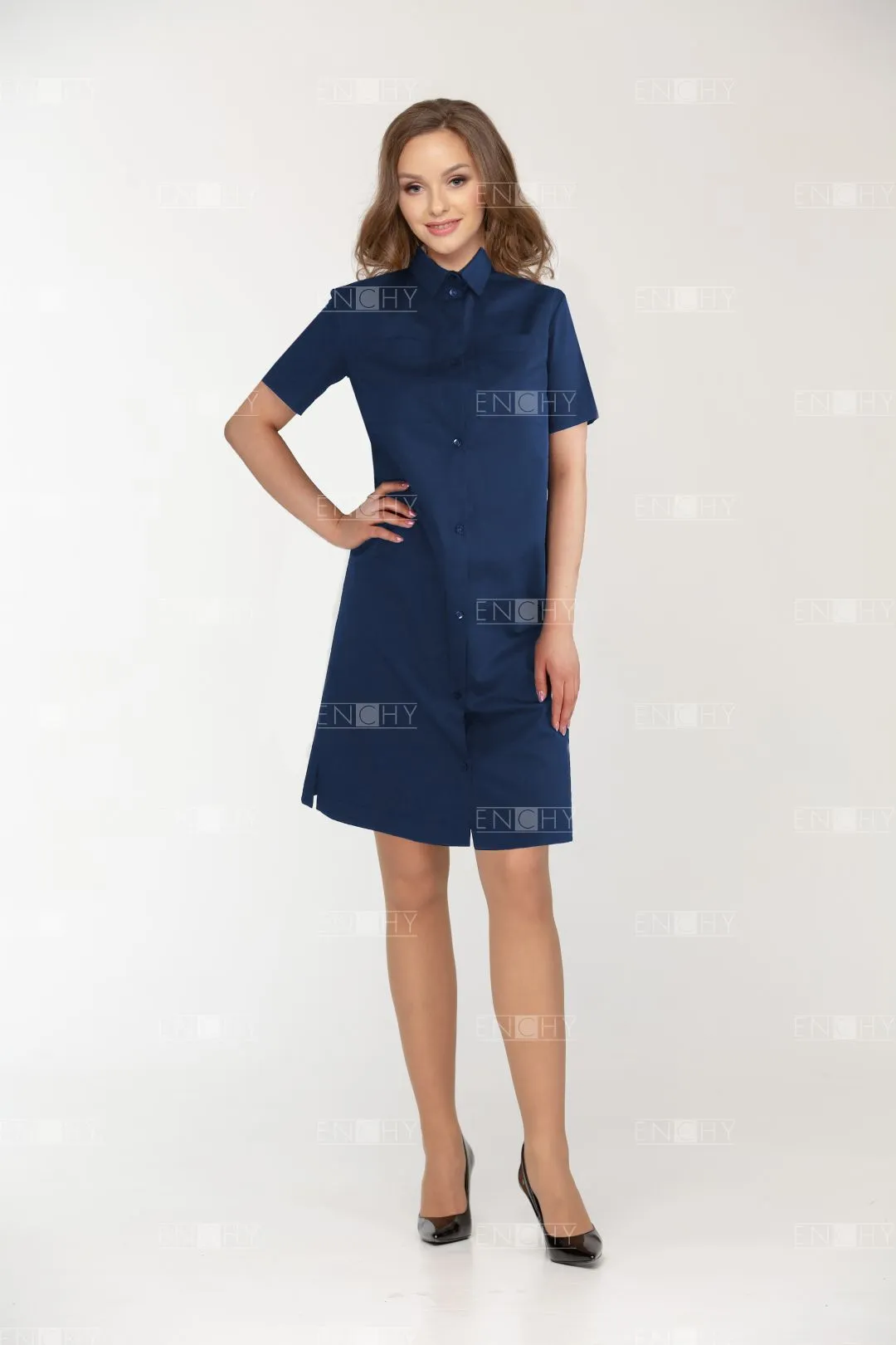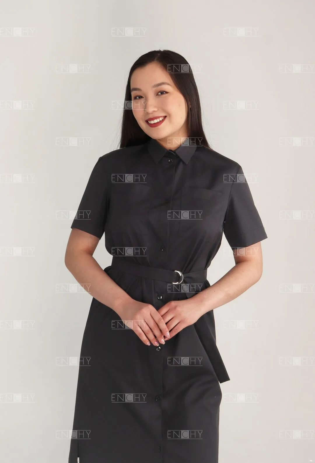 Стильное легкое платье прямого силуэта, с коротким рукавом и съемным поясом на полукольцах. Платье застегивается на пуговицы, на переде два нагрудных кармана с клапанами и 2 кармана в боковых швах. Платье можно использовать как легкий вариант летней формы, как платье для горничных в сочетании с передником. Бежевый цвет в сочетании с накладными карманами с клапанами и общим кроем создадут актуальный образ в стиле "сафари".