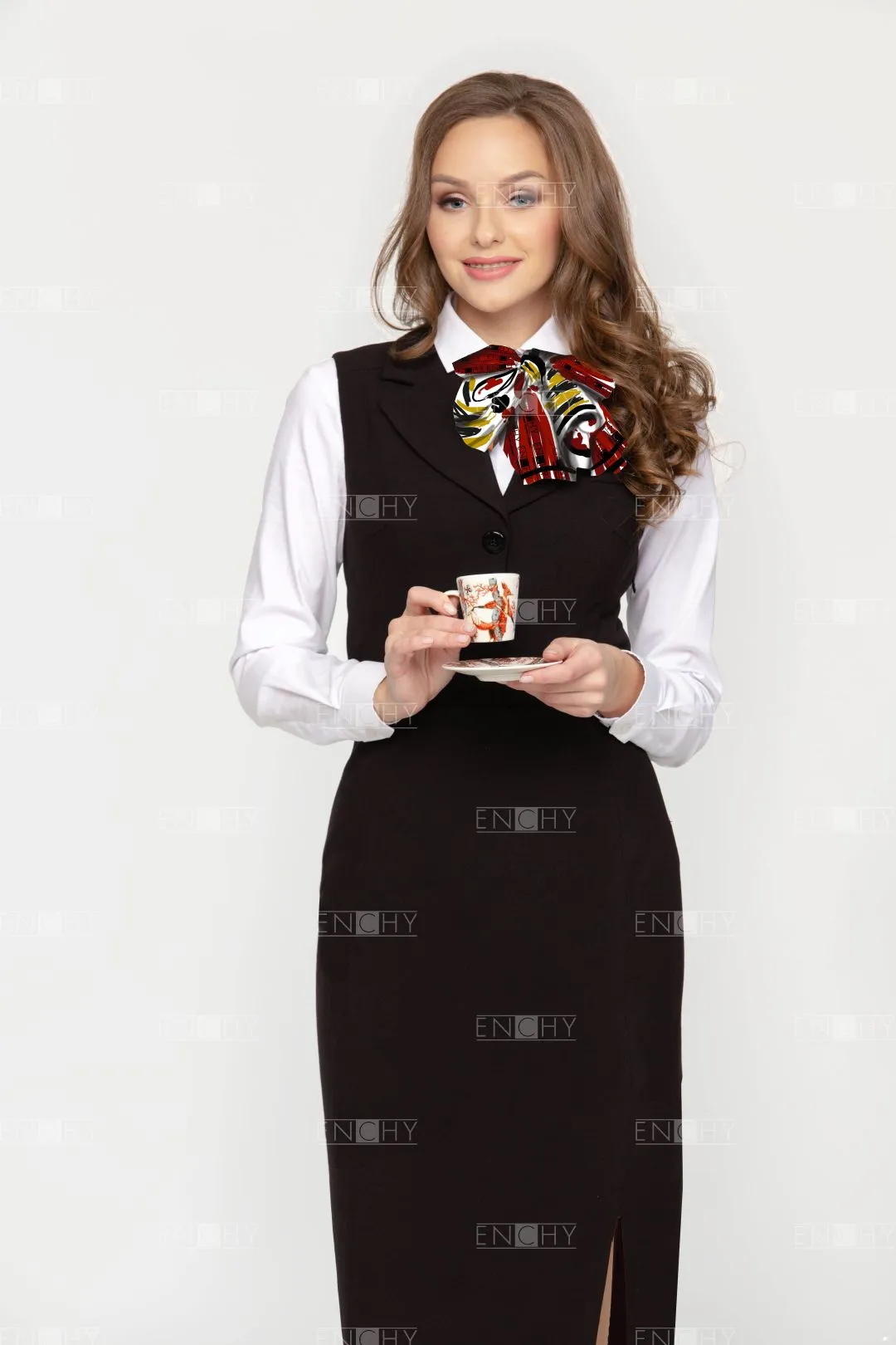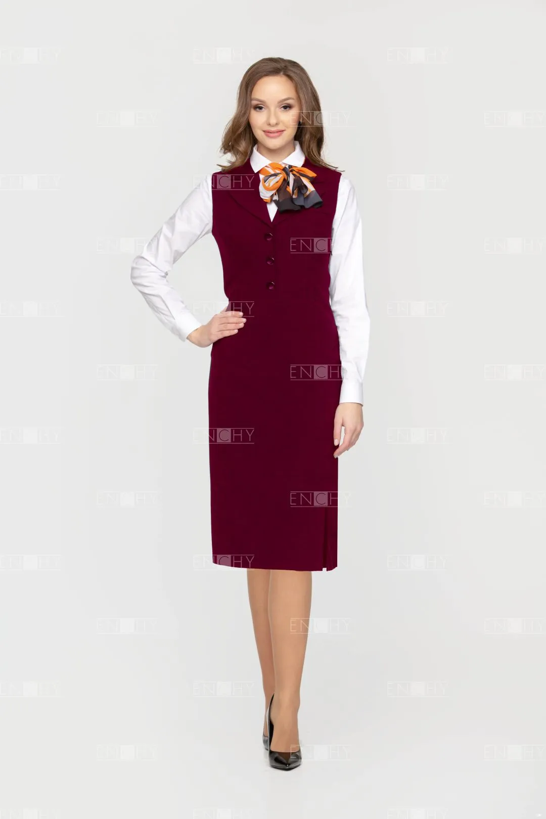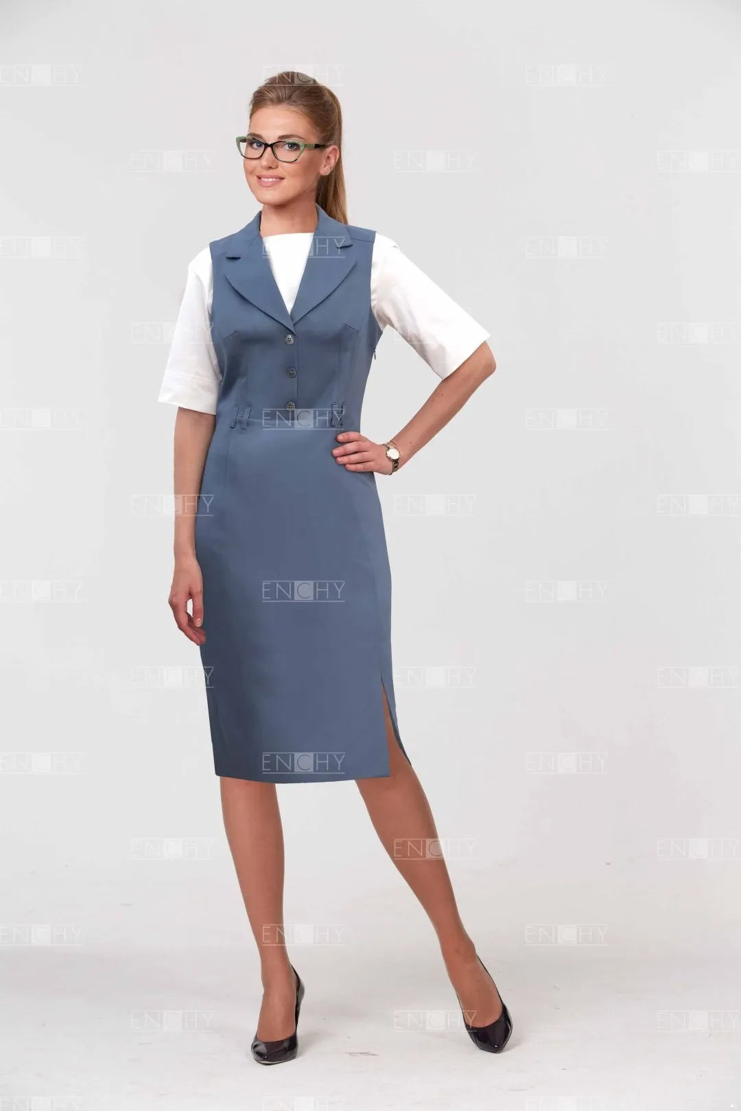 Платье-сарафан в корпоративном стиле со стояче-отложным воротником отлично подойдет для офиса. Вертикальные линии, приталенный силуэт, разрез в левом рельефе переда визуально вытягивают фигуру. Образ может быть дополнен ремнем, кантами, контрастными вставками и платками и галстуками. Можно носить с любой блузой. Аксессуары не входят в стоимость платья.