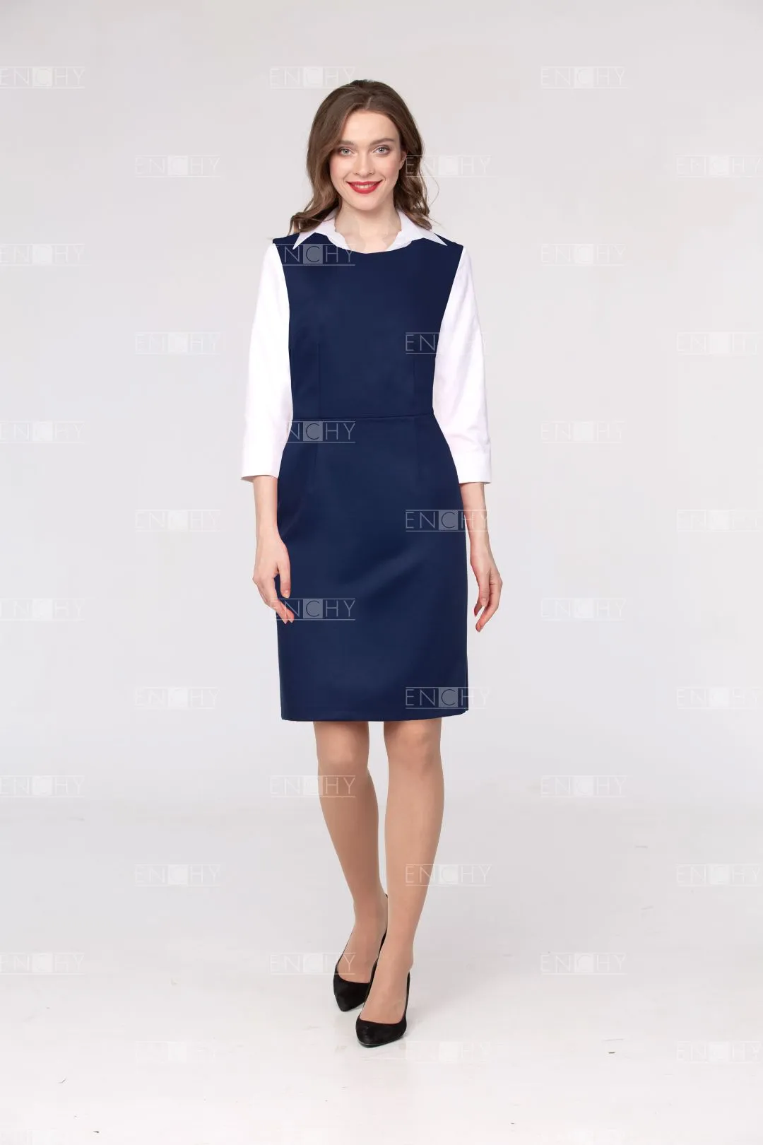 Совершенный офисный стиль! Лаконичный и актуальный, он выражен в этом приталенном сарафане простой формы без подкладки: спереди вытачки и отрезная линия талии. Сзади вытачки, потайная застежка-молния и шаговая шлица. Сарафан можно дополнить ярким узким поясом*, который подчеркнет талию.
