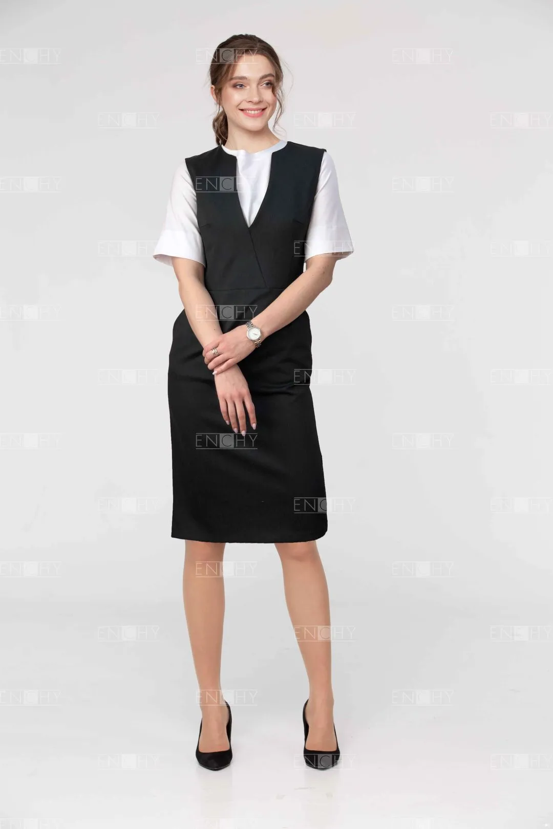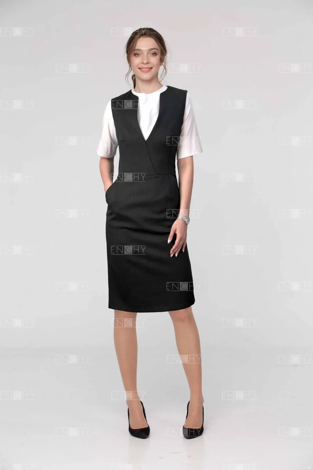 Оригинальное платье-сарафан модного кроя напоминает надетые вместе юбку и жилет. Платье приталенное, подчеркнуто поясом*. Красивый вырез горловины позволит сделать акцент на корпоративном аксессуаре. По бокам карманы с косым входом. Сзади молния и шаговая шлица.