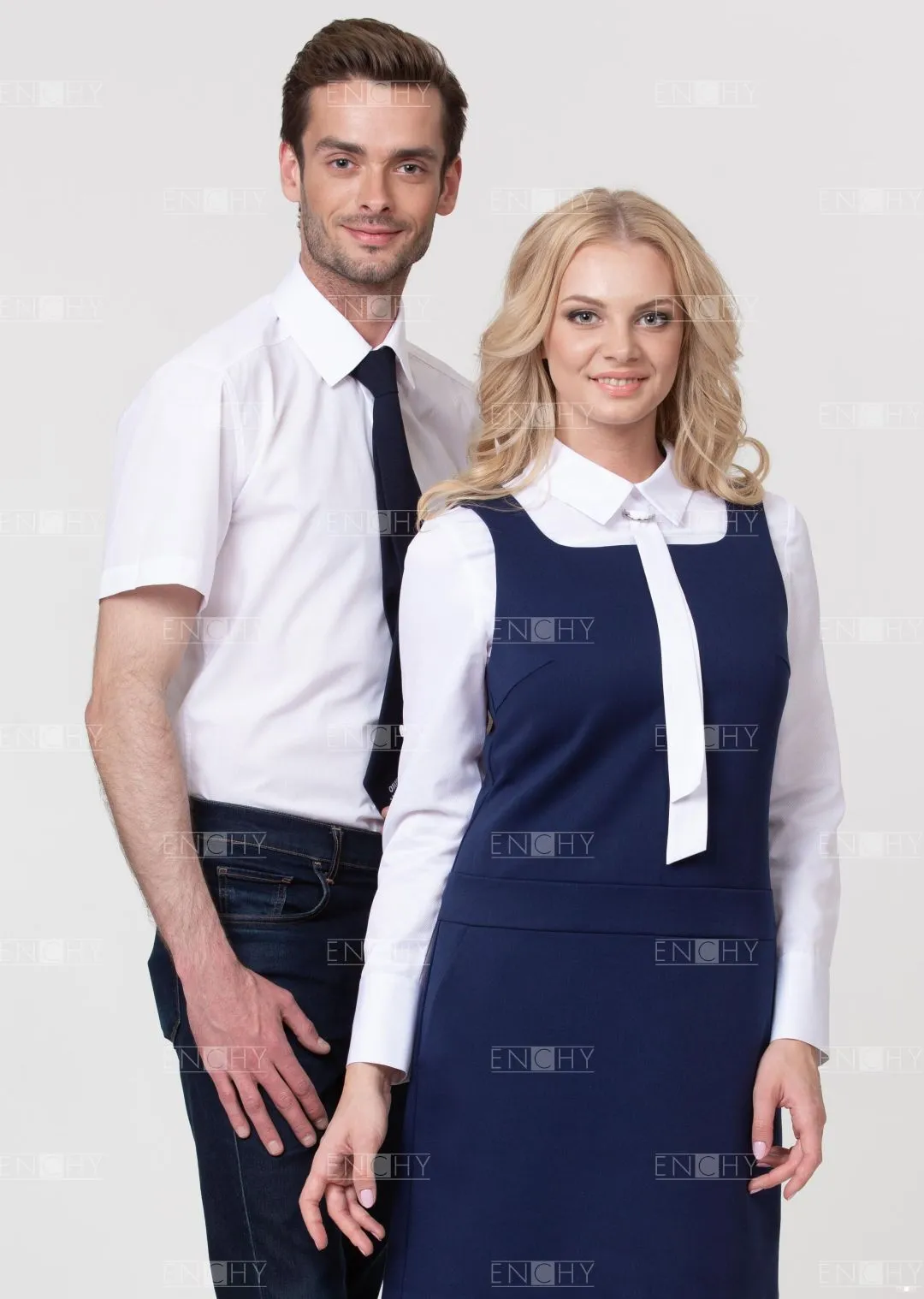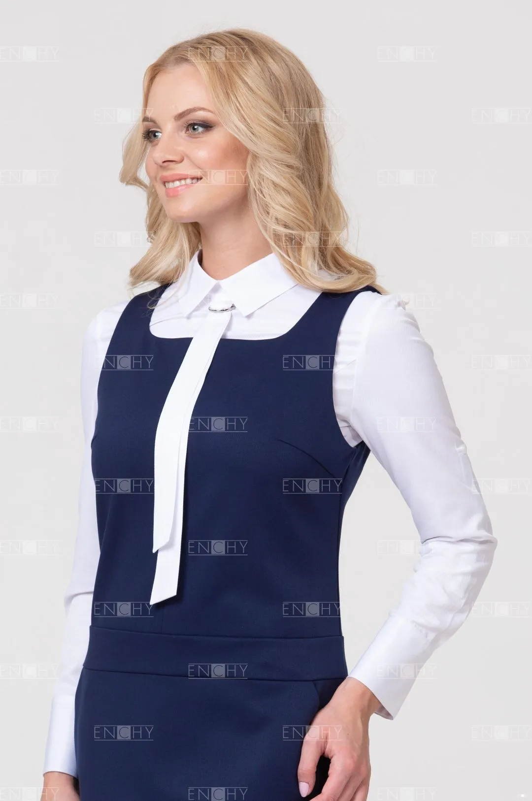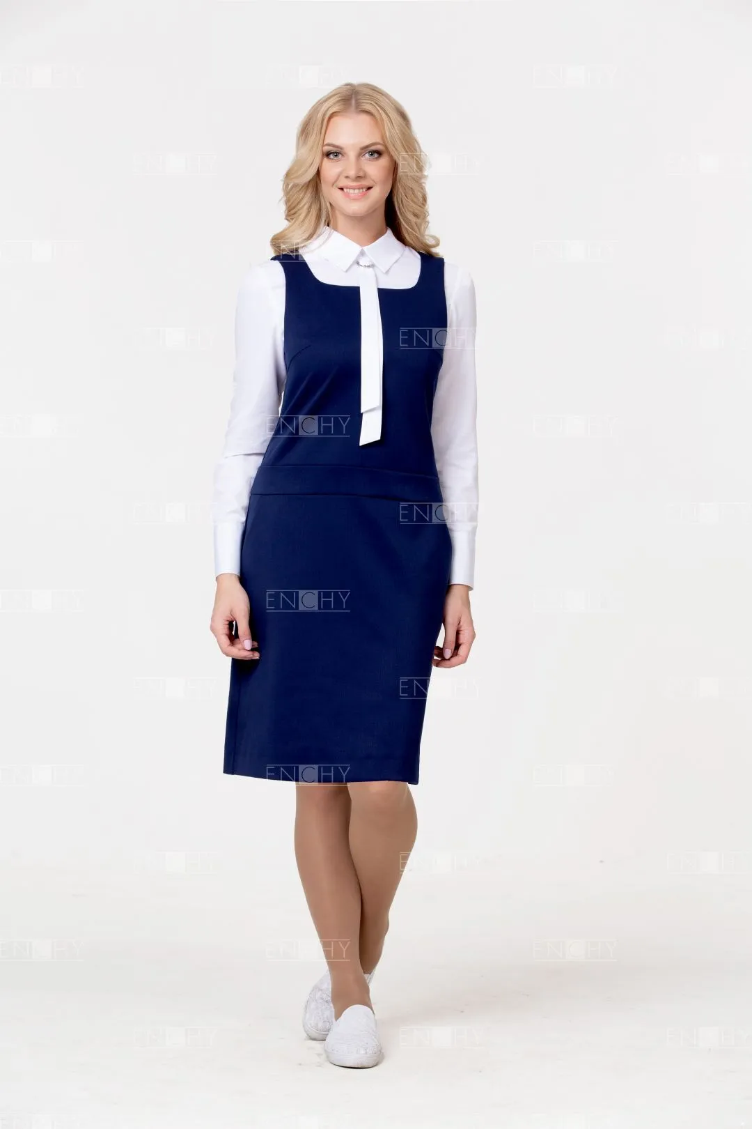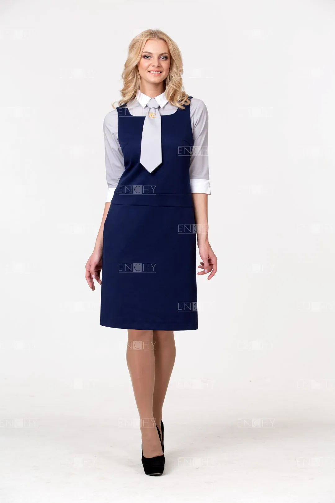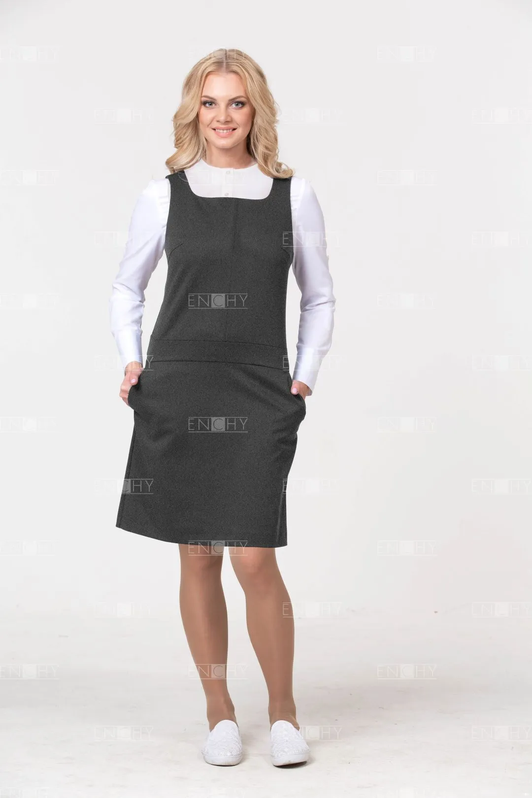 Универсальная и стильная модель: заниженная линия талии и А-образная юбка позволяют сидеть сарафану безупречно! Красивый вырез акцентирует внимание на галстуке или корпоративном платке. Боковые карманы завершают образ.