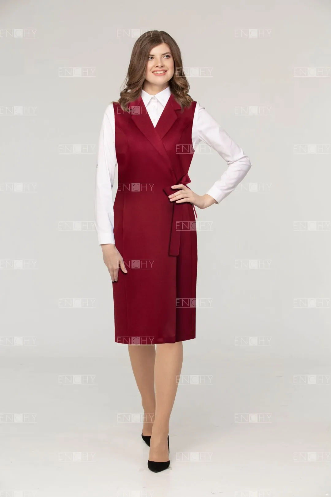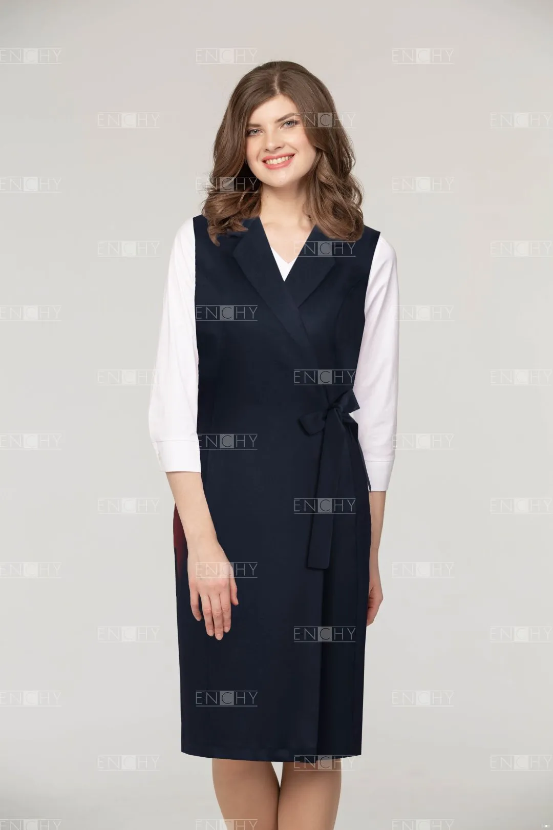 Стильный и универсальный сарафан на запах с воротником с отворотами лацканов. Модель имеет посадку, как уАрт.9912. Модель завязывается на пояс, внутри имеется хлястик с пуговицами и петлями. Такой силуэт отлично сядет на разные типы фигур, а за счет регулировки по талии, сарафан станет отличным решением для коллективов с частой сменой персонала.