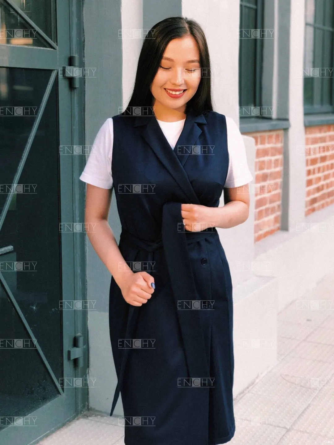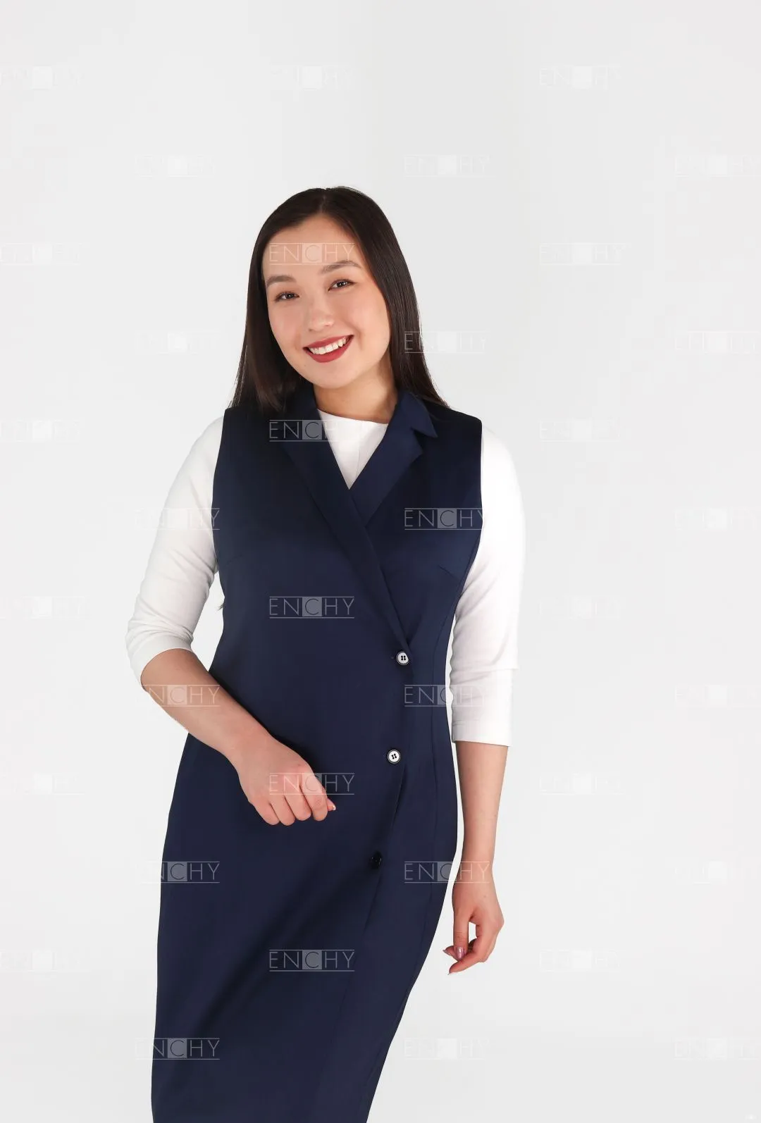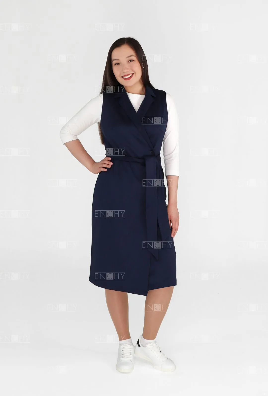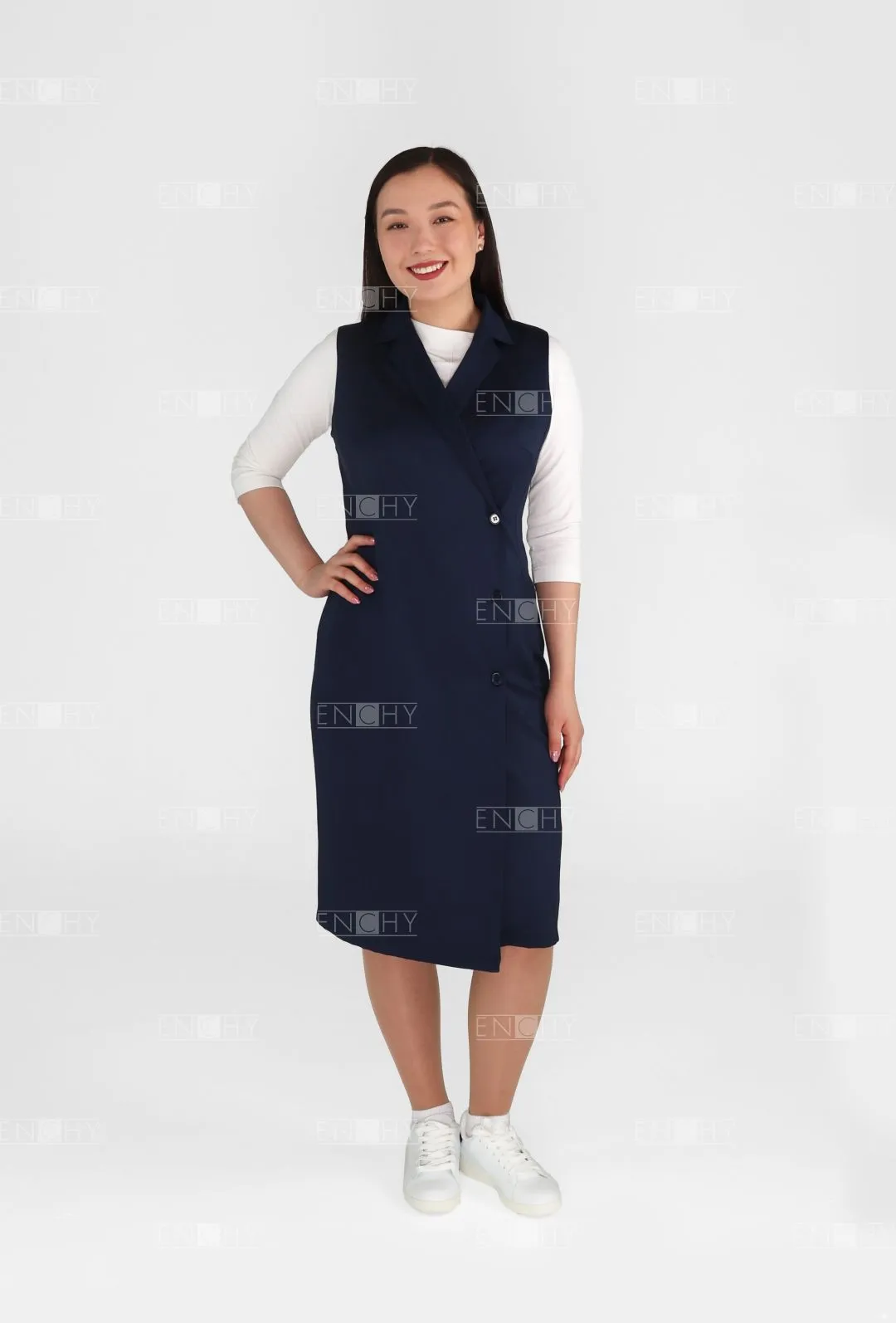 Двубортный сарафан полуприлегающего силуэта с отворотами лацканов подойдет любому типу фигуры. Демократичный крой позволяет комбинировать сарафан с брюками, делая образ в меру сдержанным, но элегантным.