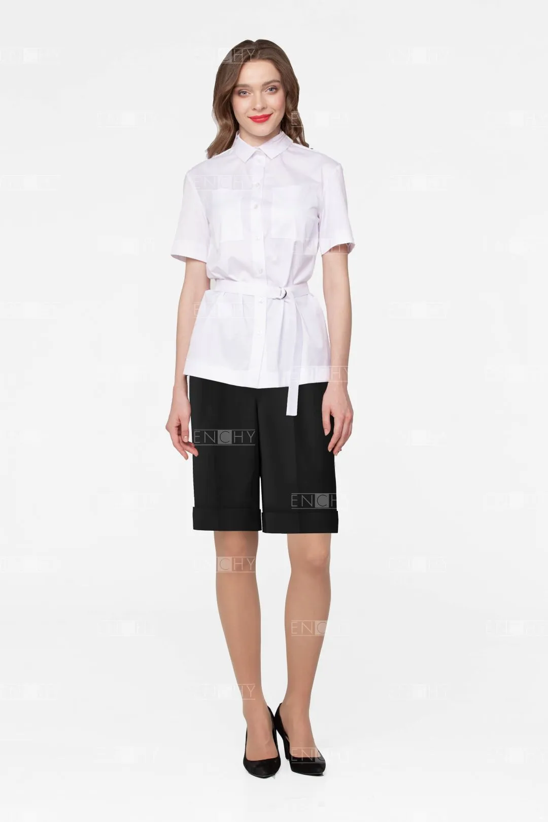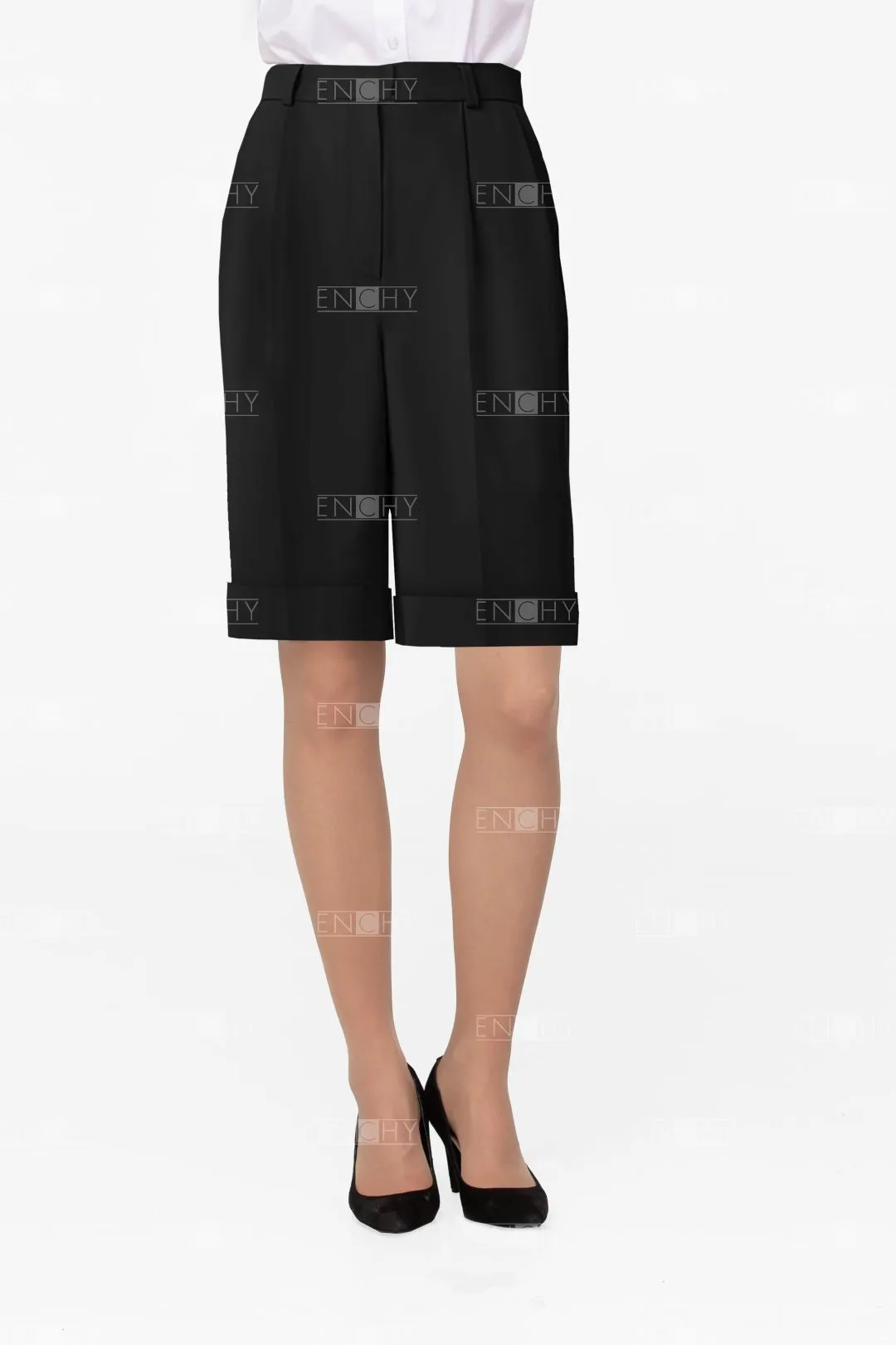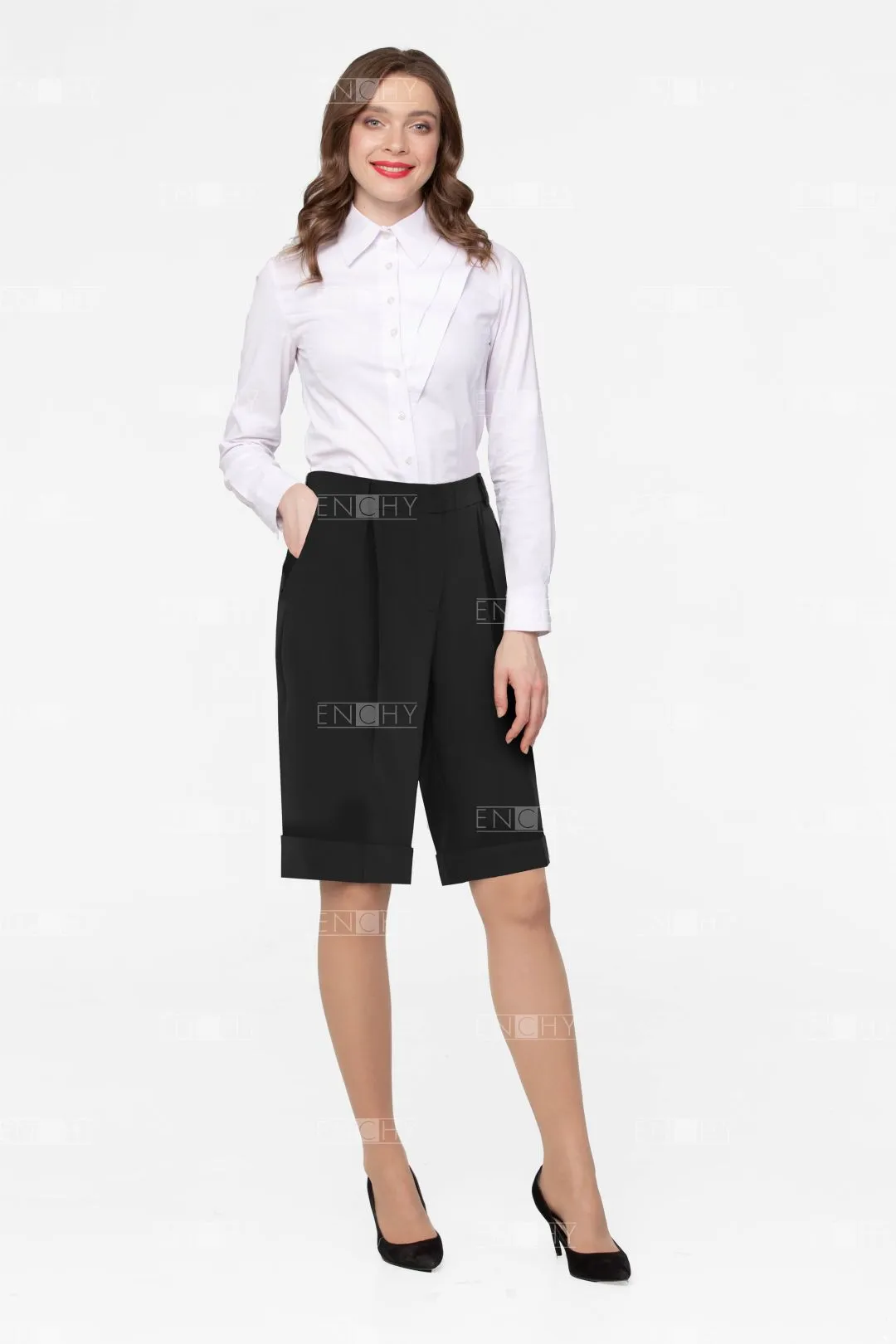 Стильные бермуды с широкими отложными манжетами и защипами, переходящими в стрелки, станут отличным решением для теплого времени года! Застежка на гульфик и откосок, крючки на поясе, карманы в отрезном бочке, длина выше колена, шлевки на переде и спинке. Такой фасон отлично будет смотреться со свободными блузами и жакетами.