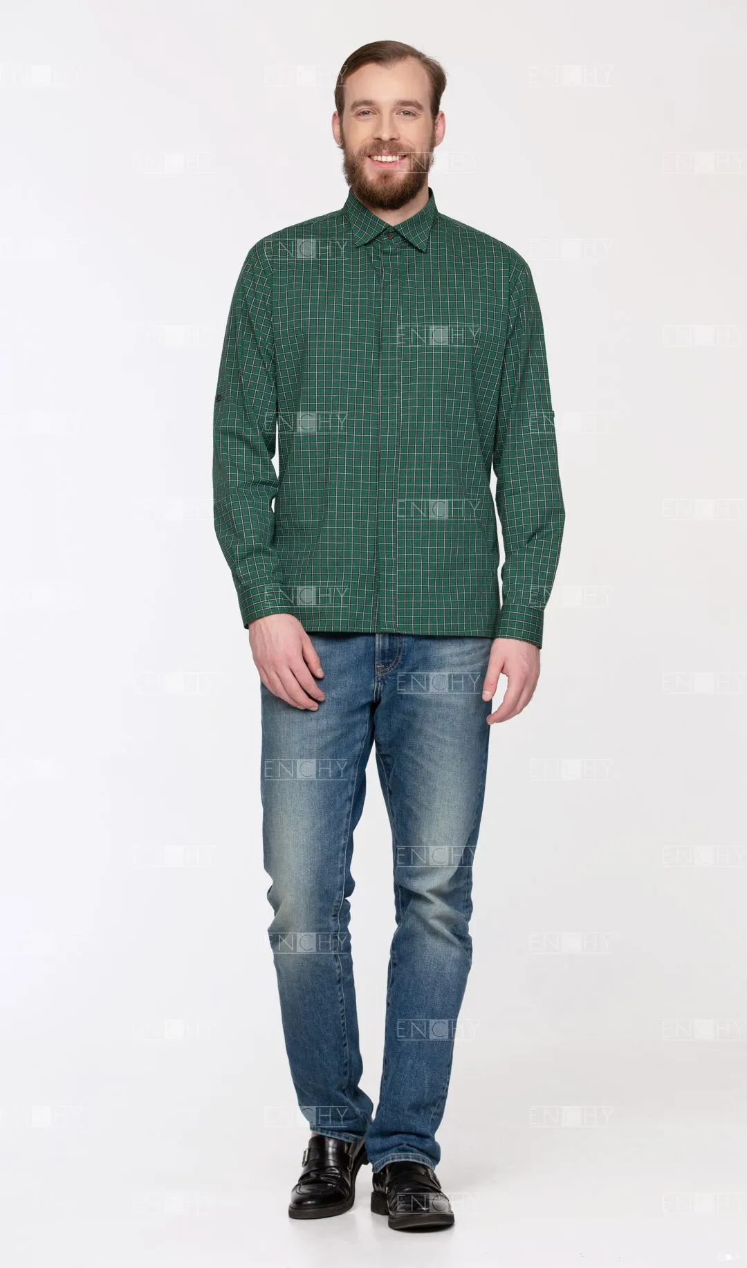 Сорочка полуприлегающего силуэта, небольшого объема, с рельефами и кокеткой на спинке. Специальный воротник под галстук-бабочку. Рукав трансформер фиксируется на пату.