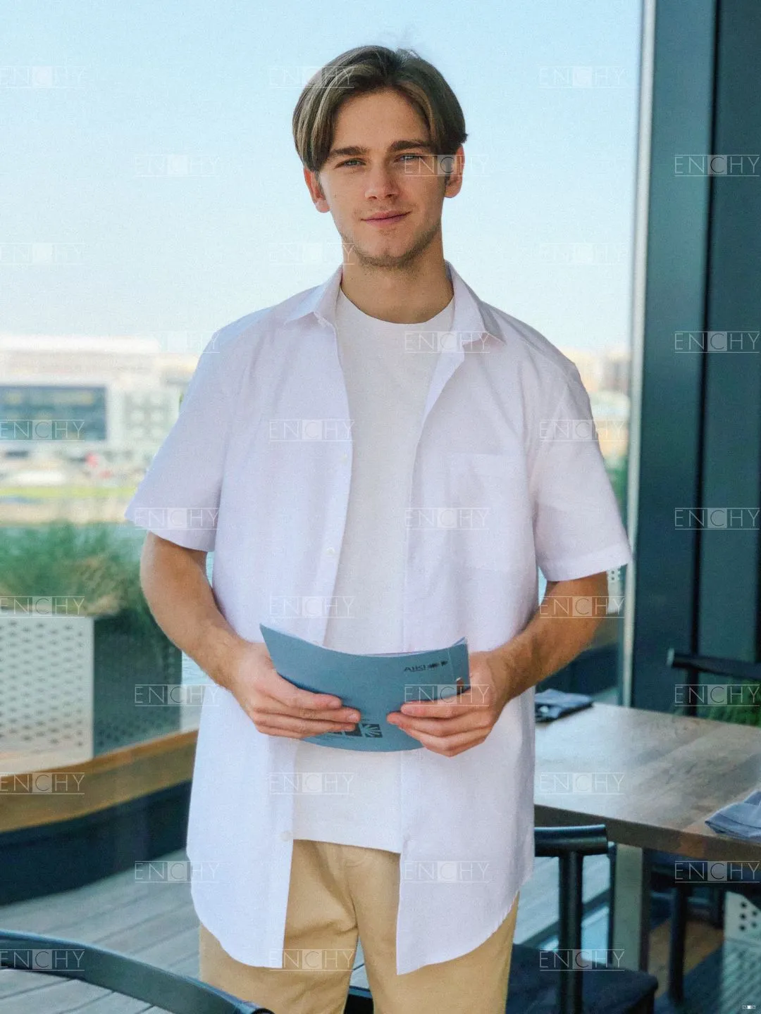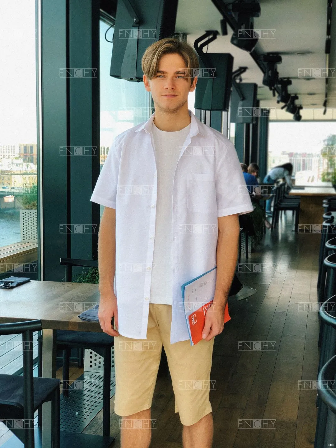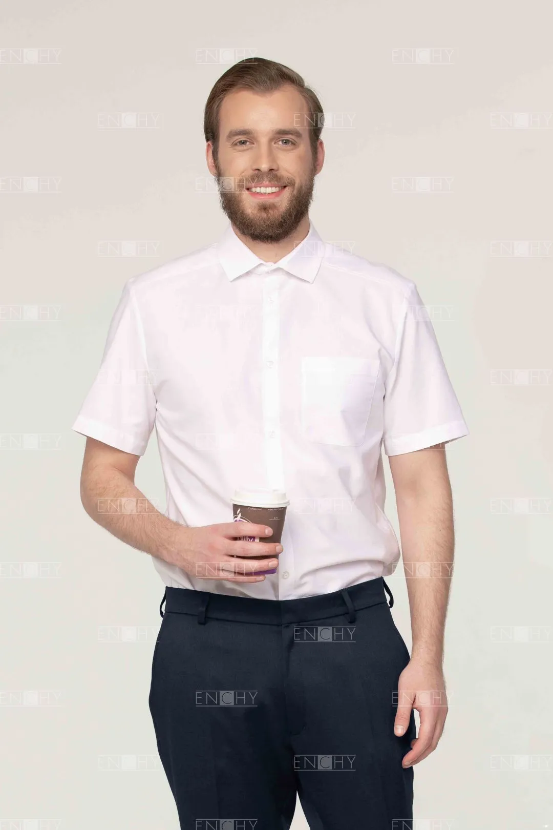Классическая сорочка прямого силуэта, небольшого объема, с коротким рукавом, классическим воротником и застежкой на планку. На переде и спинке имеются кокетки. На груди накладной карман с округлыми концами.