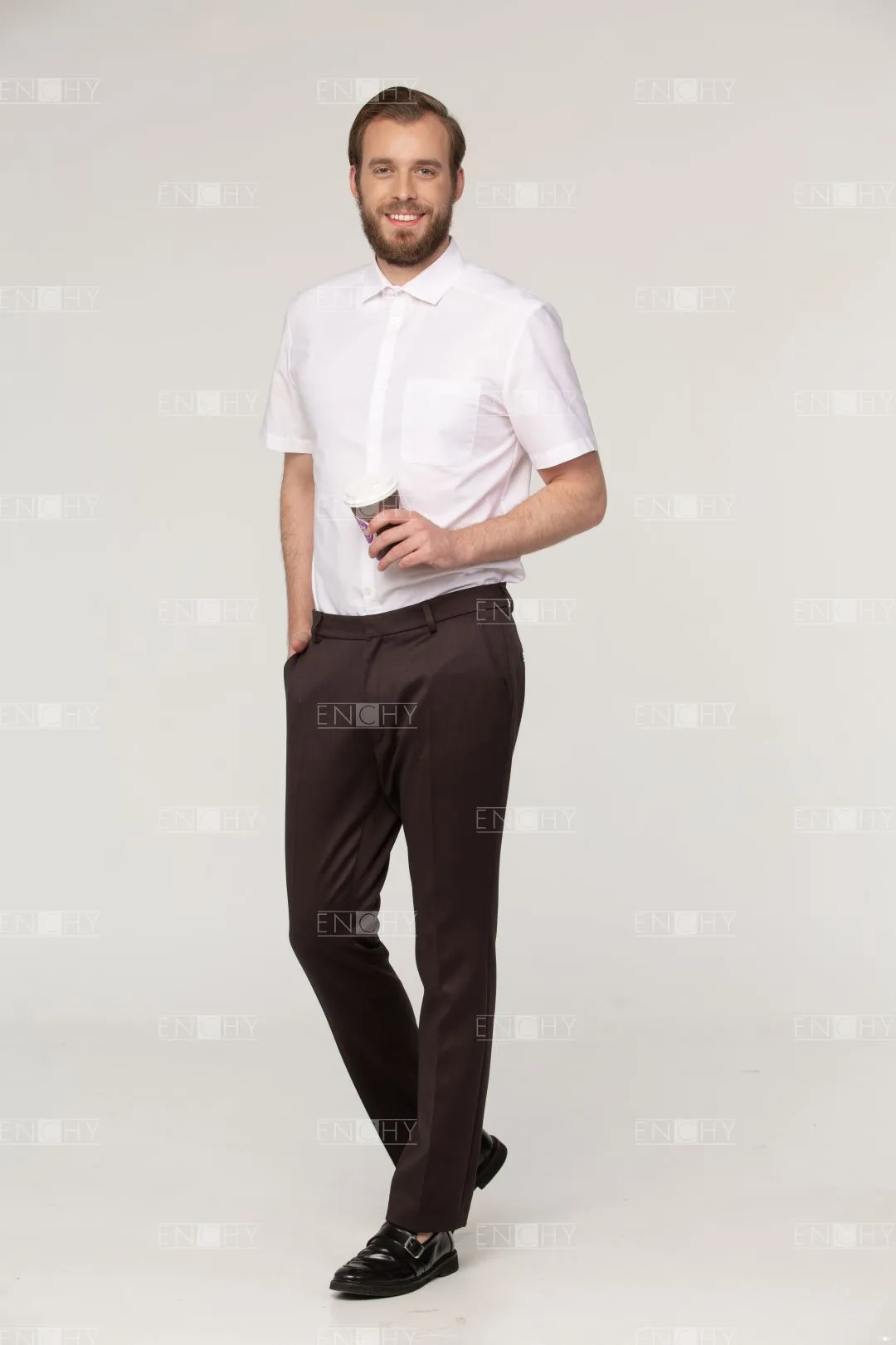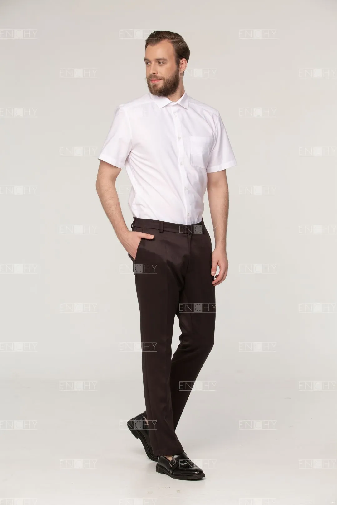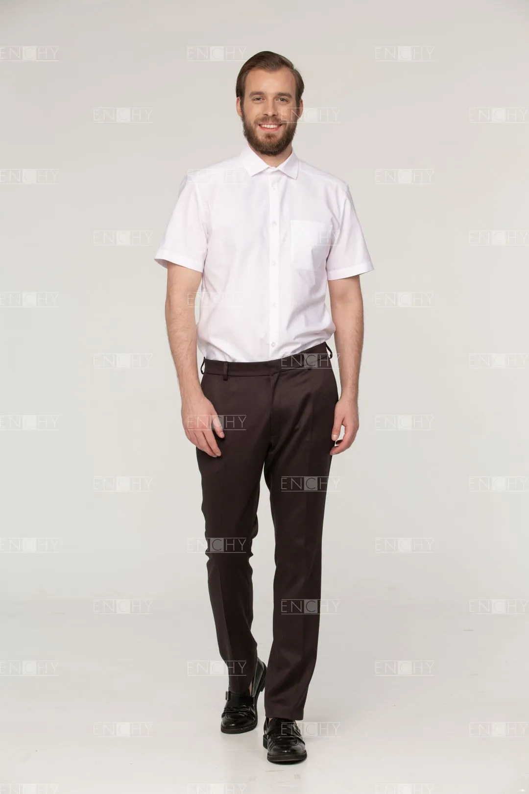 Классическая сорочка прямого силуэта, небольшого объема, с коротким рукавом, классическим воротником и застежкой на планку. На переде и спинке имеются кокетки. На груди накладной карман с округлыми концами.