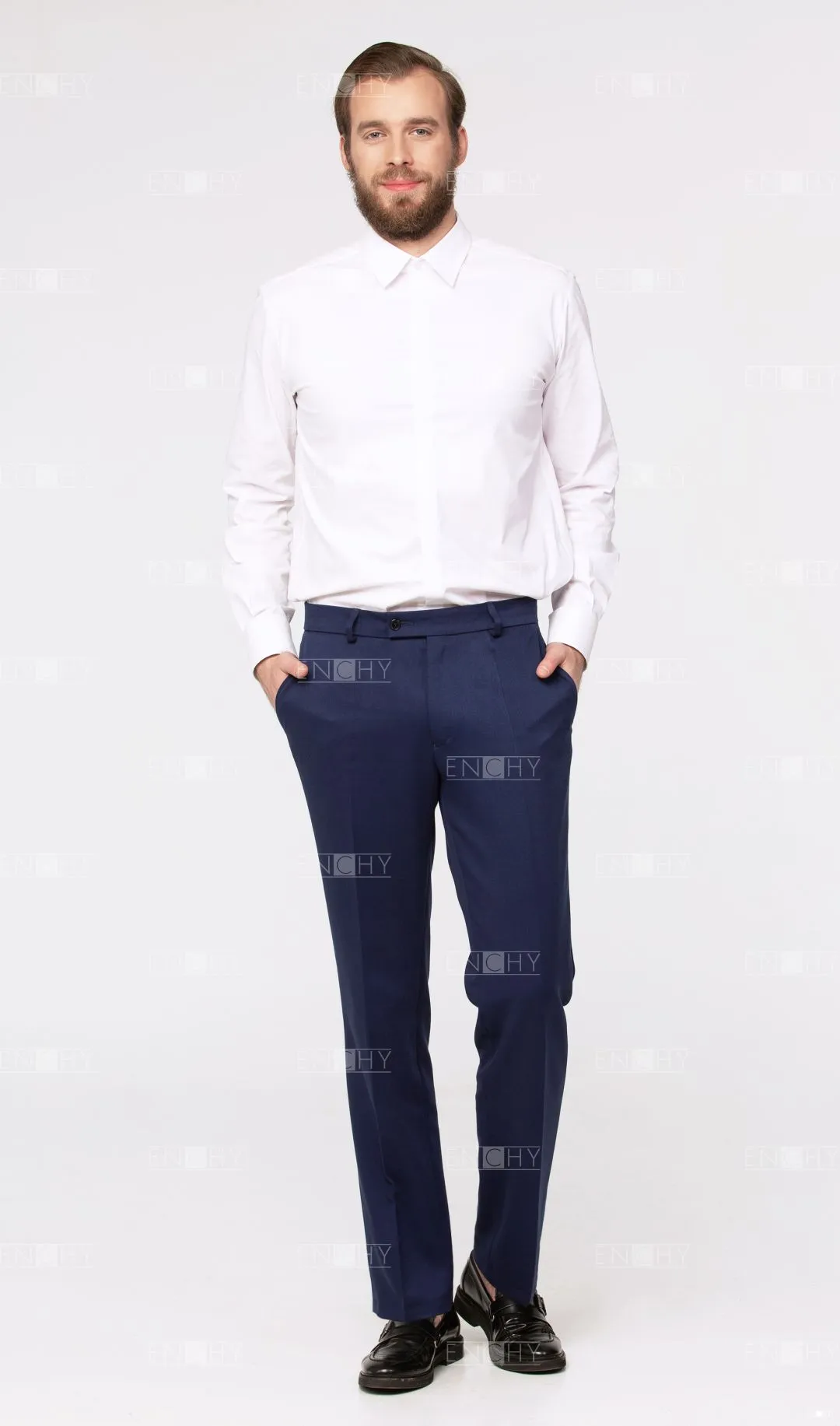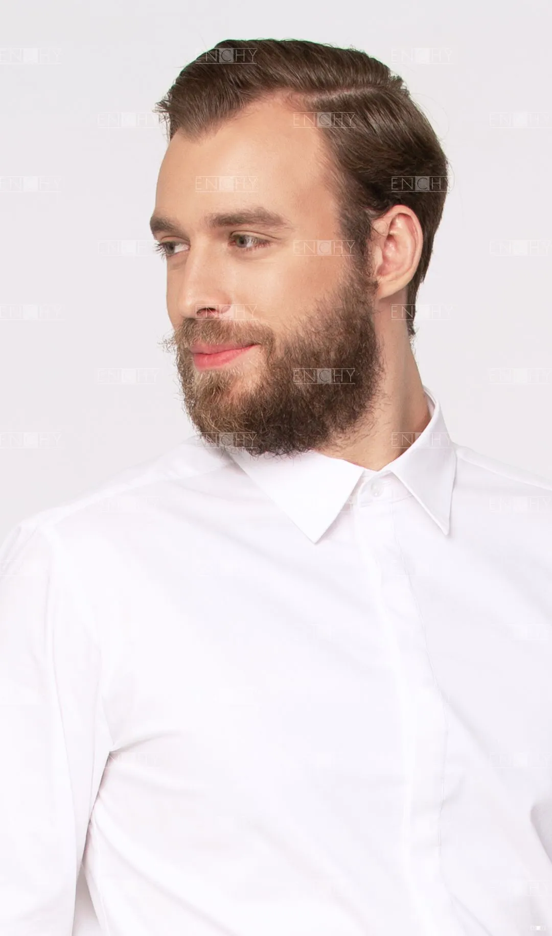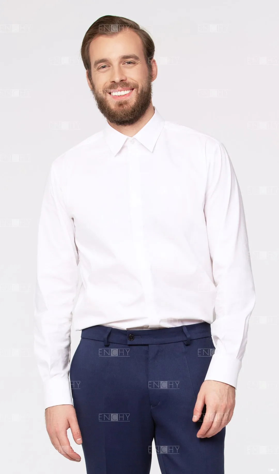 Сорочку классического прямого кроя отличает супатная, скрытая застежка, за счет которой планку можно выделить цветом. Воротник на стойке. Рубашечный рукав с манжетой. Сзади кокетка и 2 защипа для свободы движения.