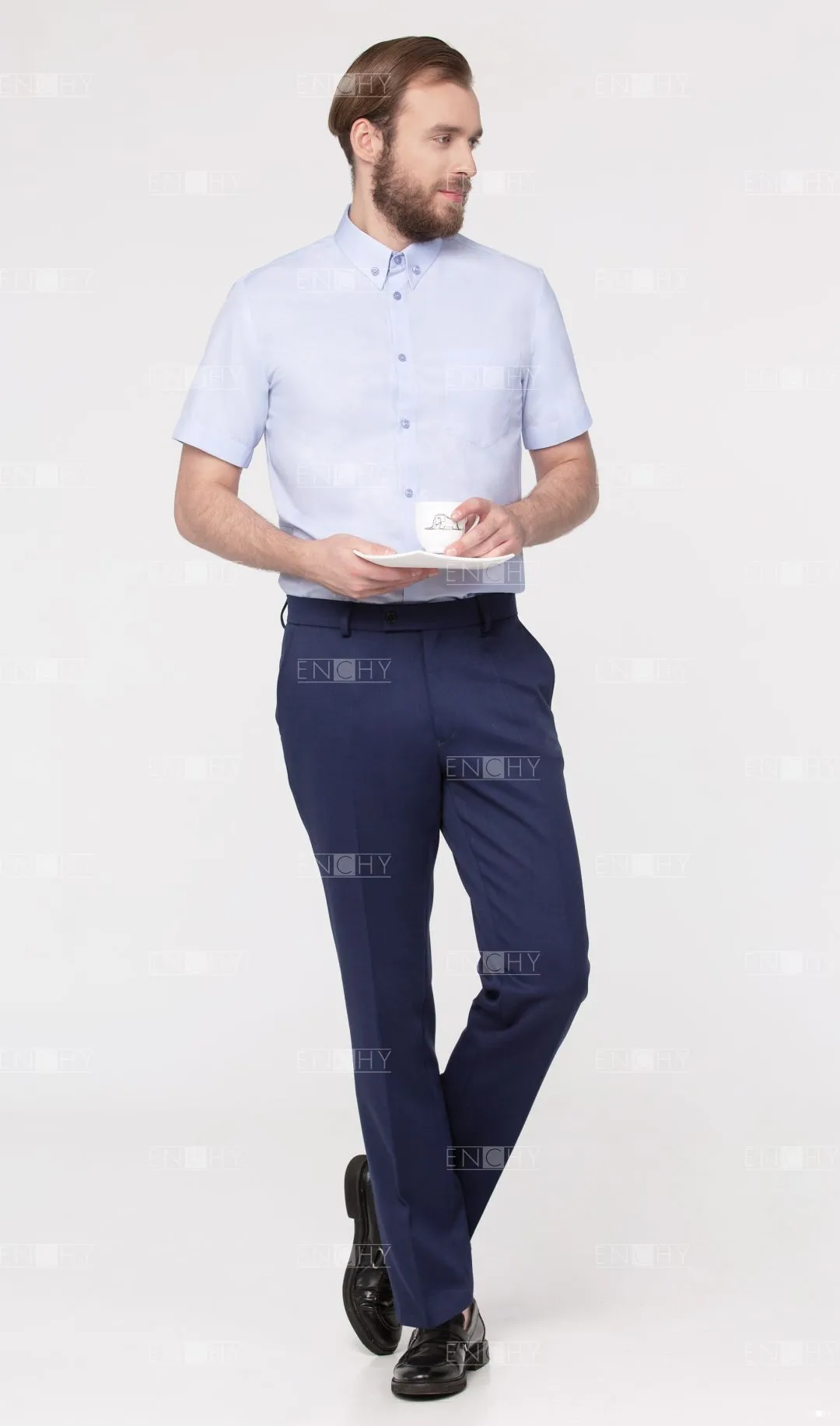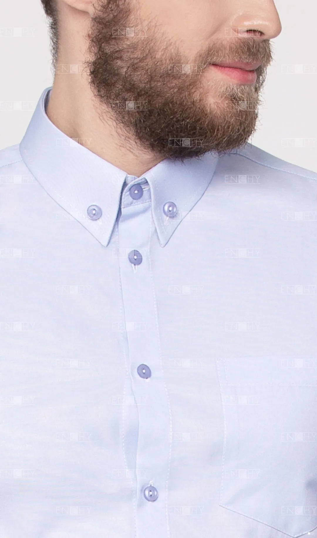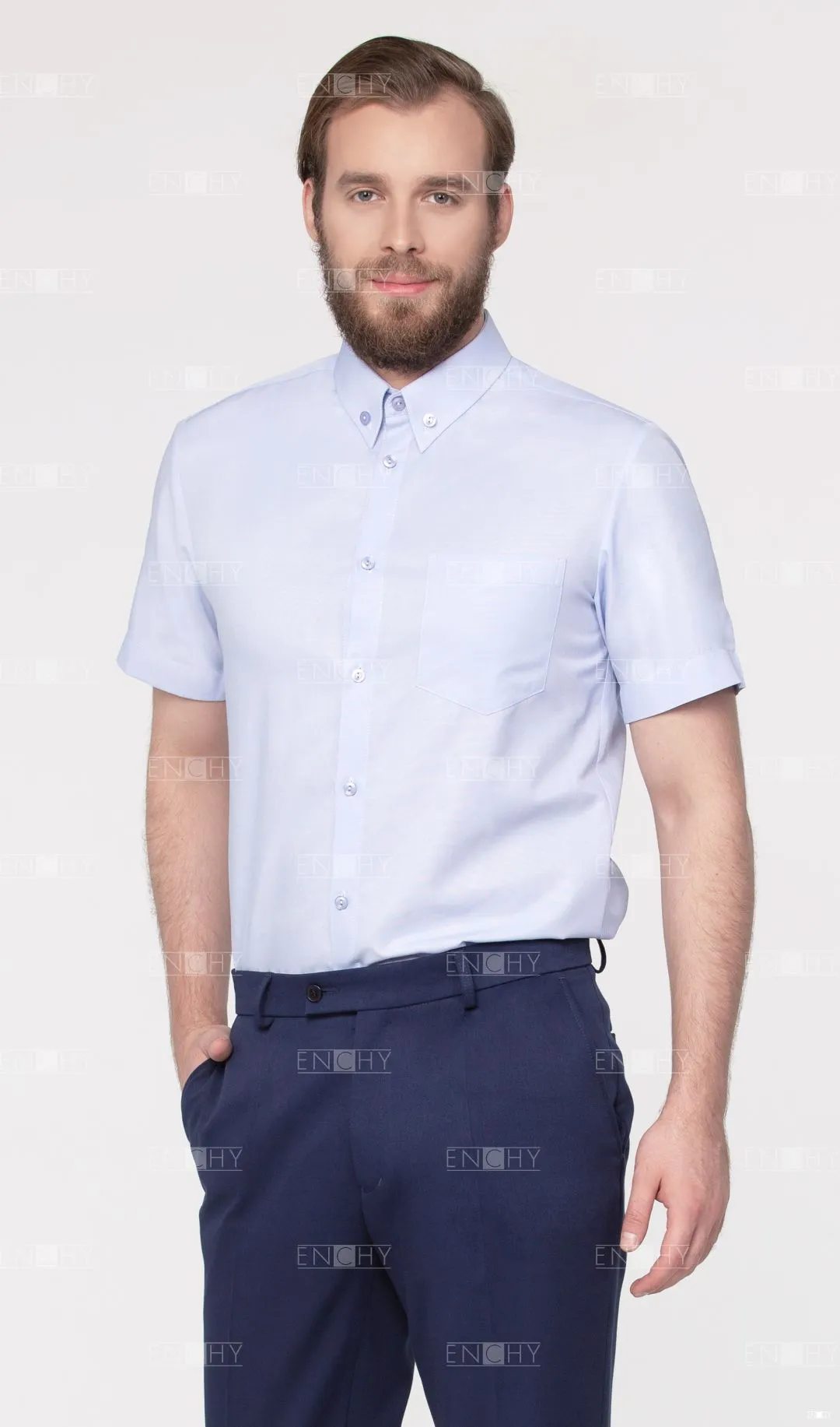 Сорочку классического прямого кроя отличает фигурный воротник на стойке, уголки которого пристегиваются на пуговички. Сорочка прямого силуэта, свободная, удобная, рукав со спущенной линией плеча. Сзади кокетка и 2 защипа для свободы движения. Спереди накладной карман.