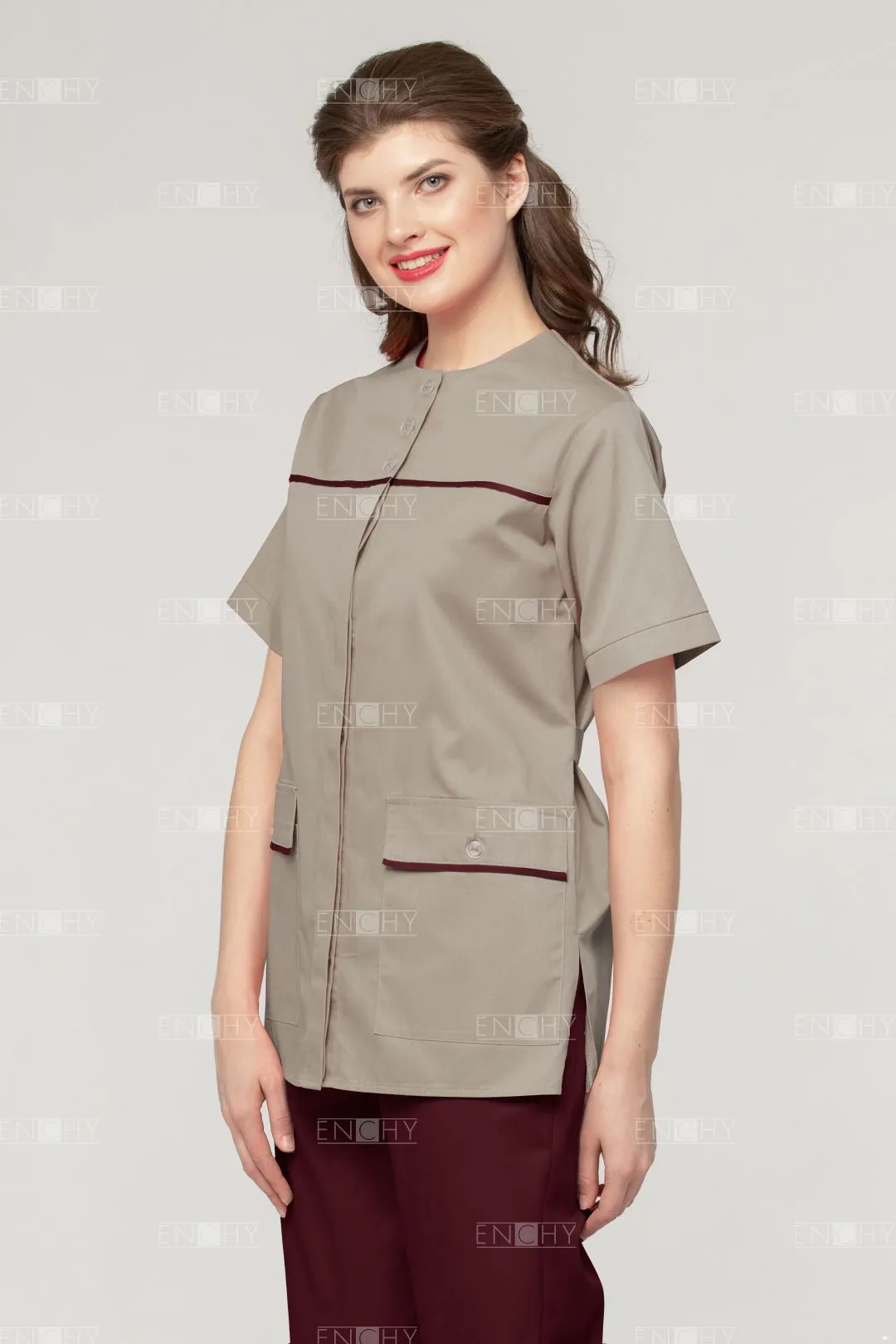Туника прямого кроя с накладными карманами.