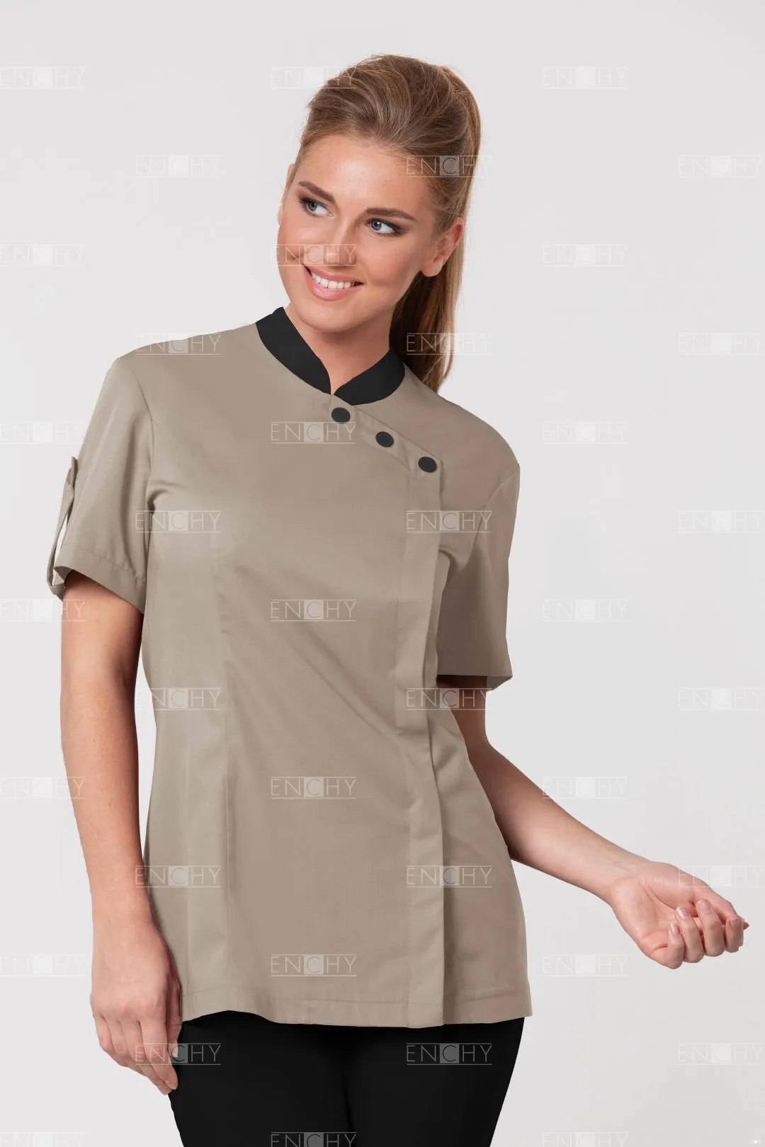 Оригинальная туника полуприлегающего силуэта с воротником-стойкой и смещенной супатной застежкой. Удобный укороченный рукав с декоративной патой. Тунику украшают 3 пуговицы на косой застежке.