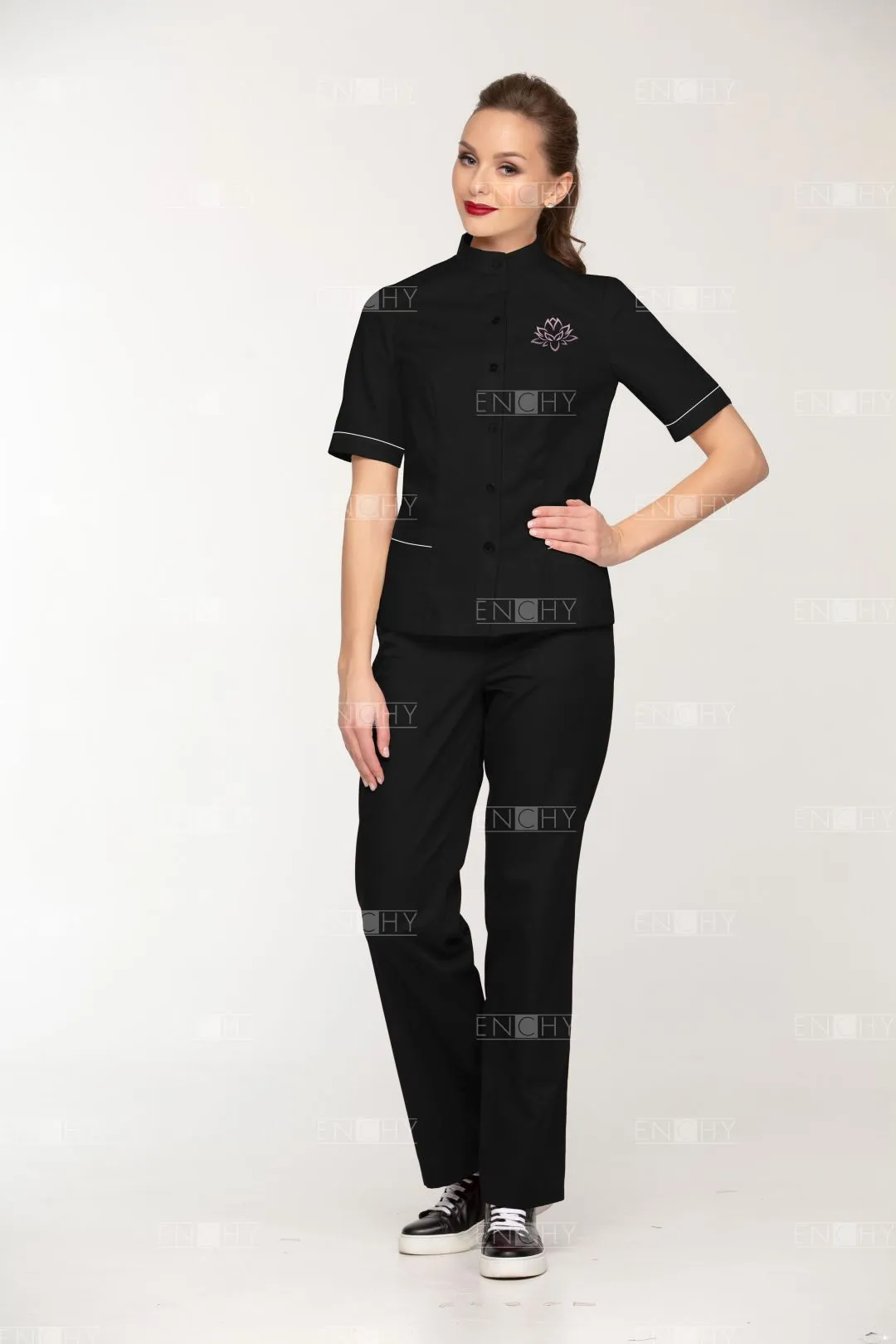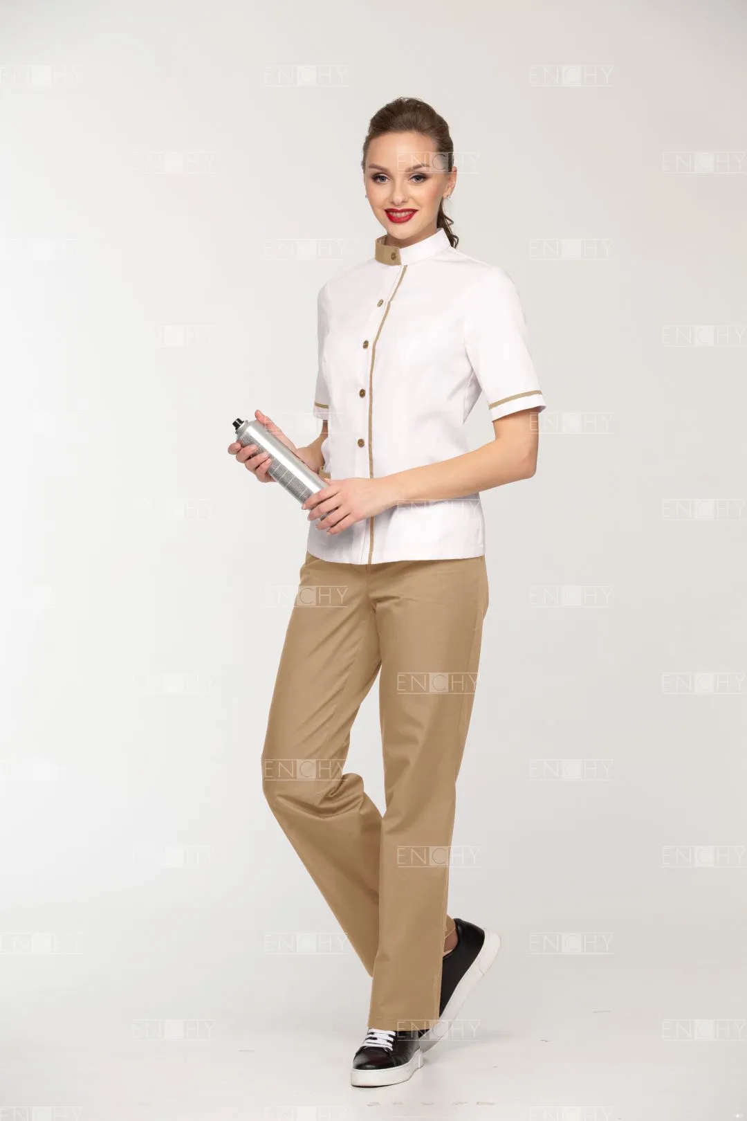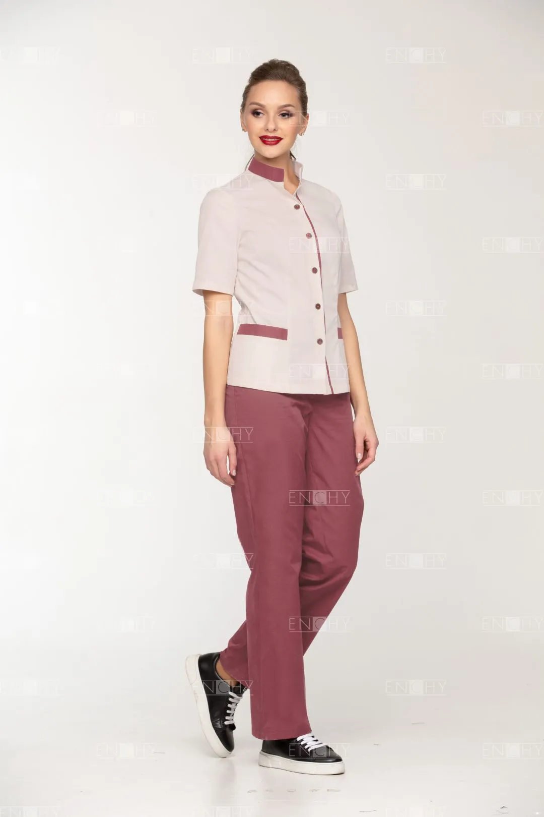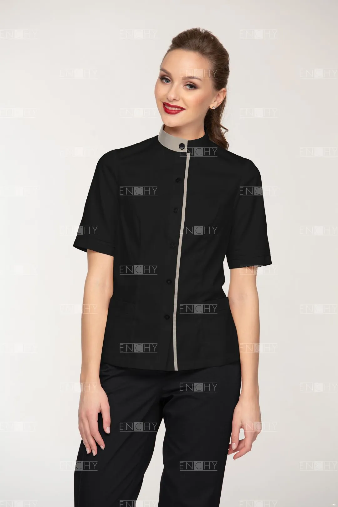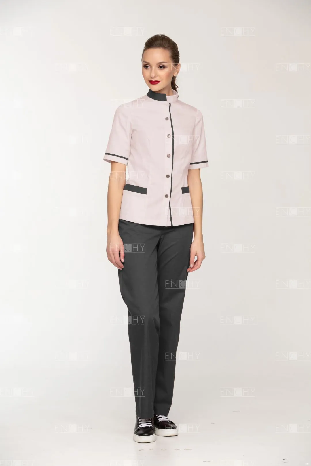 Полуприлегающая туника с коротким рукавом, с рельефами на переде и спинке, которые обеспечивают комфортную посадку. На переде два горизонтальных кармана с листочкой, планка и рукава декорированы кантом, воротник- стойка. Благодаря количеству декоративных деталей можно сделать униформу ярче и заметнее!