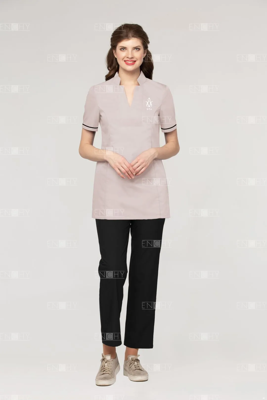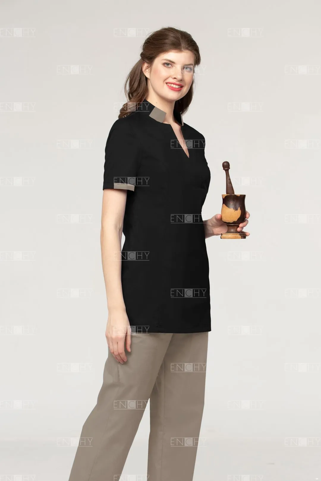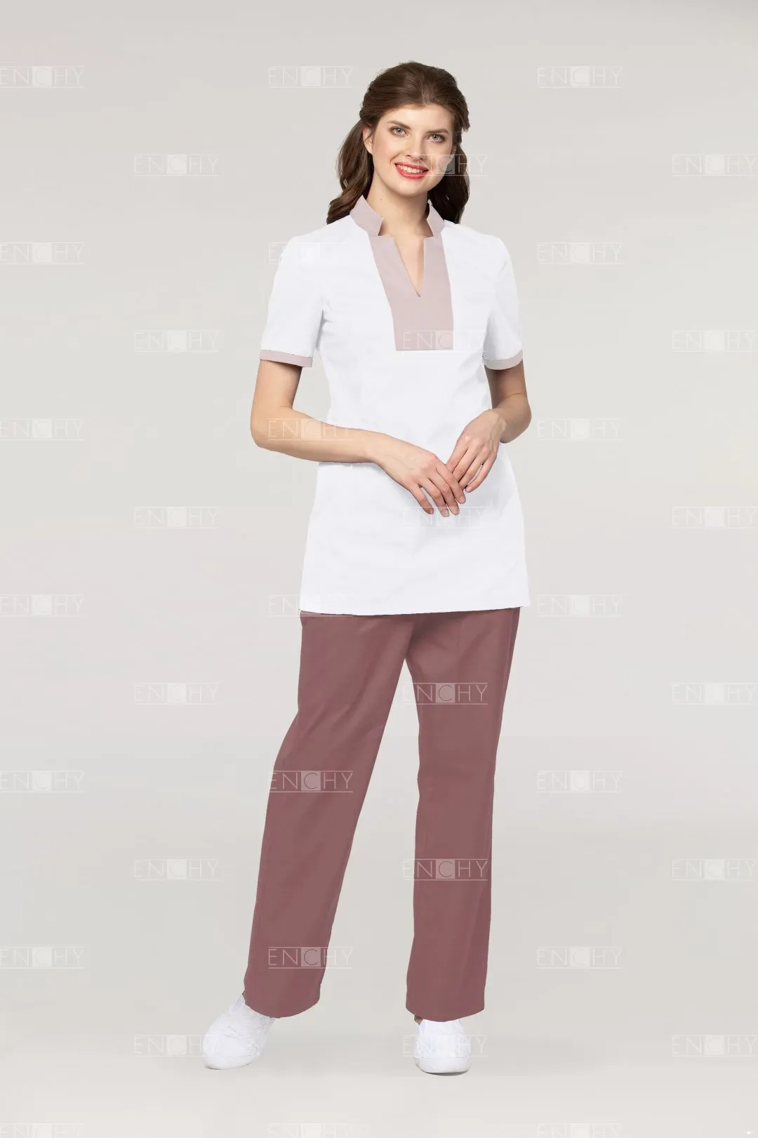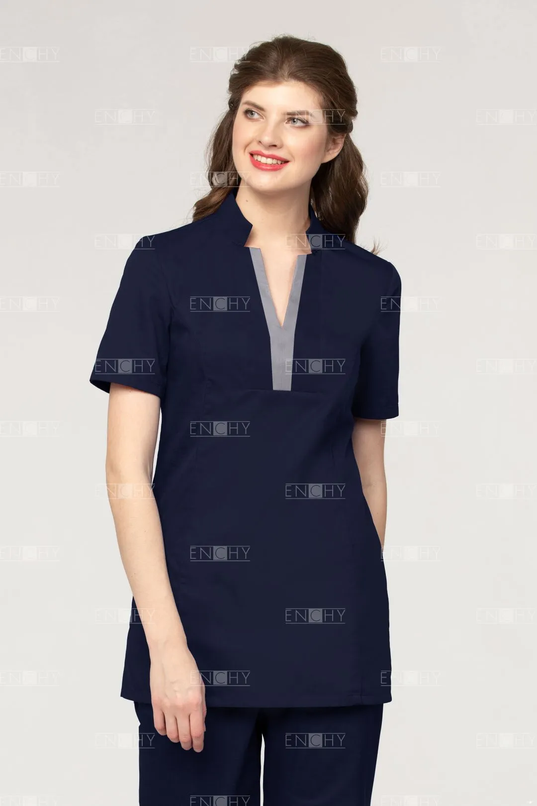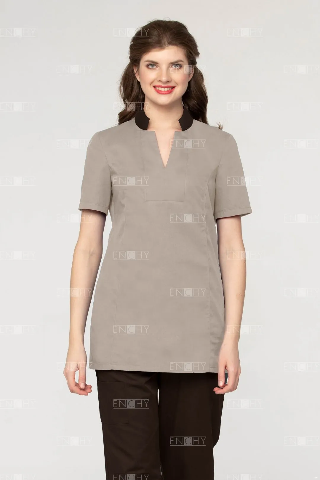 Полуприлегающая туника с необычным воротником - стойкой и коротким рукавом. Полуприлегающий удлиненный силуэт с рельефами на переде и спинке. На переде имеется фигурная кокетка у V-образного выреза.