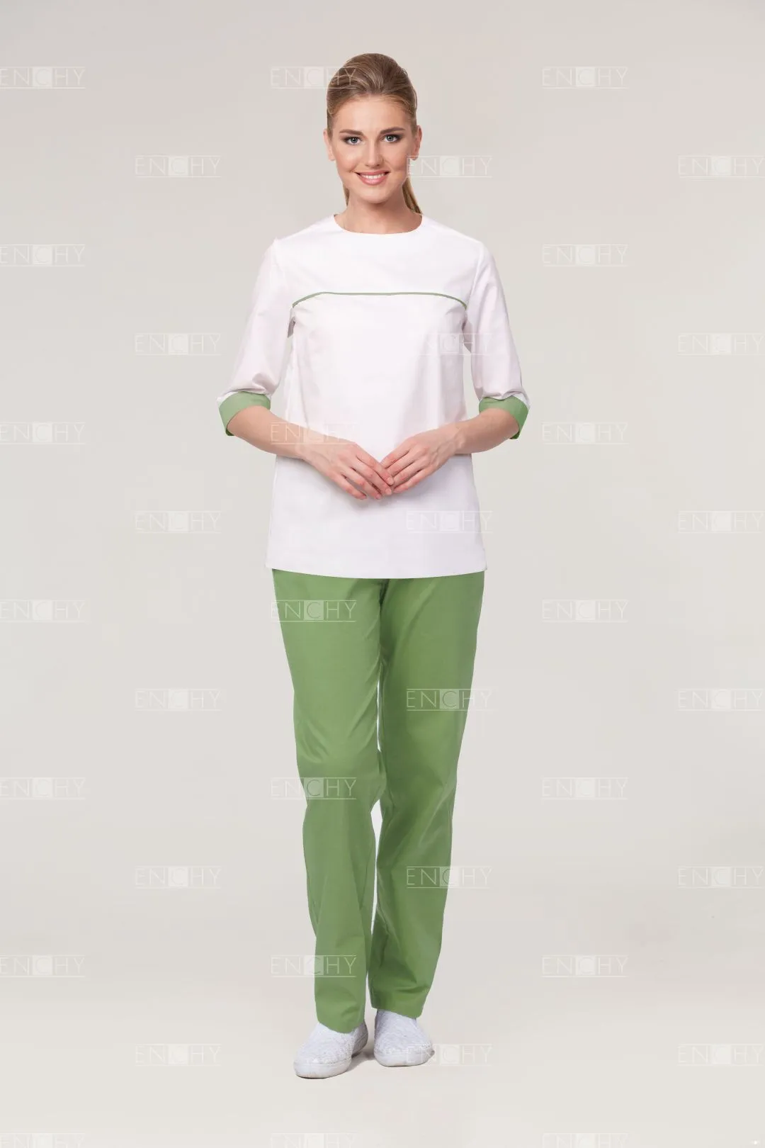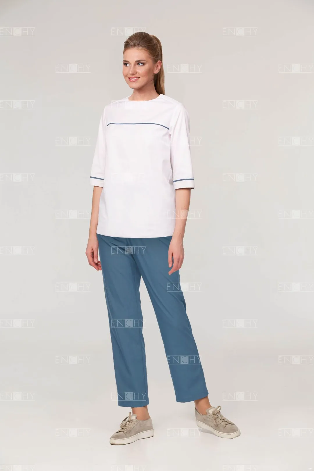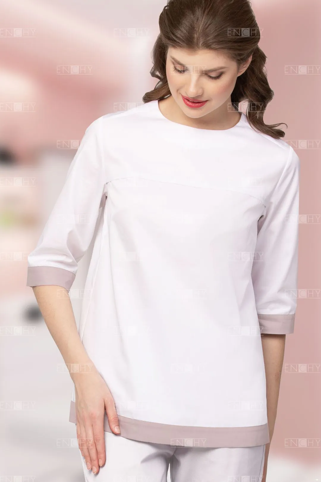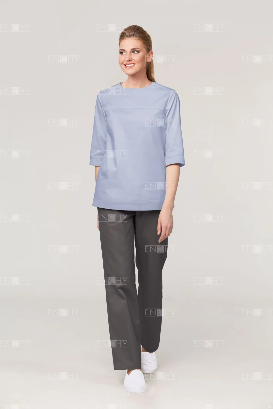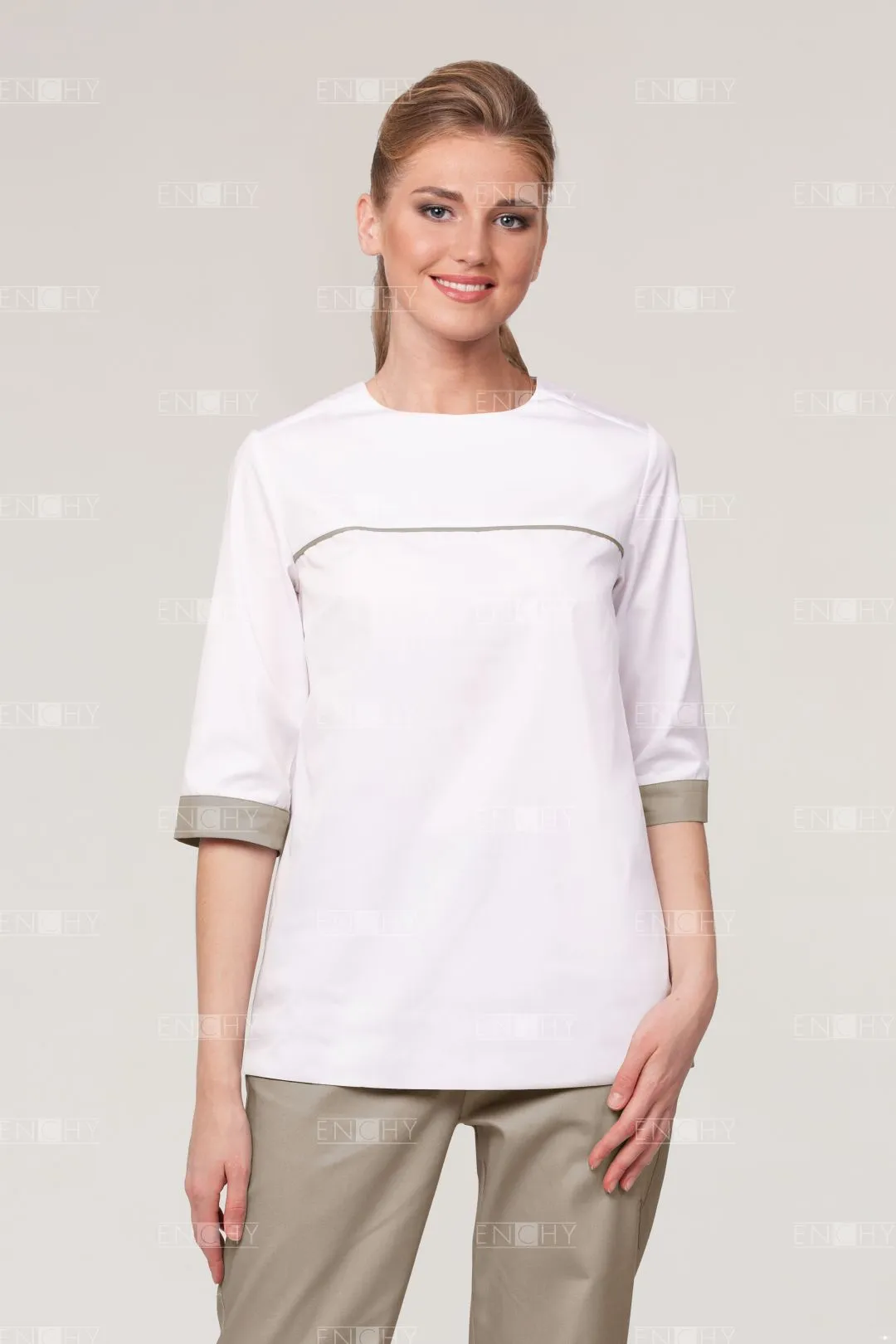 Свободная туника без излишеств. Рукав 3/4 с притачными манжетами, на переде и спинке притачные кокетки. На спинке имеется застежка на петли и пуговицы. Туника может быть как однотонной и минималистичной, так и с разными вариантами отделки: канты, манжеты, кокетки, вышивки могут быть в тон вашего фирменного цвета!