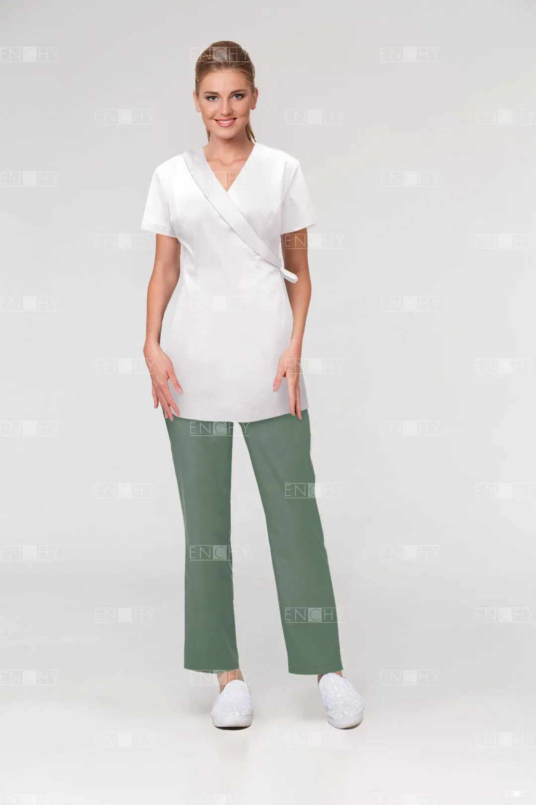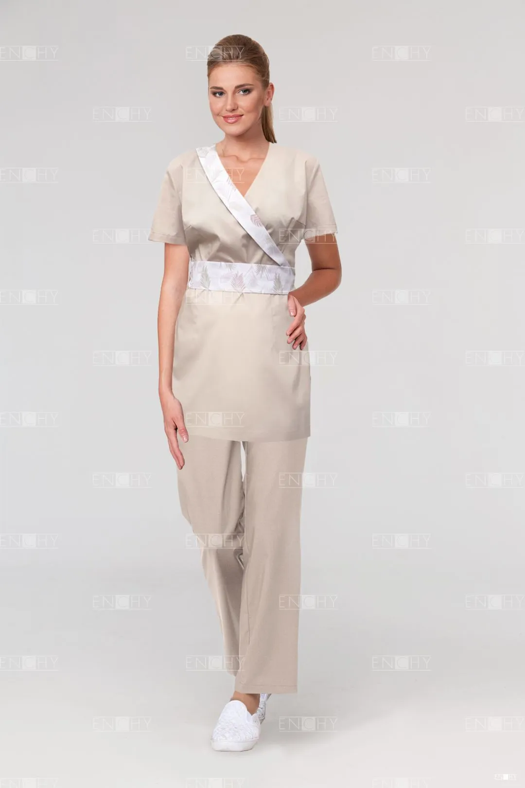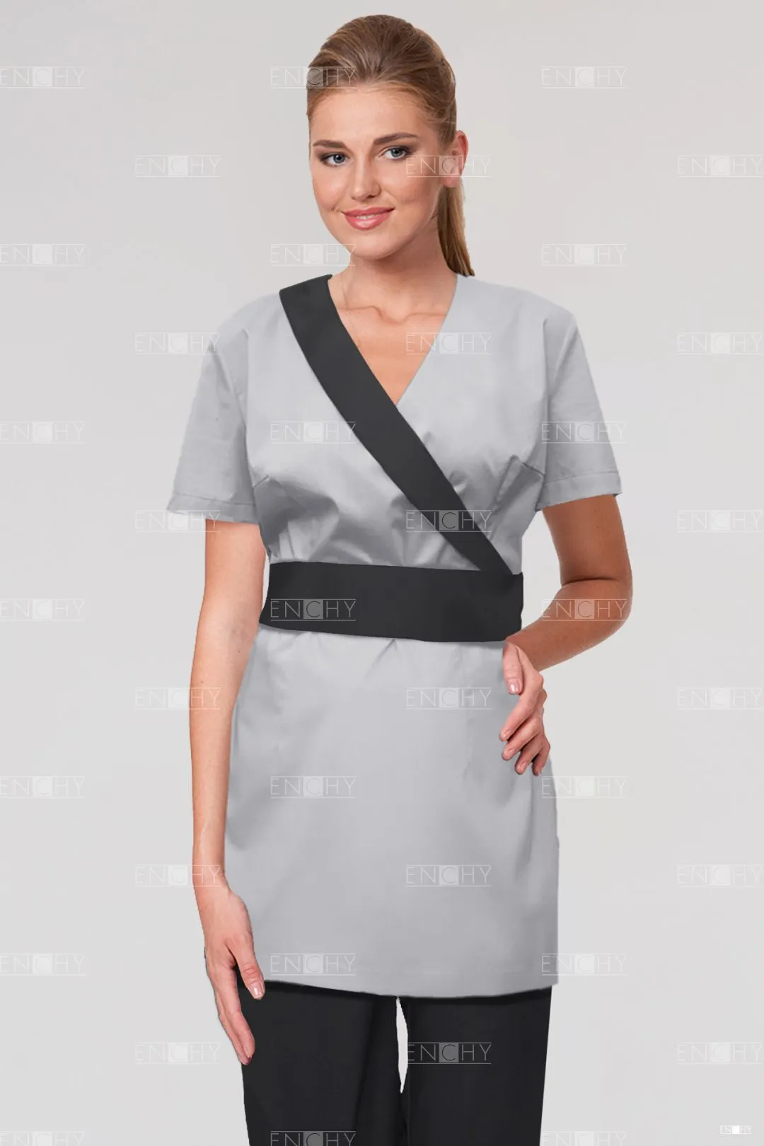 Стильная женская туника на запах со съемным широким эластичным поясом с застежкой на пуговицы и петли. Туника полуприлегающего силуэта, с вытачками*, линия талии чуть выше естественного положения. Особенность туники: разрез на рукаве и асимметрично оформленная лацканом** горловина. Туника застегивается на завязки на уровне линии талии.