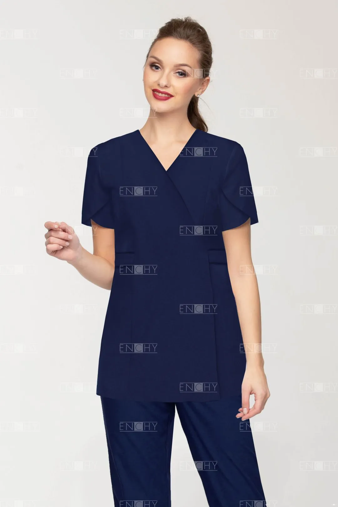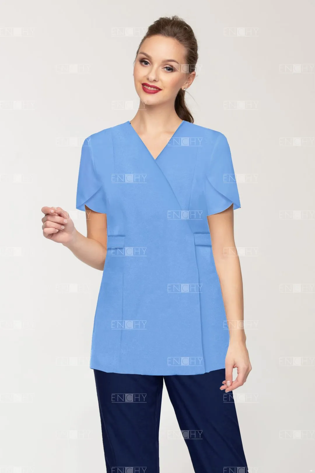 Универсальная туника на запах, завязывающаяся на спинке. Изюминой модели является очаровательный рукав "лепесток", который не стесняет движения. Туника удлиненного силуэта, в боковых швах имеются небольшие разрезы.