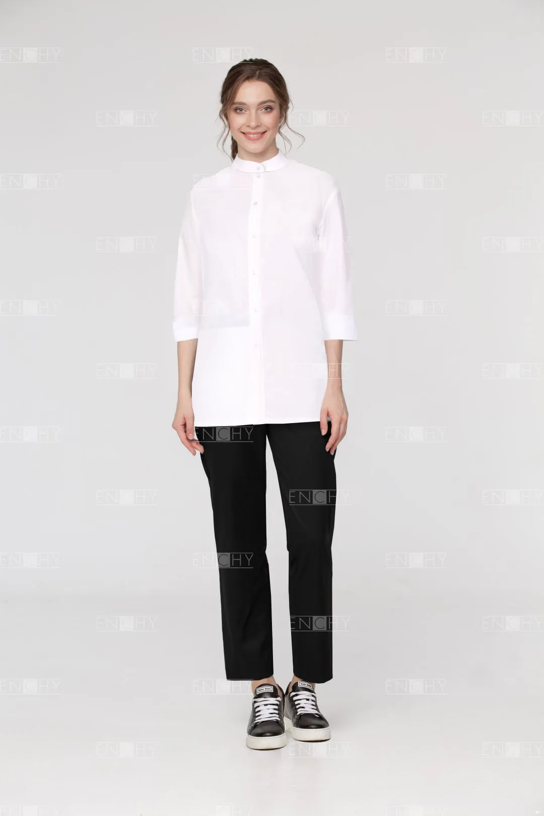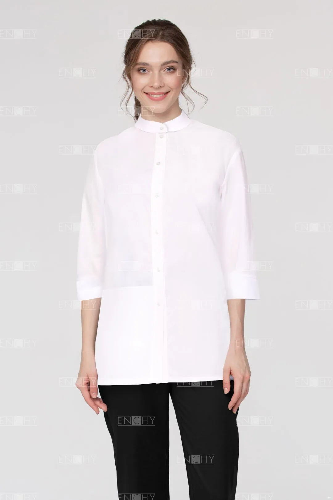 Over-size туника-рубашка с воротником стойкой и рукавом 3/4. Туника с необычным карманом по ширине полочки. Модель свободного удлиненного силуэта с небольшими разрезами.