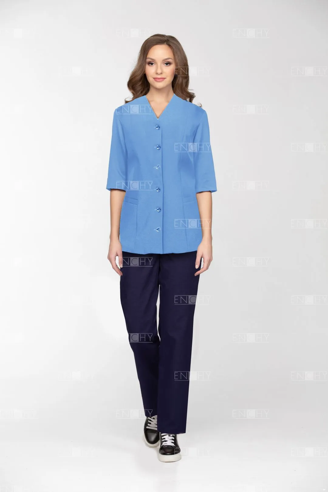 Простая и практичная туника с V-образной горловиной, рукавом 3/4 и застежкой на пуговицы. На переде туника имеет два боковых кармана, на спинке регулирующий хлястик на полукольцах. Для лучшей посадки по фигуре туника имеет вертикальные рельефы.