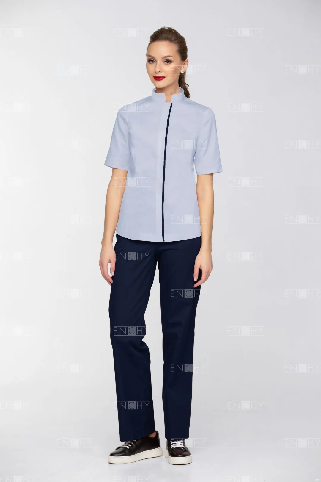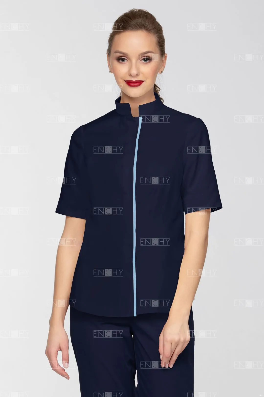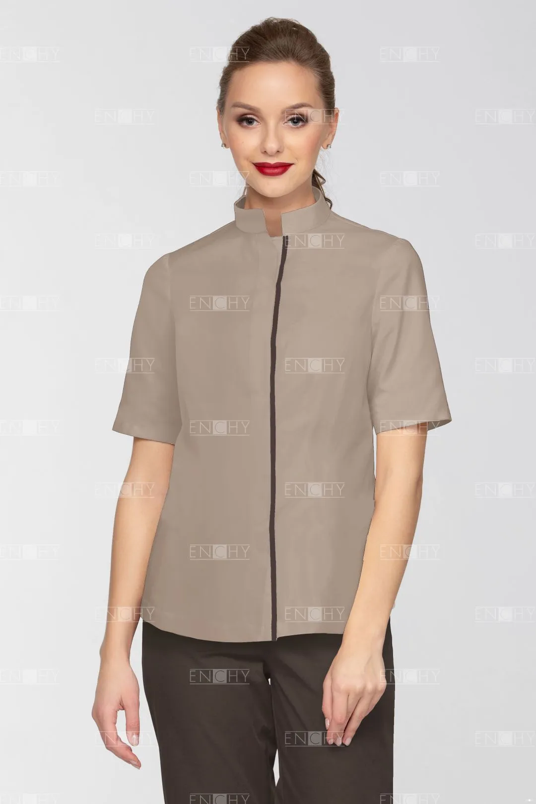 Универсальная туника с застежкой на молнии! Туника с небольшим прилеганием в области талии, с разрезами в боковых швах, коротким рукавом, воротником стойкой. Молния "спрятана" за планку, которую можно сделать с отделкой по всей длине. Еще одна особенность модели- складка в среднем шве спинки, которая делает работу более комфортной.