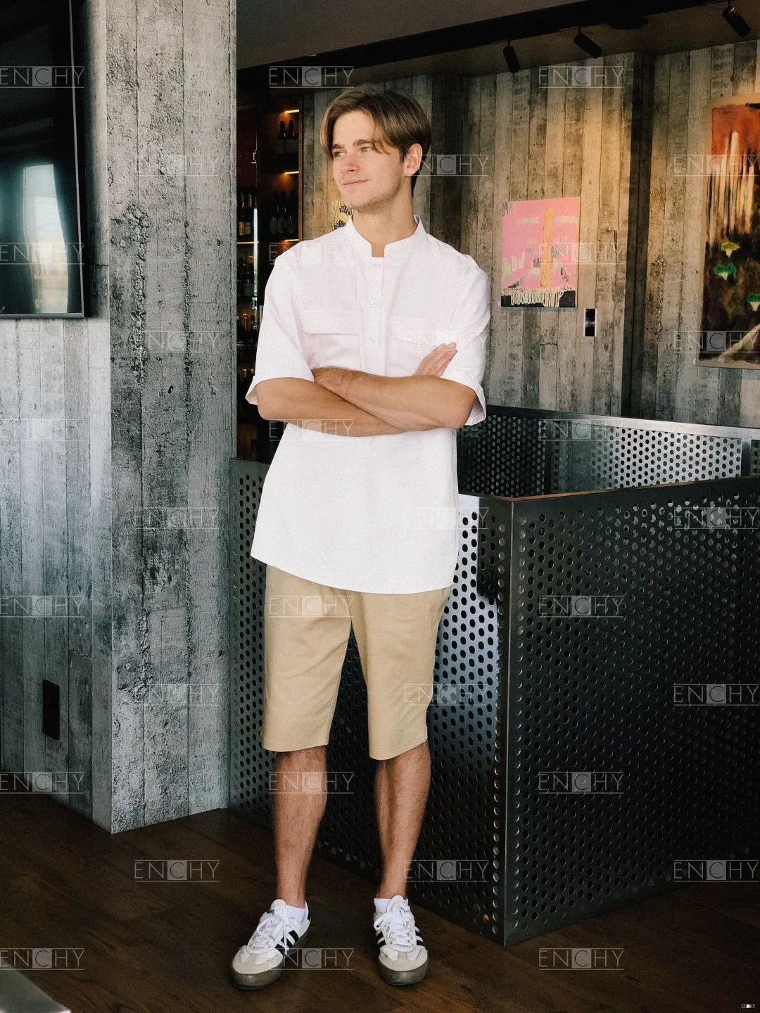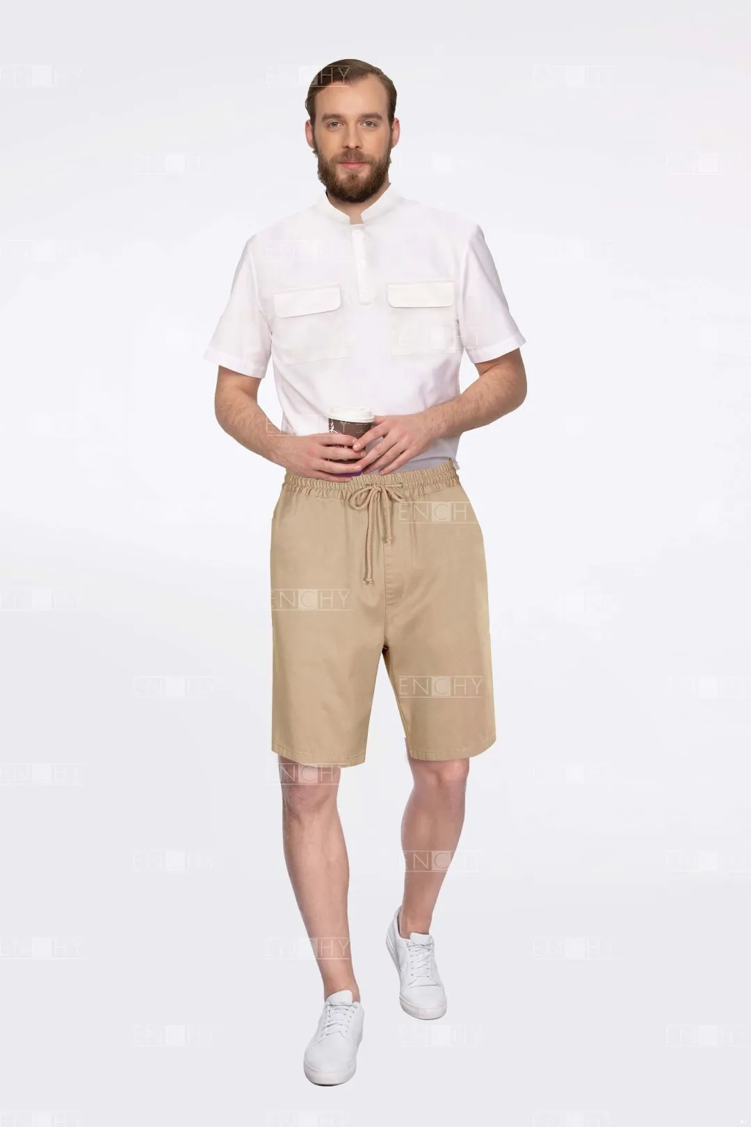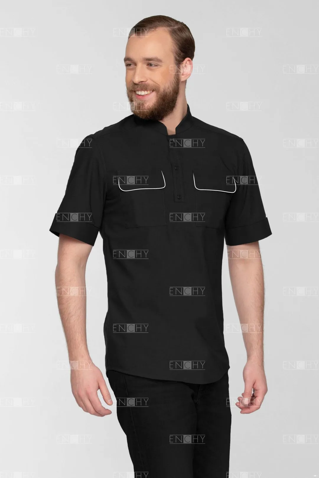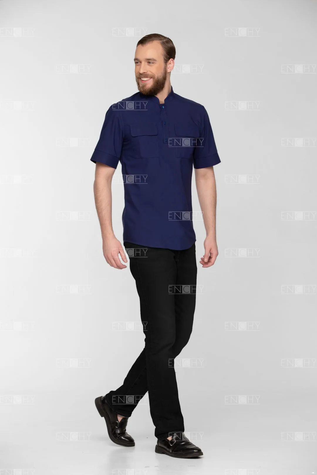 Актуальная мужская туника с коротким рукавом с отложными манжетами. Туника достаточно свободного кроя, с застежкой на планку, красивым минималистичным воротником-стойкой и нагрудными карманами с клапанами, которые можно сделать из отделочной ткани.