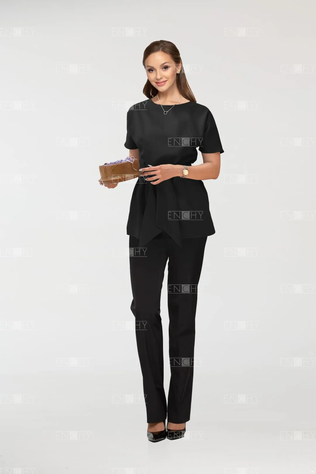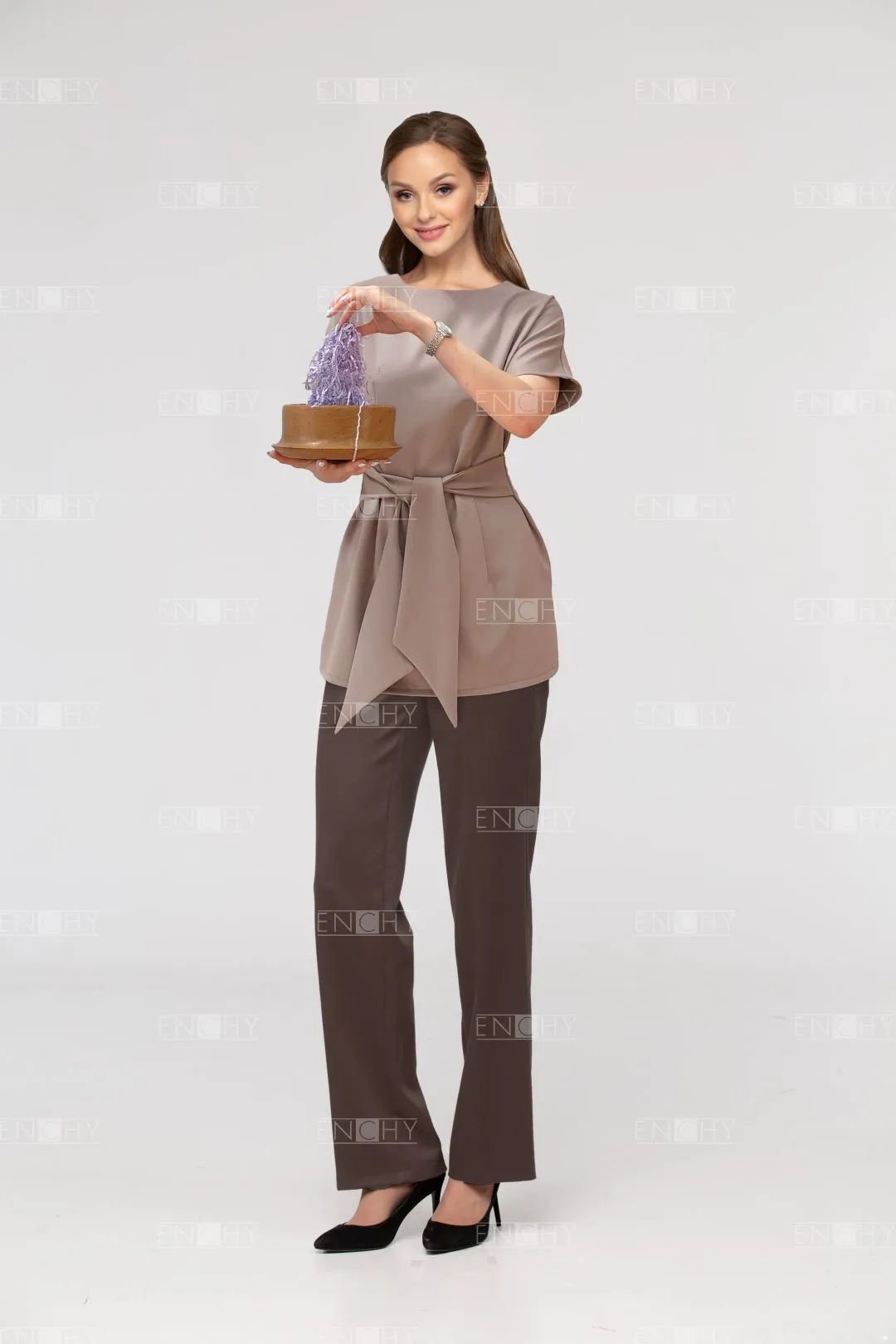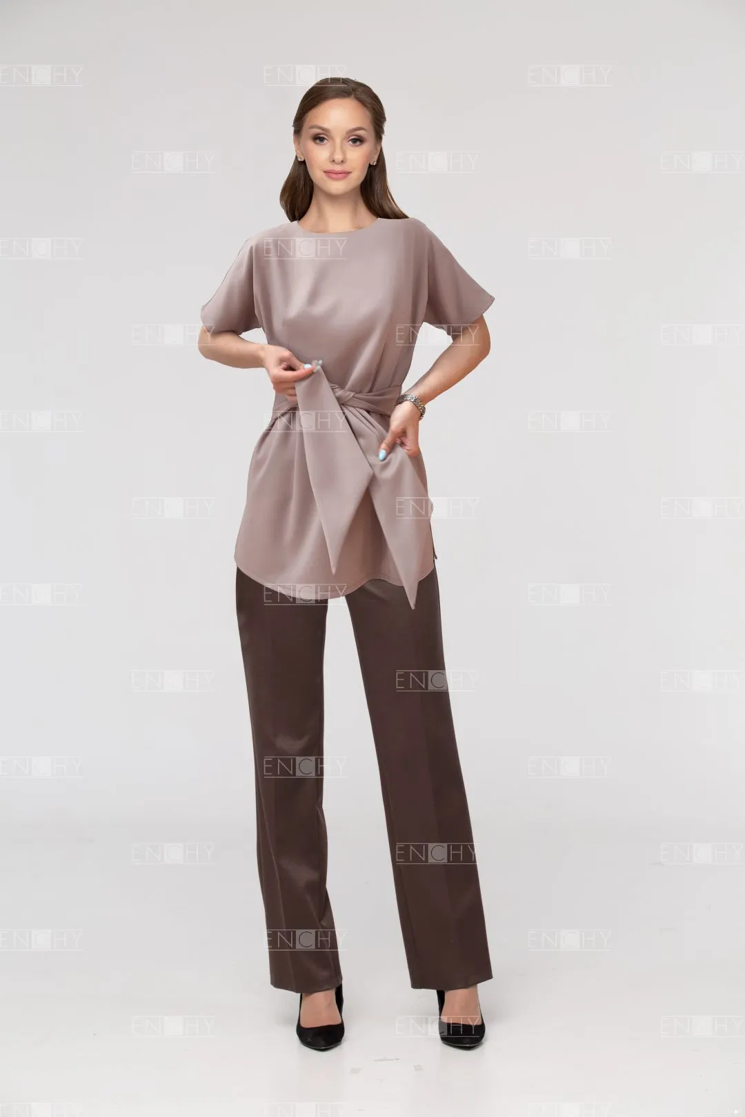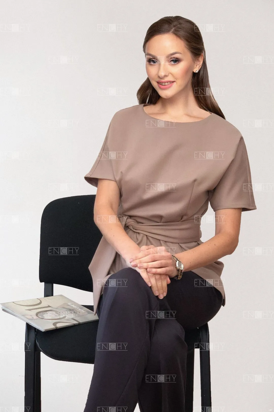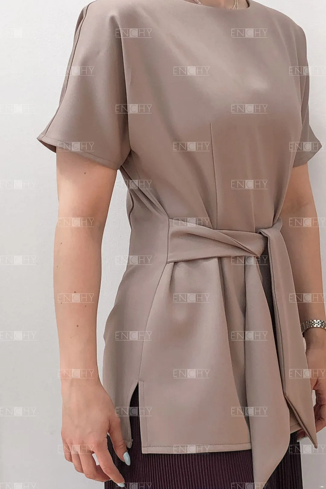 Актуальность тунике придает пояс, который можно завязывать как на переде, так и на спинке. Короткий цельнокроенный рукав, разрезы в боковых швах, широкий вырез горловины создают минималистичный внешний вид и комфорт в носке. Туника имеет застежку на потайную тесьму-молнию в среднем шве спинки.